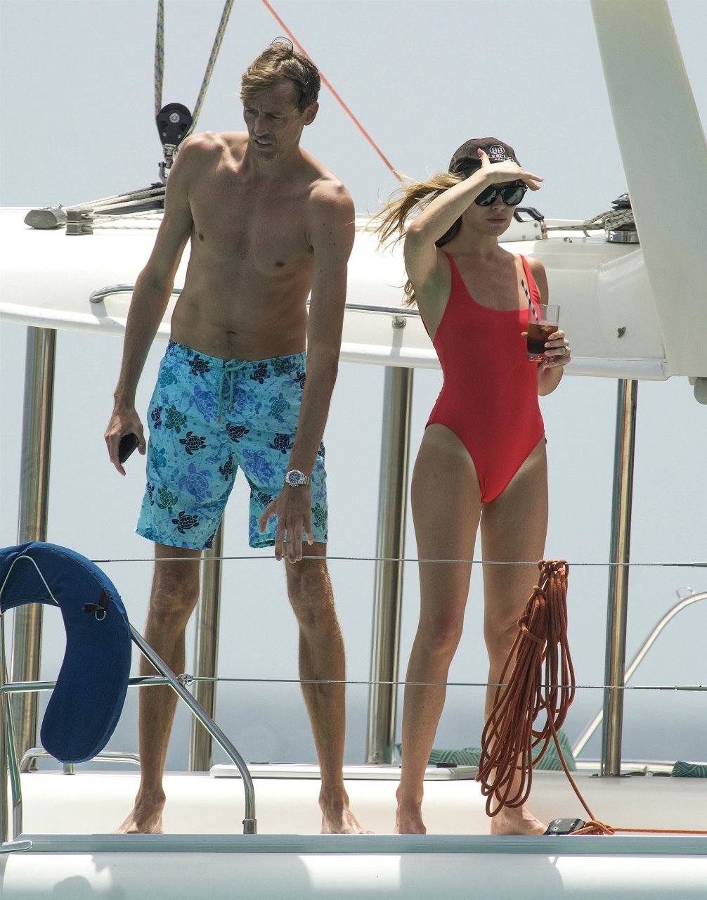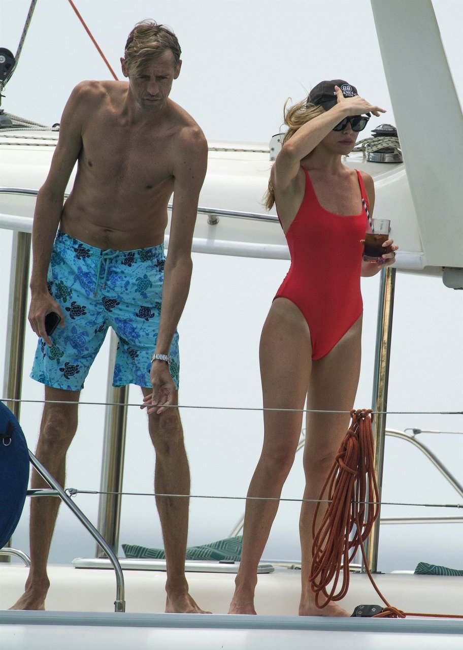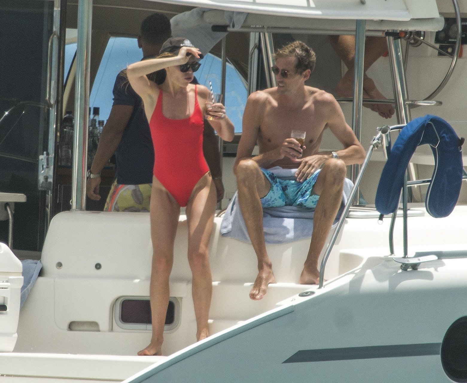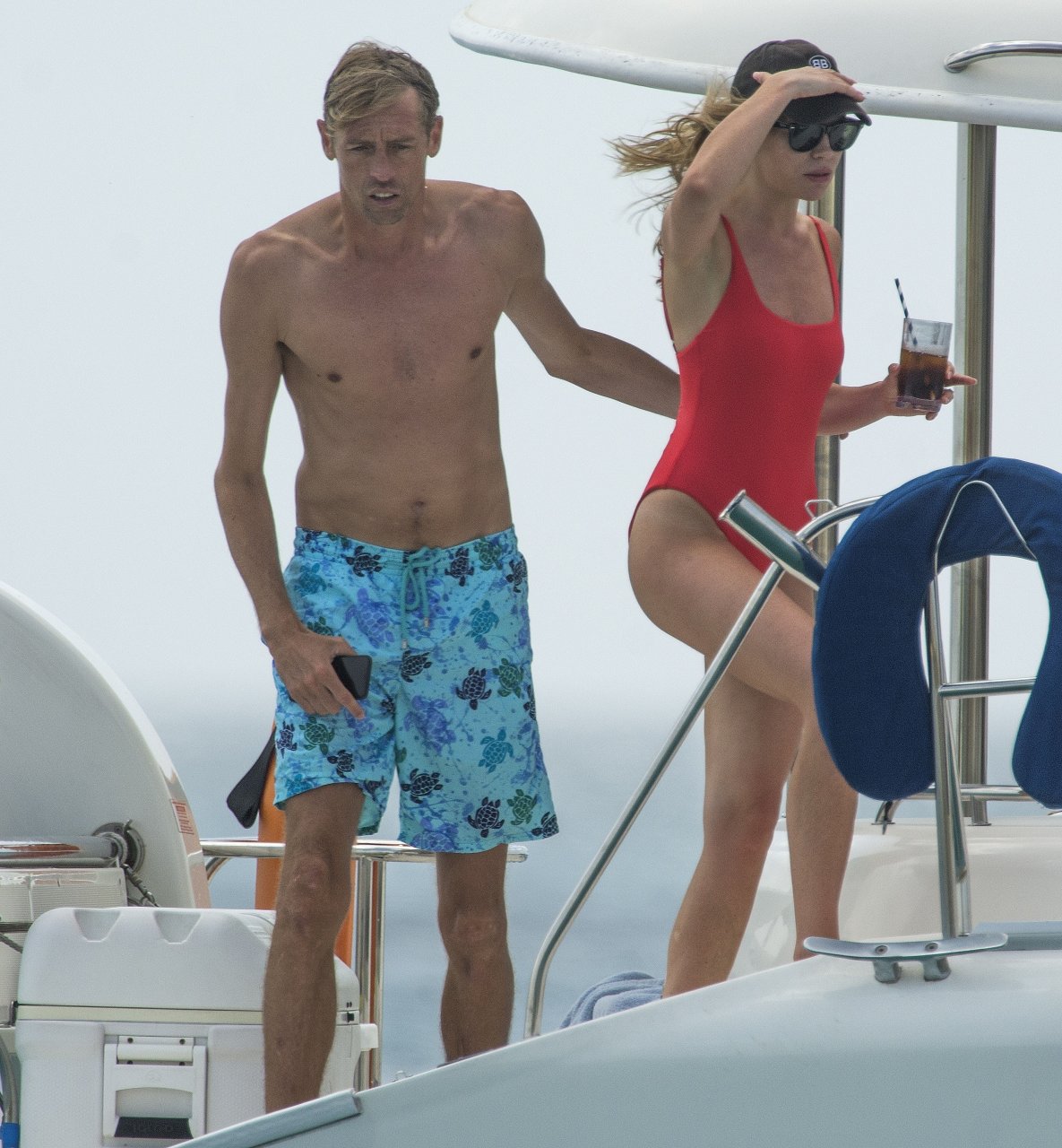 El futbolista británico Peter Crouch y su esposa modelo, Abbey Clancy, fueron vistos en un catamarán en Barbados. La impresionante rubia llevaba un traje de baño rojo de una pieza, mostrando sus piernas sexys, pequeños pechos y diminuto trasero.