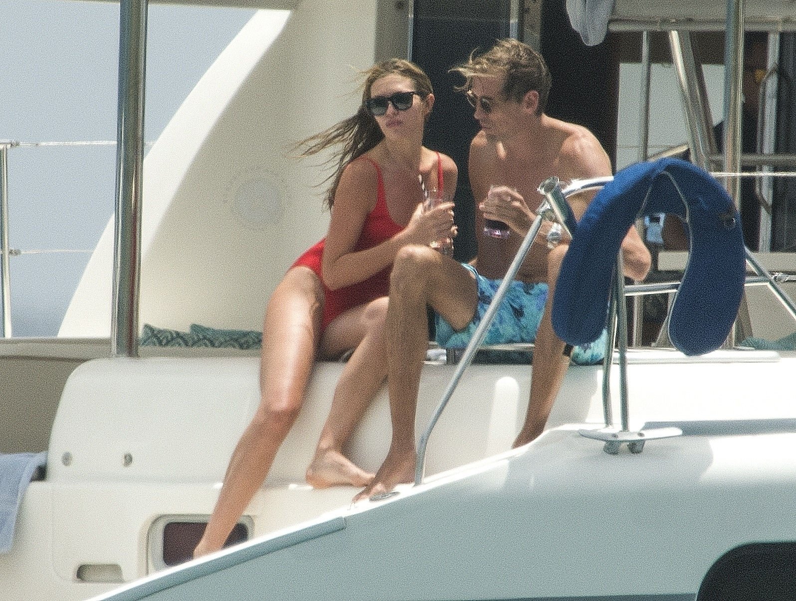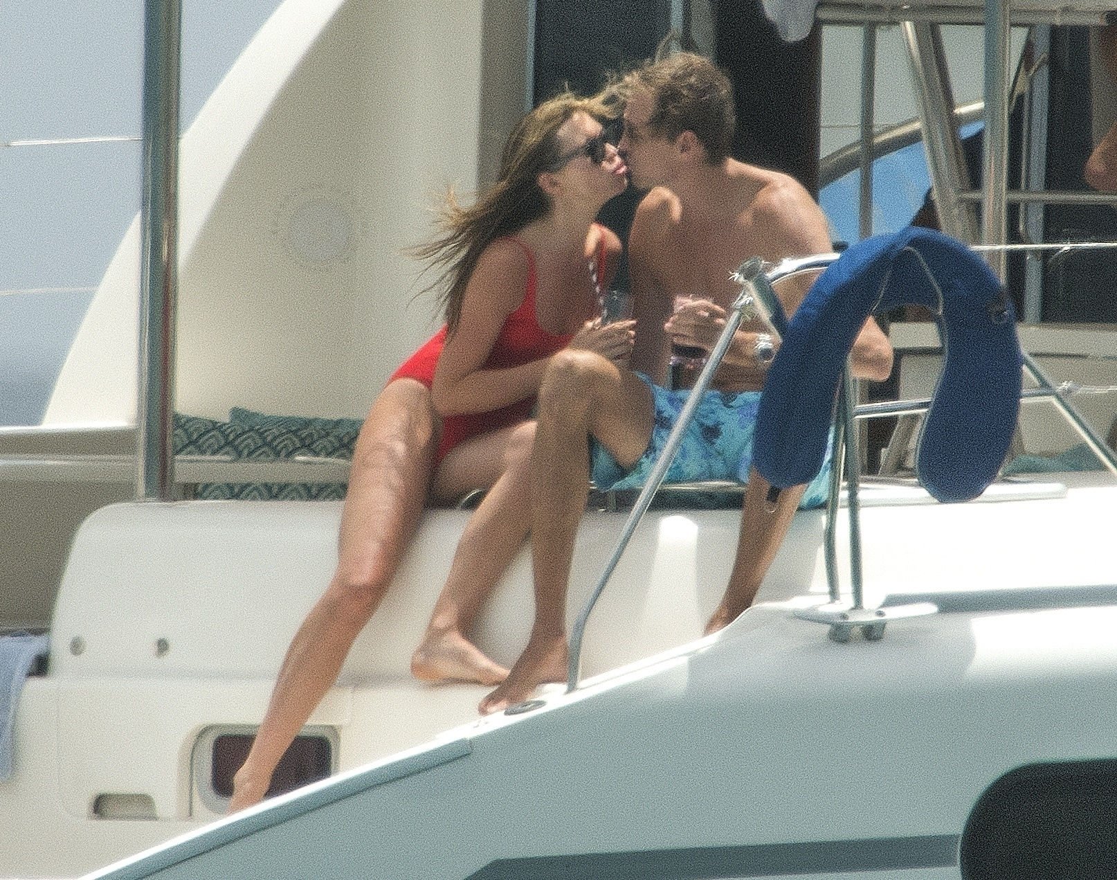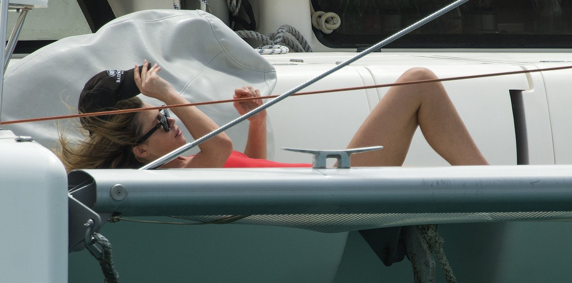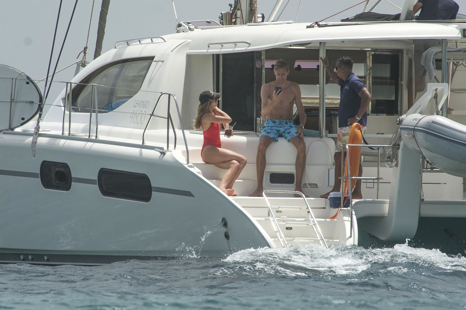 El futbolista británico Peter Crouch y su esposa modelo, Abbey Clancy, fueron vistos en un catamarán en Barbados. La impresionante rubia llevaba un traje de baño rojo de una pieza, mostrando sus piernas sexys, pequeños pechos y diminuto trasero.
