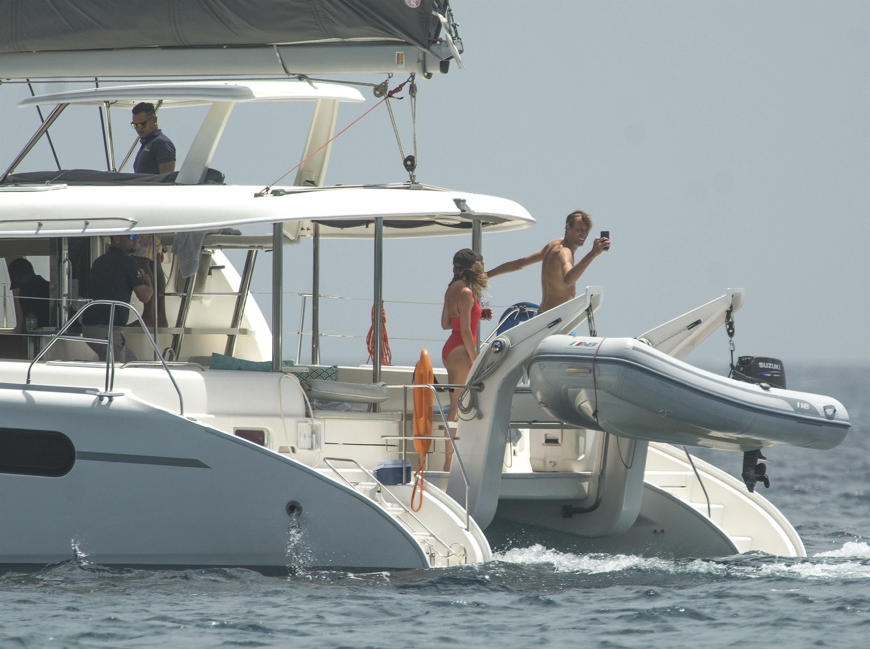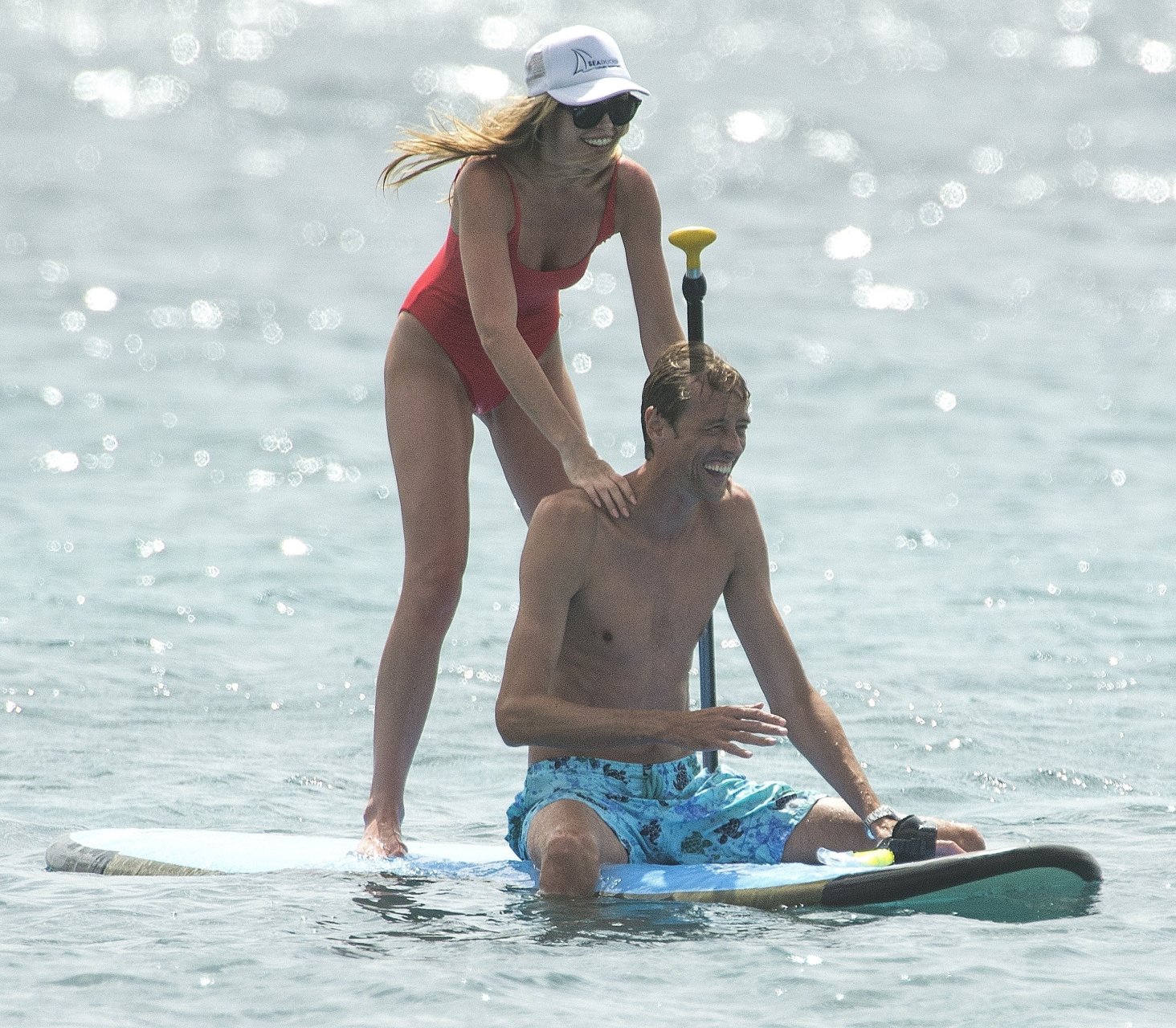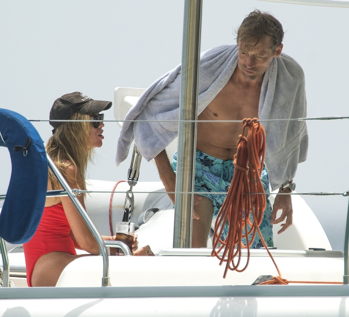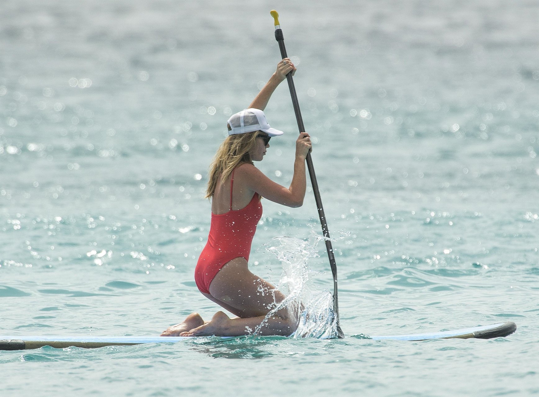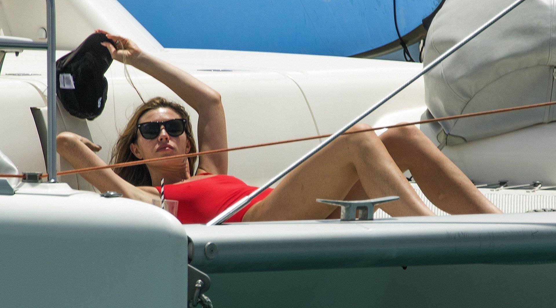 El futbolista británico Peter Crouch y su esposa modelo, Abbey Clancy, fueron vistos en un catamarán en Barbados. La impresionante rubia llevaba un traje de baño rojo de una pieza, mostrando sus piernas sexys, pequeños pechos y diminuto trasero.