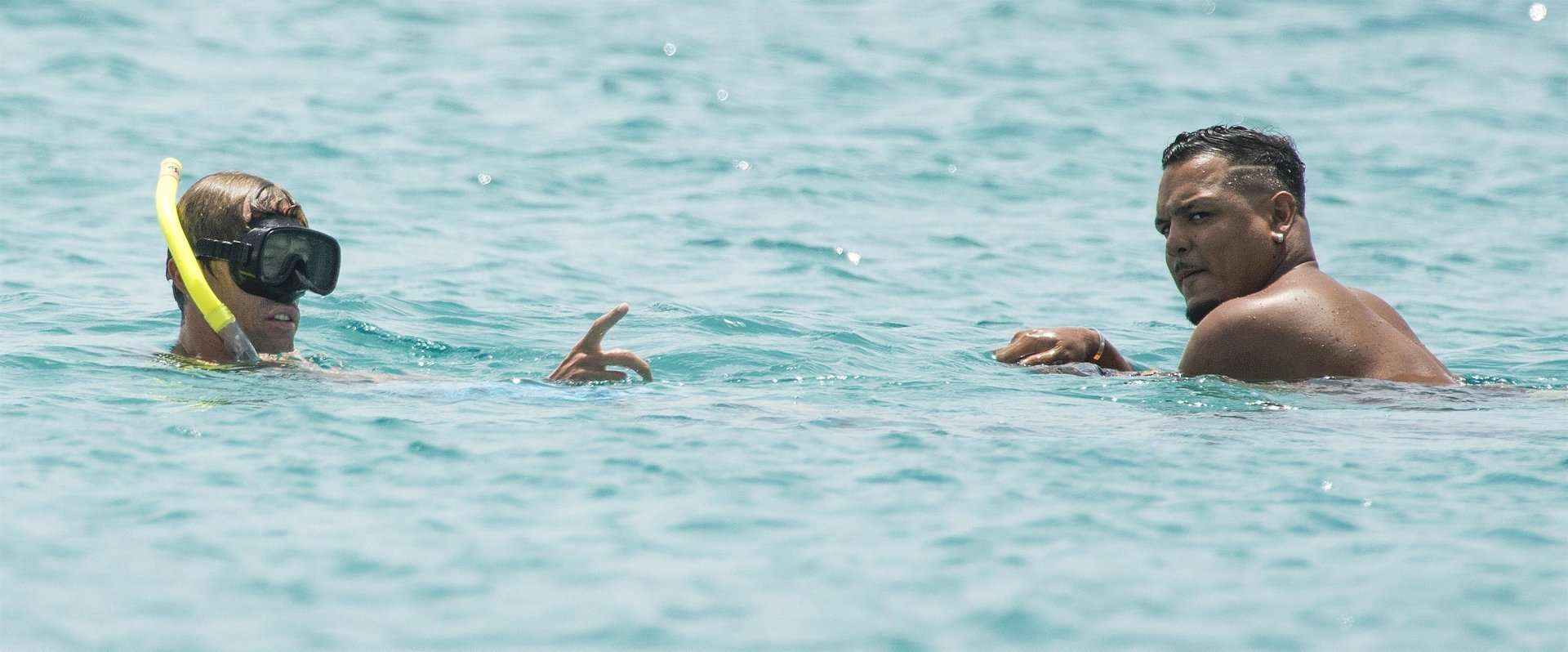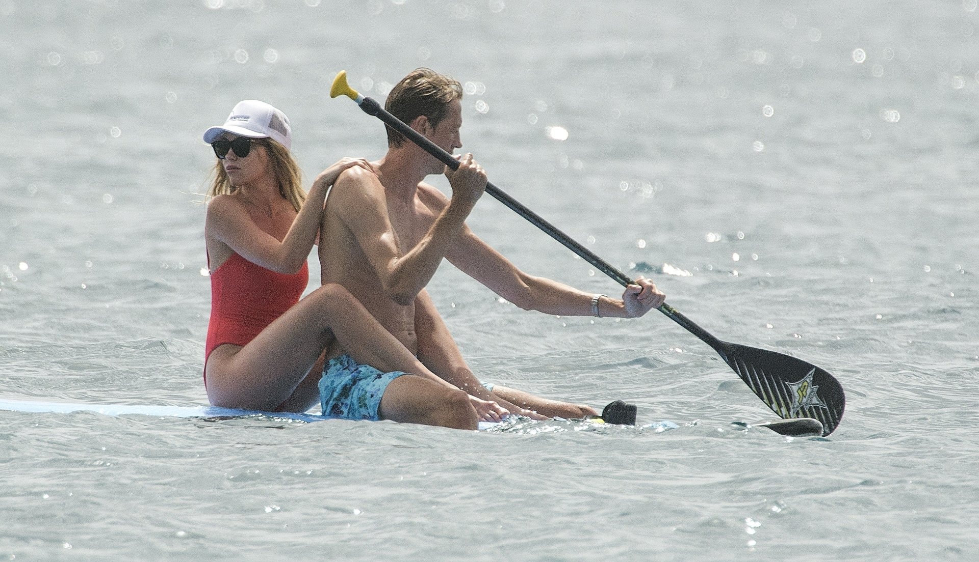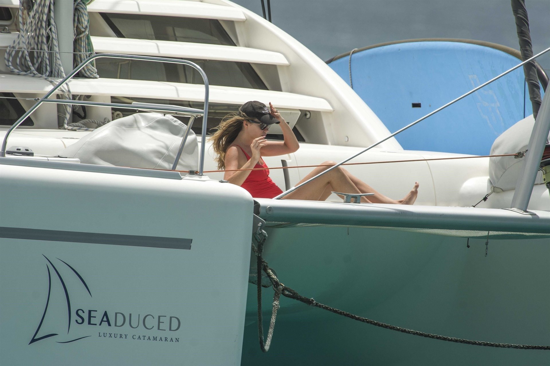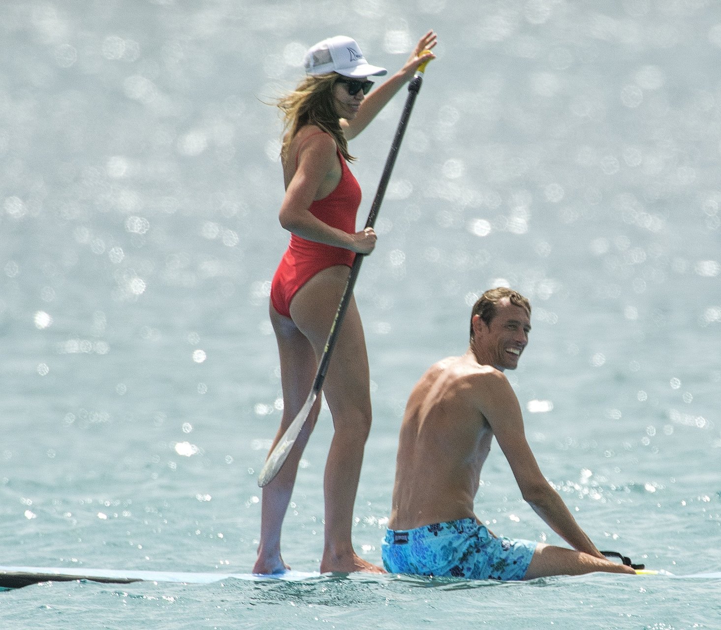 El futbolista británico Peter Crouch y su esposa modelo, Abbey Clancy, fueron vistos en un catamarán en Barbados. La impresionante rubia llevaba un traje de baño rojo de una pieza, mostrando sus piernas sexys, pequeños pechos y diminuto trasero.