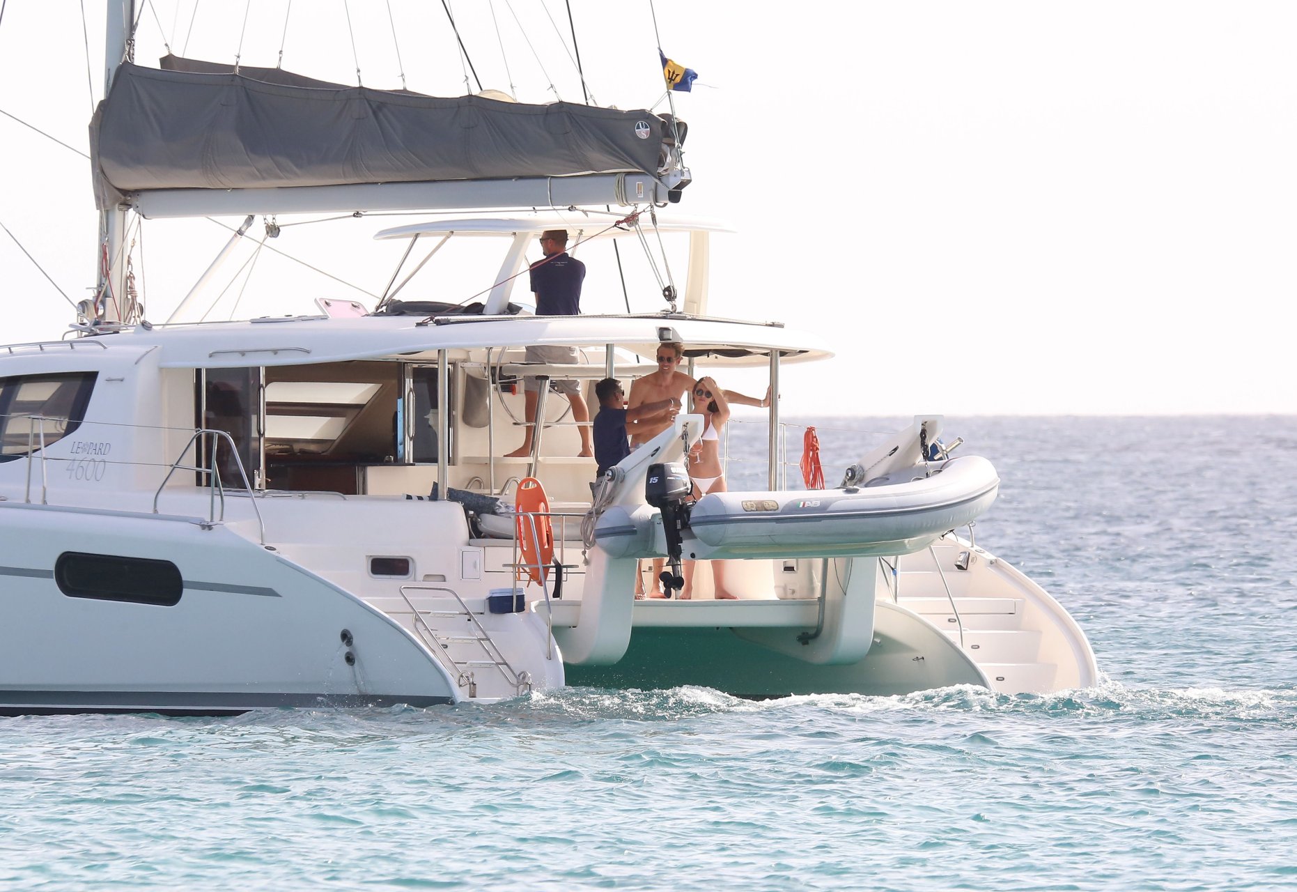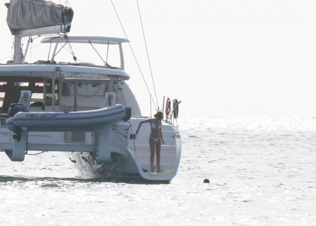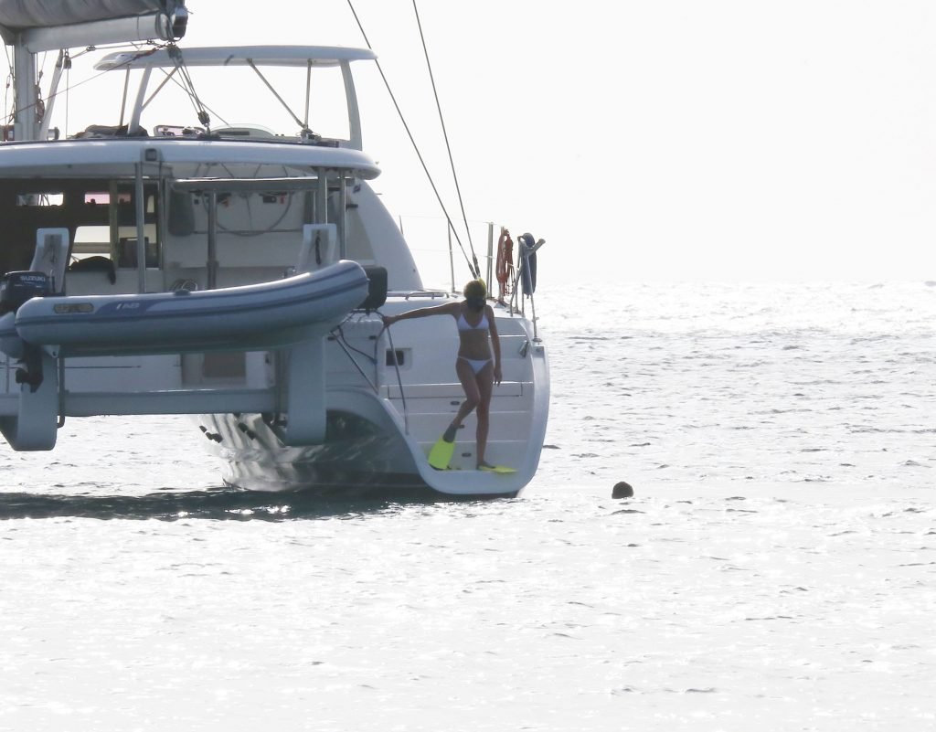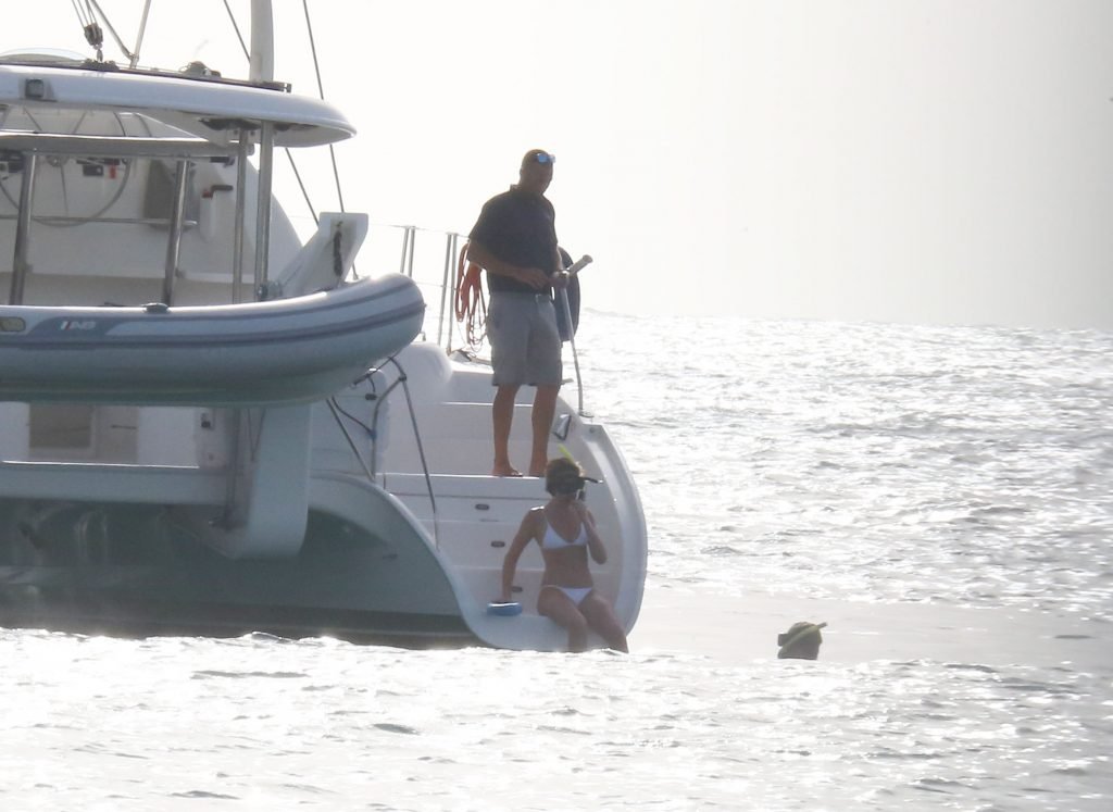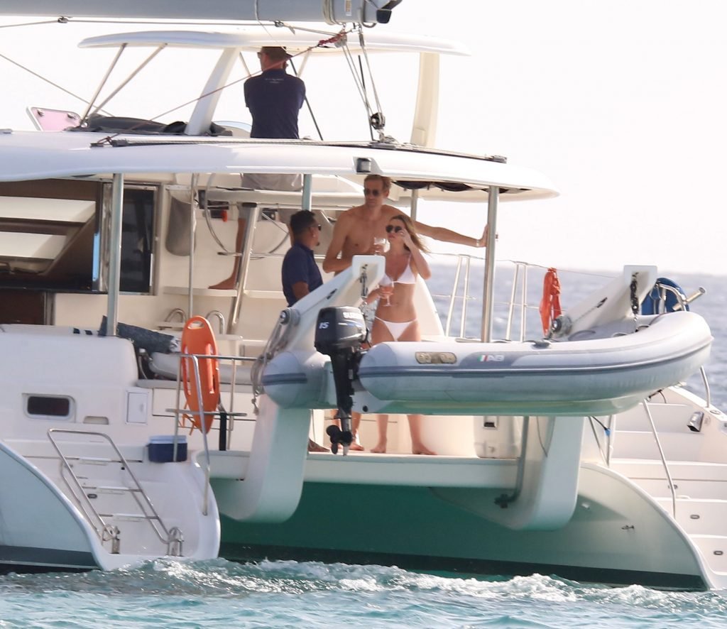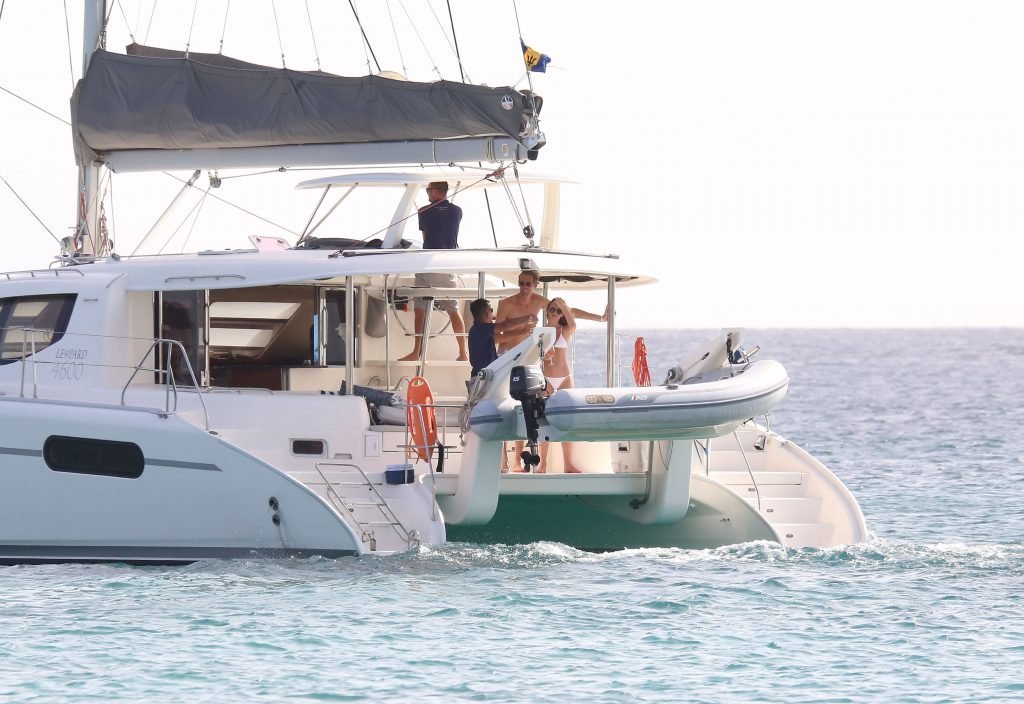 Modelo Abbey Clancy (32) con un bikini blanco y su esposo Peter Crouch son fotografiados navegando en el Catamarán Seaduced en Barbados, 13/06/2018.