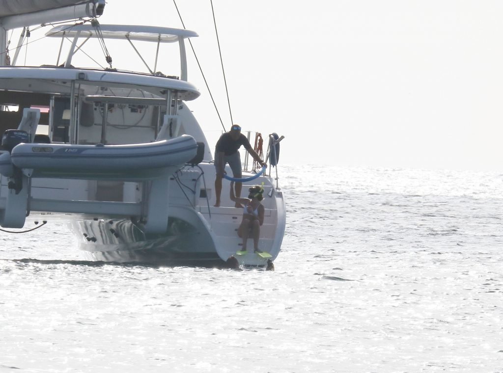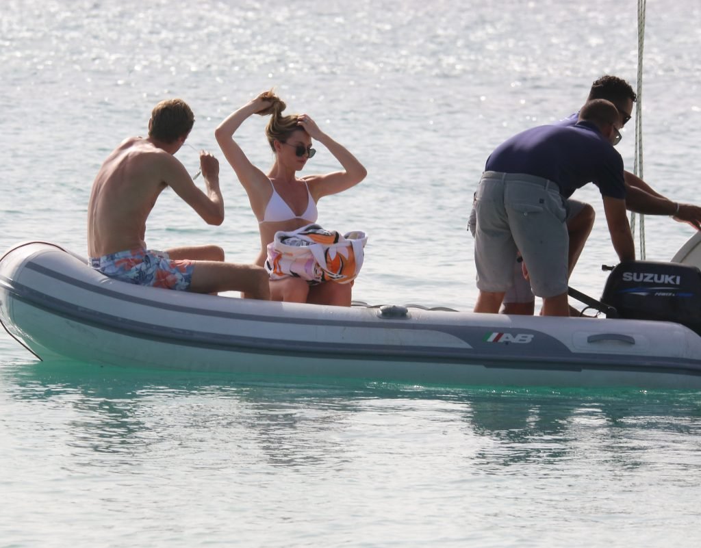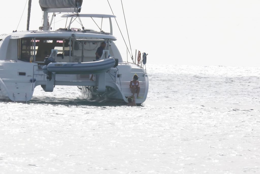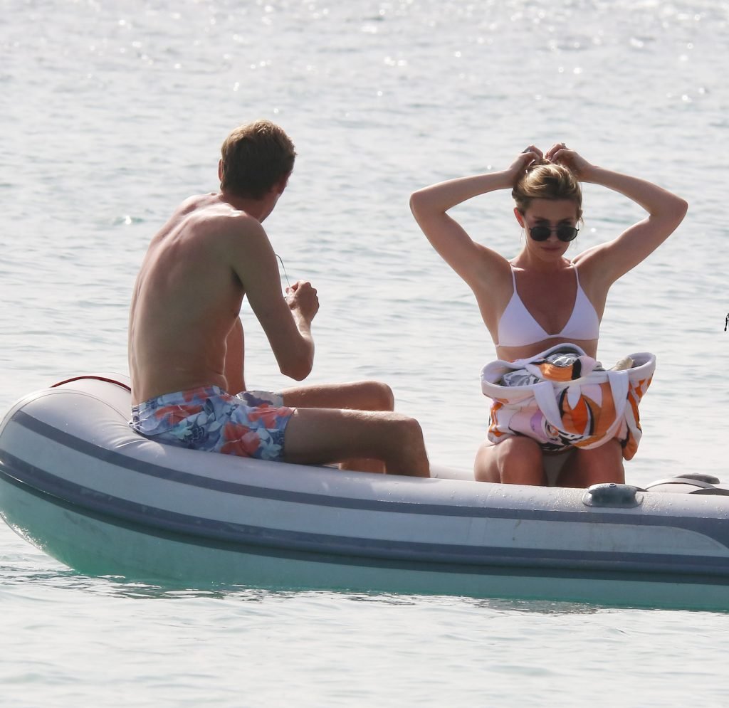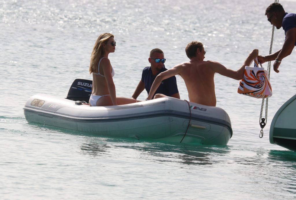 Modelo Abbey Clancy (32) con un bikini blanco y su esposo Peter Crouch son fotografiados navegando en el Catamarán Seaduced en Barbados, 13/06/2018.