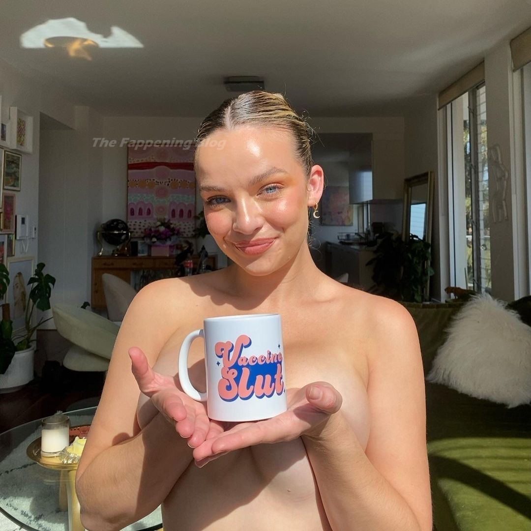 La estrella de reality show Abbie Chatfield posa desnuda de pecho, sosteniendo una taza blanca con las palabras “Vaccine Slut” – Instagram, 18/08/2021.