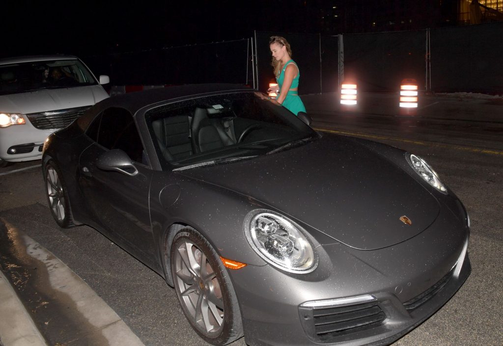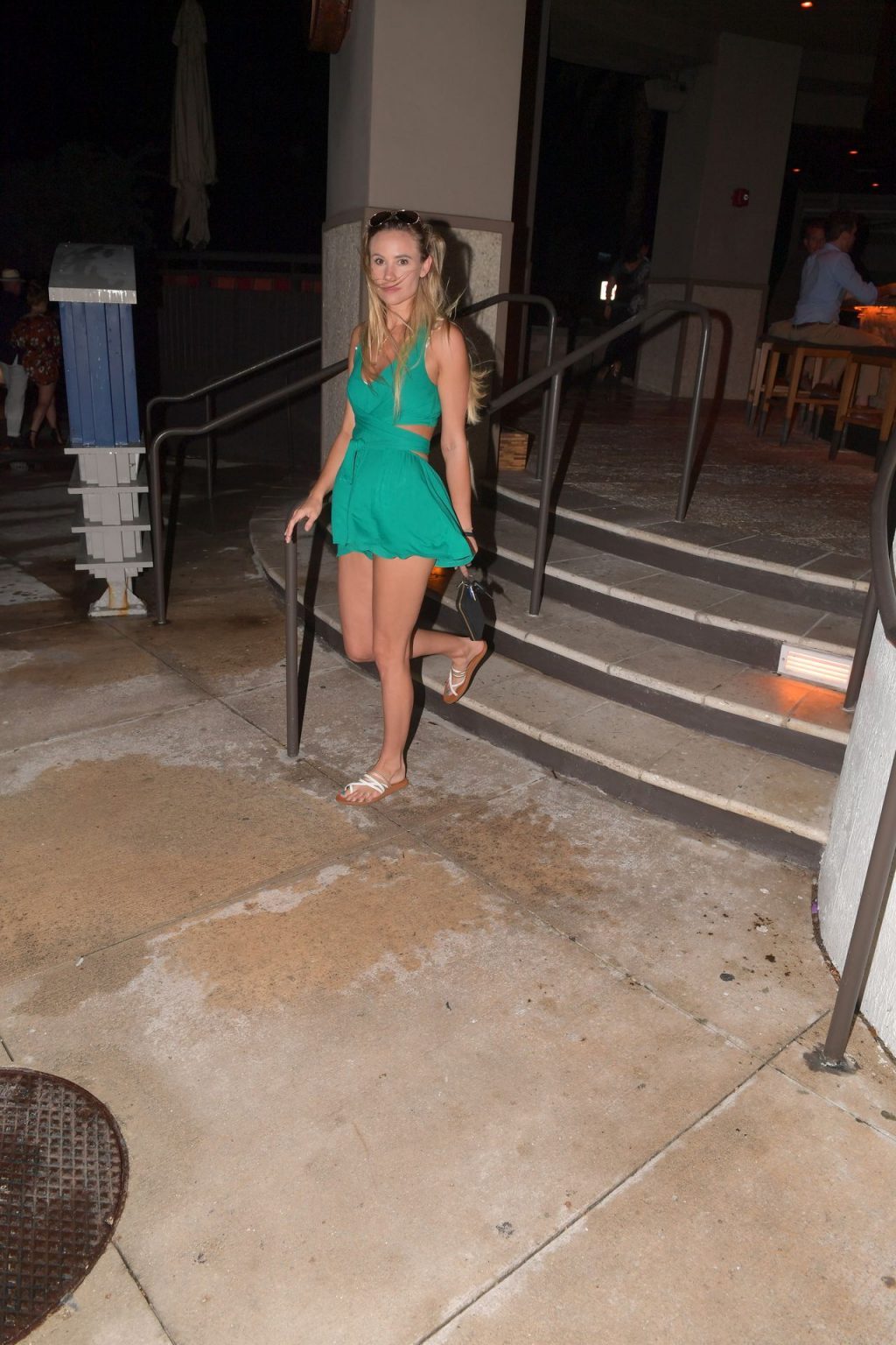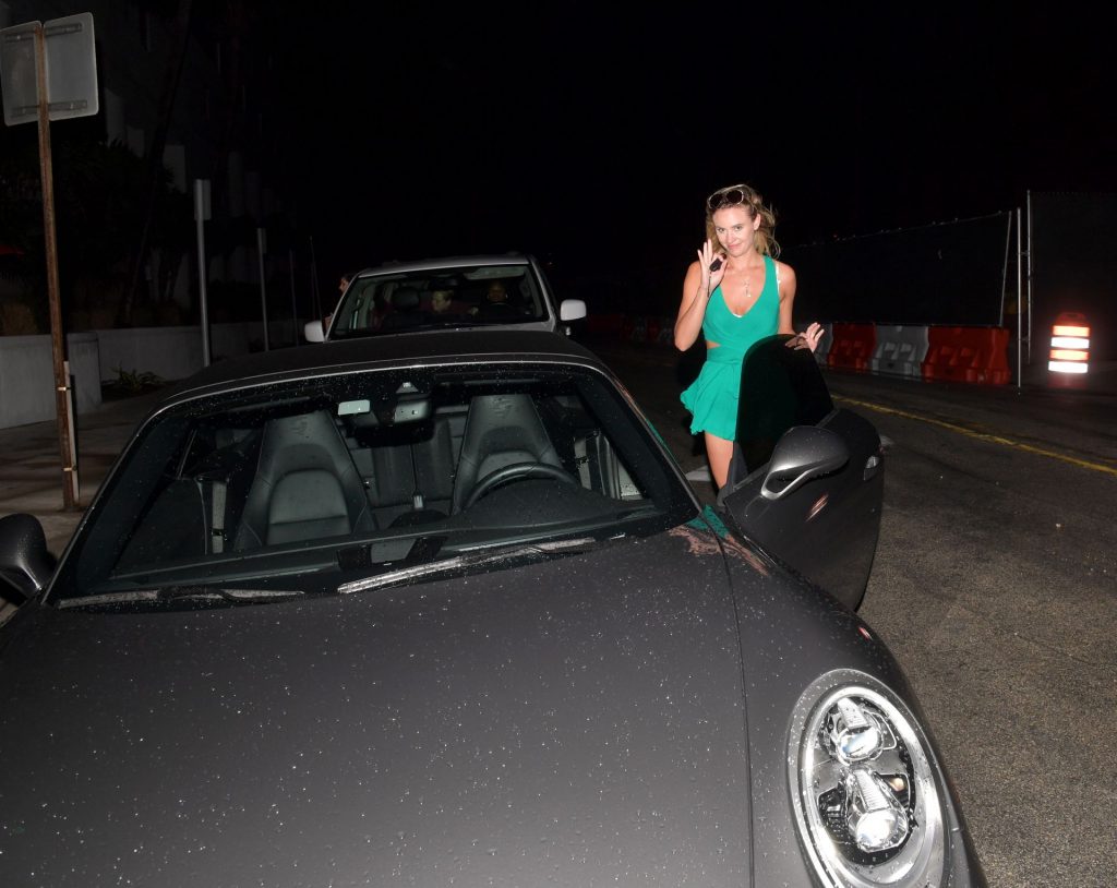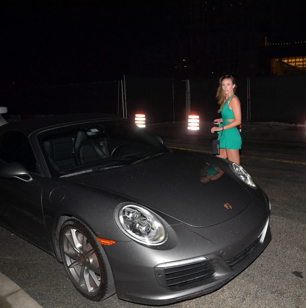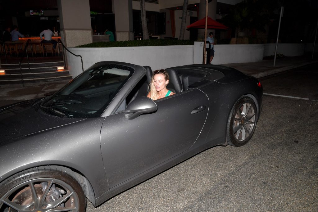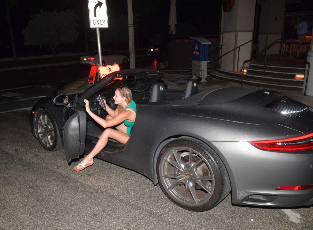 Estrella porno de la Iglesia Mormona y mascota de Penthouse de junio de 2019 y chica de portada de mayo/junio Addie Andrews sale de su Porsche con sus largas piernas y aspecto de supermodelo, vistiendo un lindo vestido de sol color teal mientras toma una bebida rápida con amigos en un bar local el 24 de octubre de 2019 en Miami Beach, Florida.