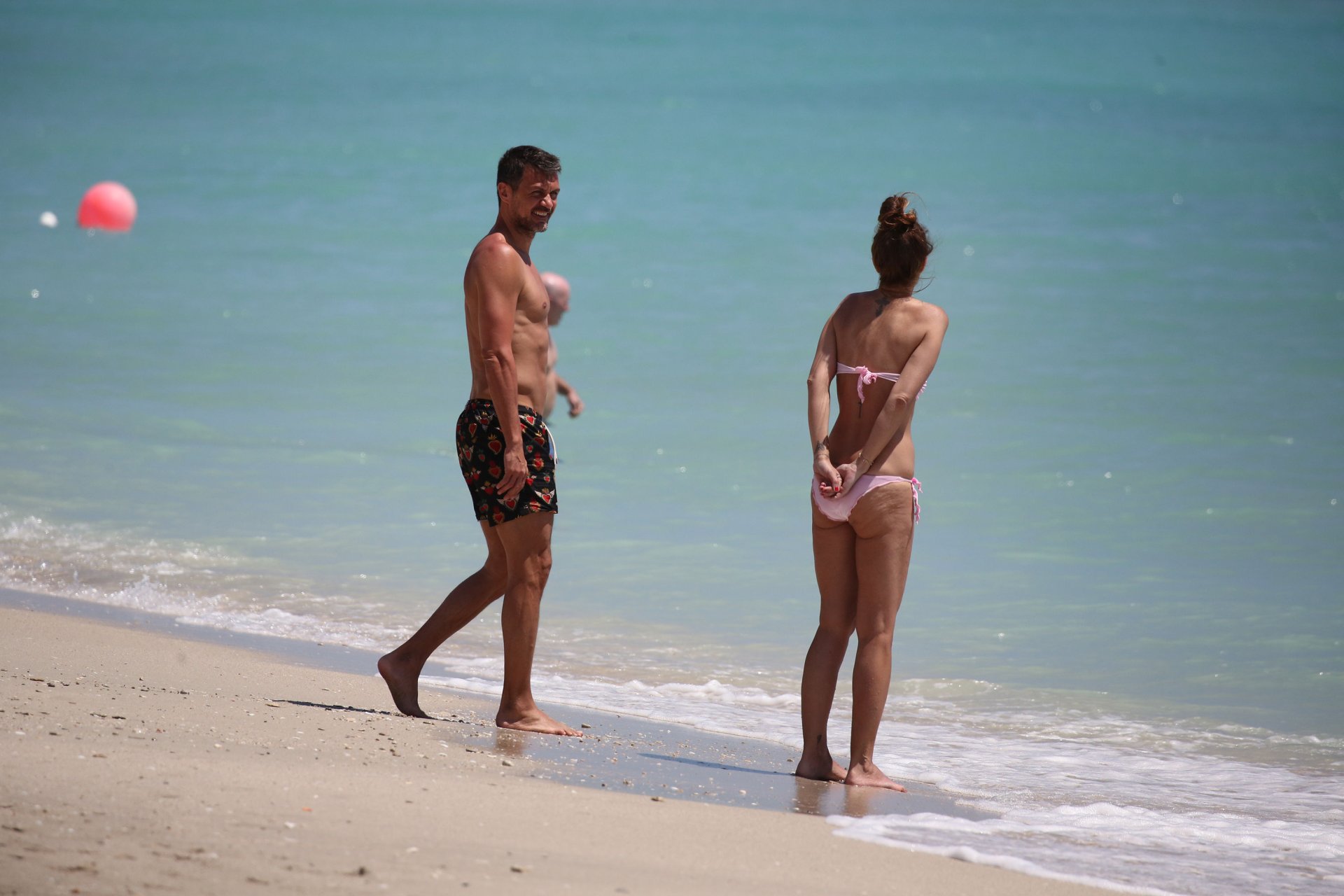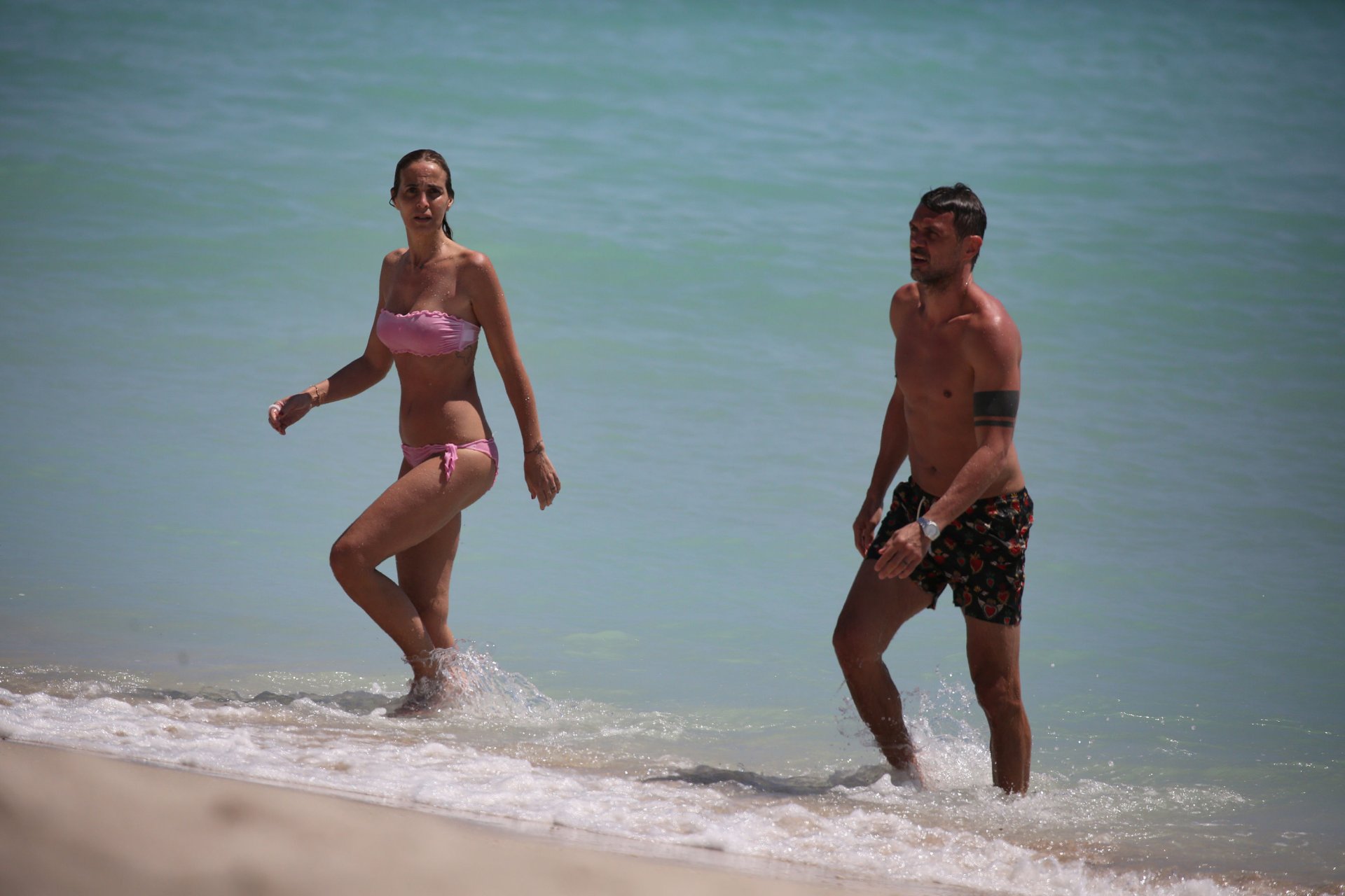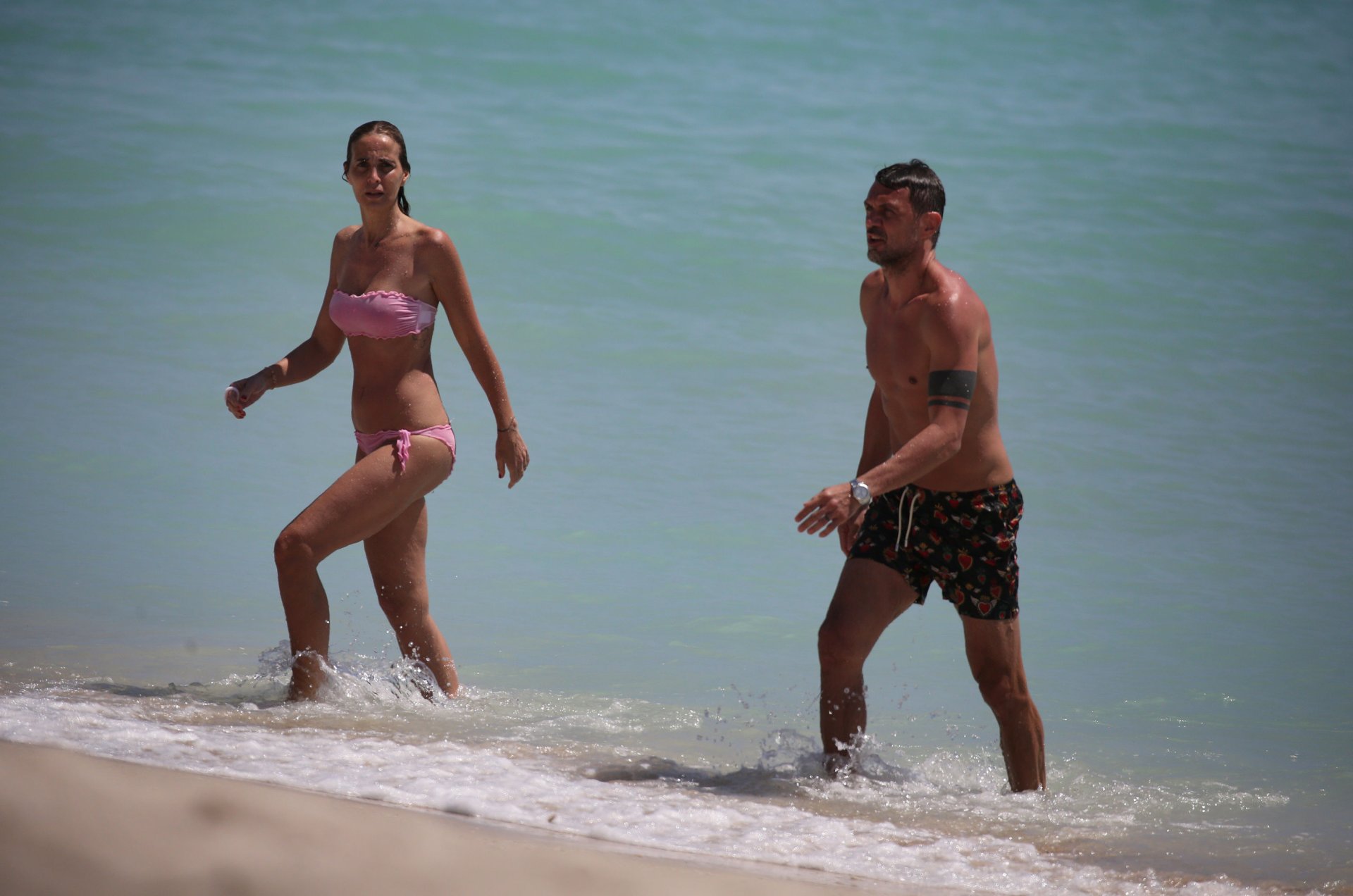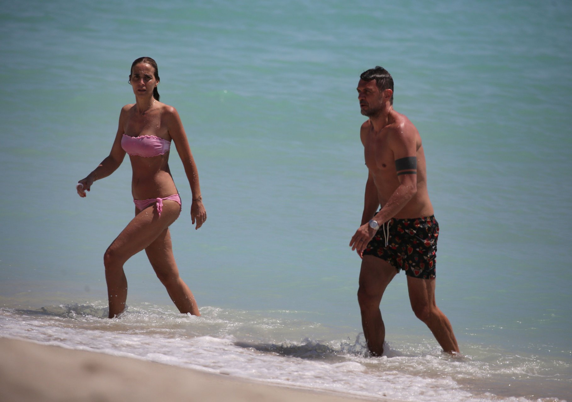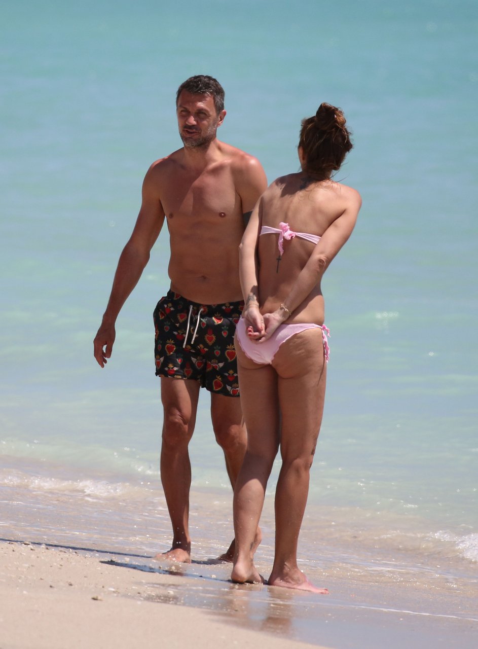 El exfutbolista profesional Paolo Maldini (AC Milan) y su esposa Adriana Fossa muestran sus cuerpos de playa en Miami, 16/04/2018. Adriana Elena Fossa Blanco es una exmodelo, actriz y empresaria venezolana. Nacida: 8 de junio de 1968.