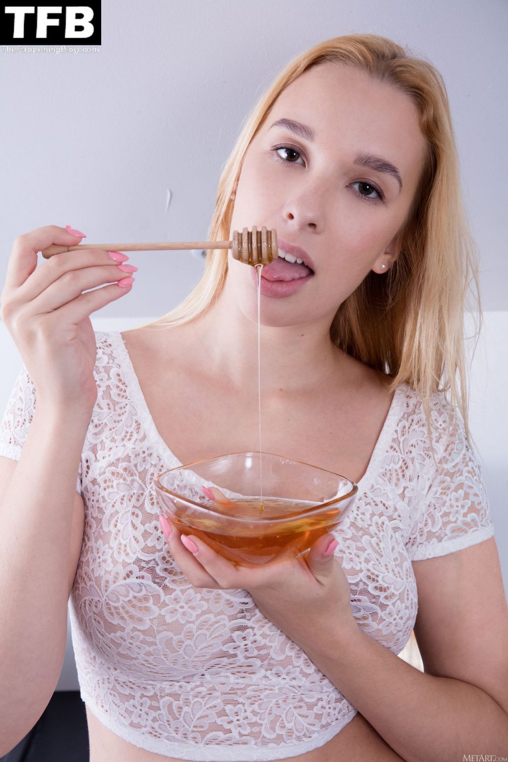 La encantadora modelo Agata posa desnuda en la cocina y se extiende miel sobre sus tetas. Esta es la primera sesión de Agata con un nuevo peinado y la chica luce ardiente como rubia.