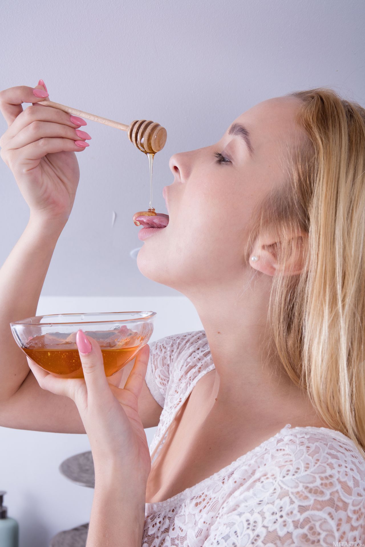 La encantadora modelo Agata posa desnuda en la cocina y se extiende miel sobre sus tetas. Esta es la primera sesión de Agata con un nuevo peinado y la chica luce ardiente como rubia.