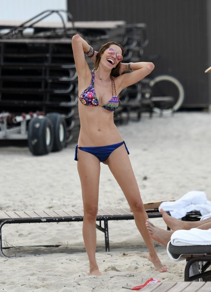 Modelo, actriz y estrella de televisión Aida Yespica lleva un diminuto bikini azul en la playa de Miami, 11/03/2018.