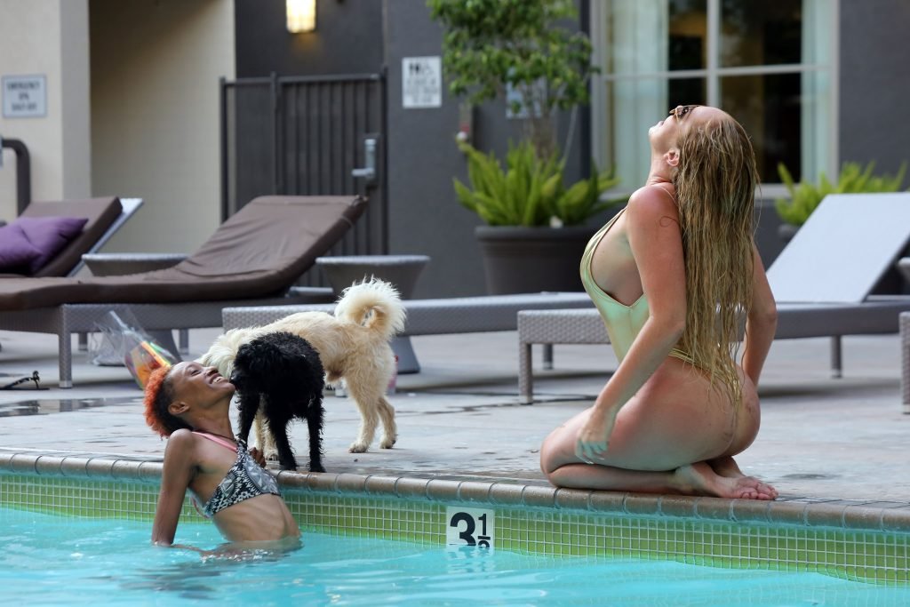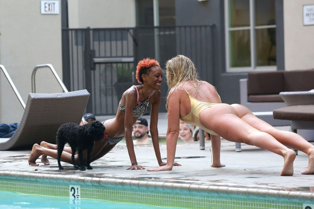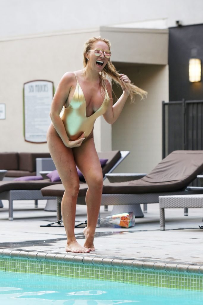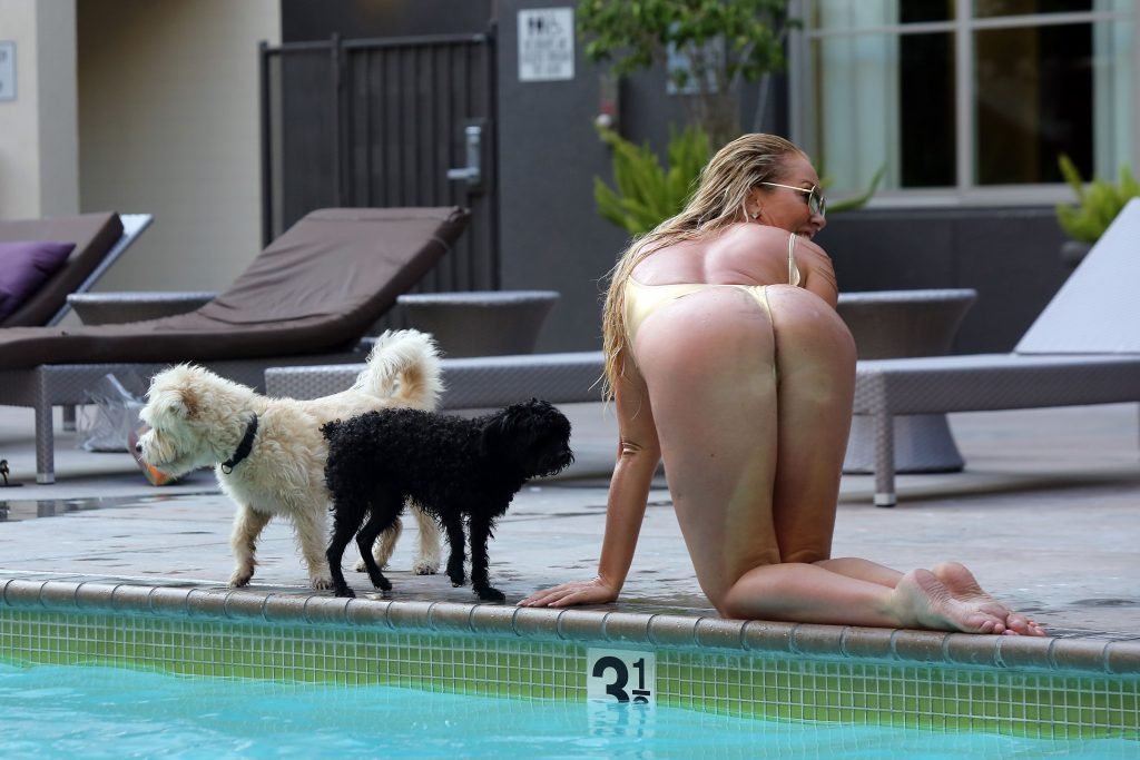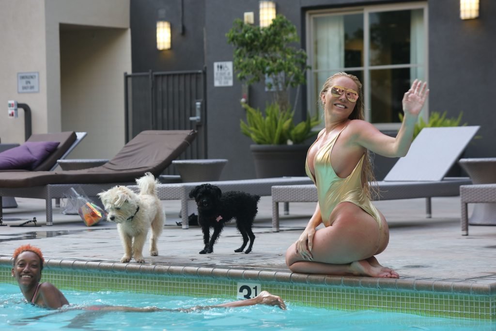 Aisleyne Horgan-Wallace deslumbra al sol junto a la piscina vestida con un bikini dorado en Los Ángeles, 30/06/2107. Aisleyne Horgan-Wallace es modelo, diseñadora, actriz, columnista de revista, personalidad de TV (Gran Hermano). Edad – 38.
