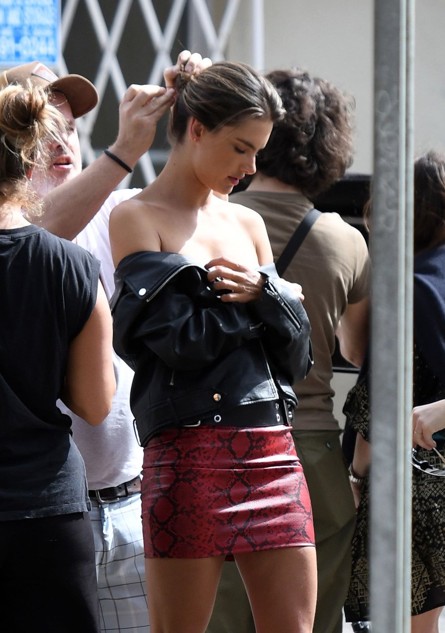 La modelo brasileña Alessandra Ambrosio hace todo lo posible para evitar un fallo de vestuario con chaqueta de cuero negra y falda roja para la sesión de fotos de Elle Italia en Little Havana, Florida, 23/01/2019.