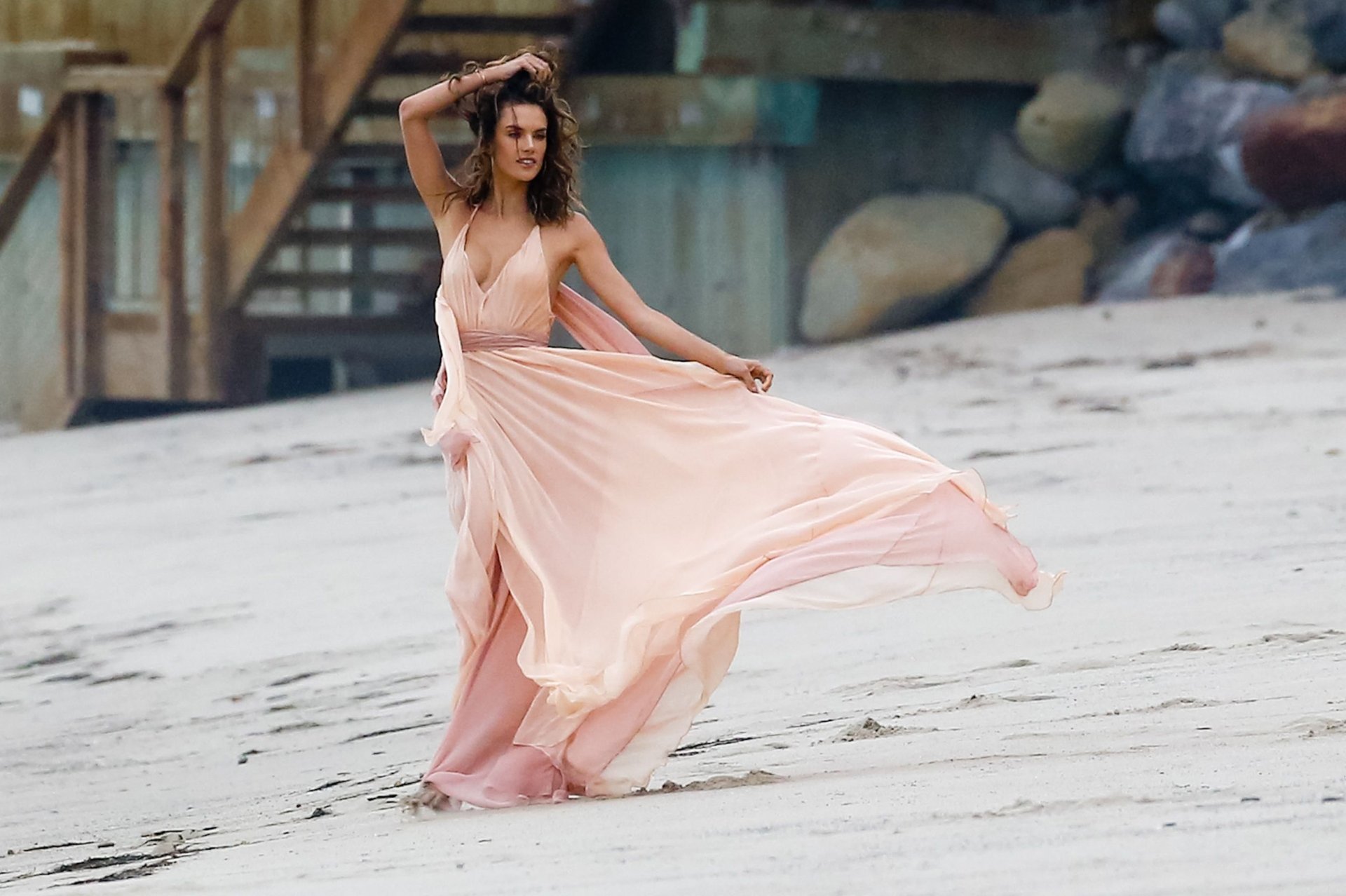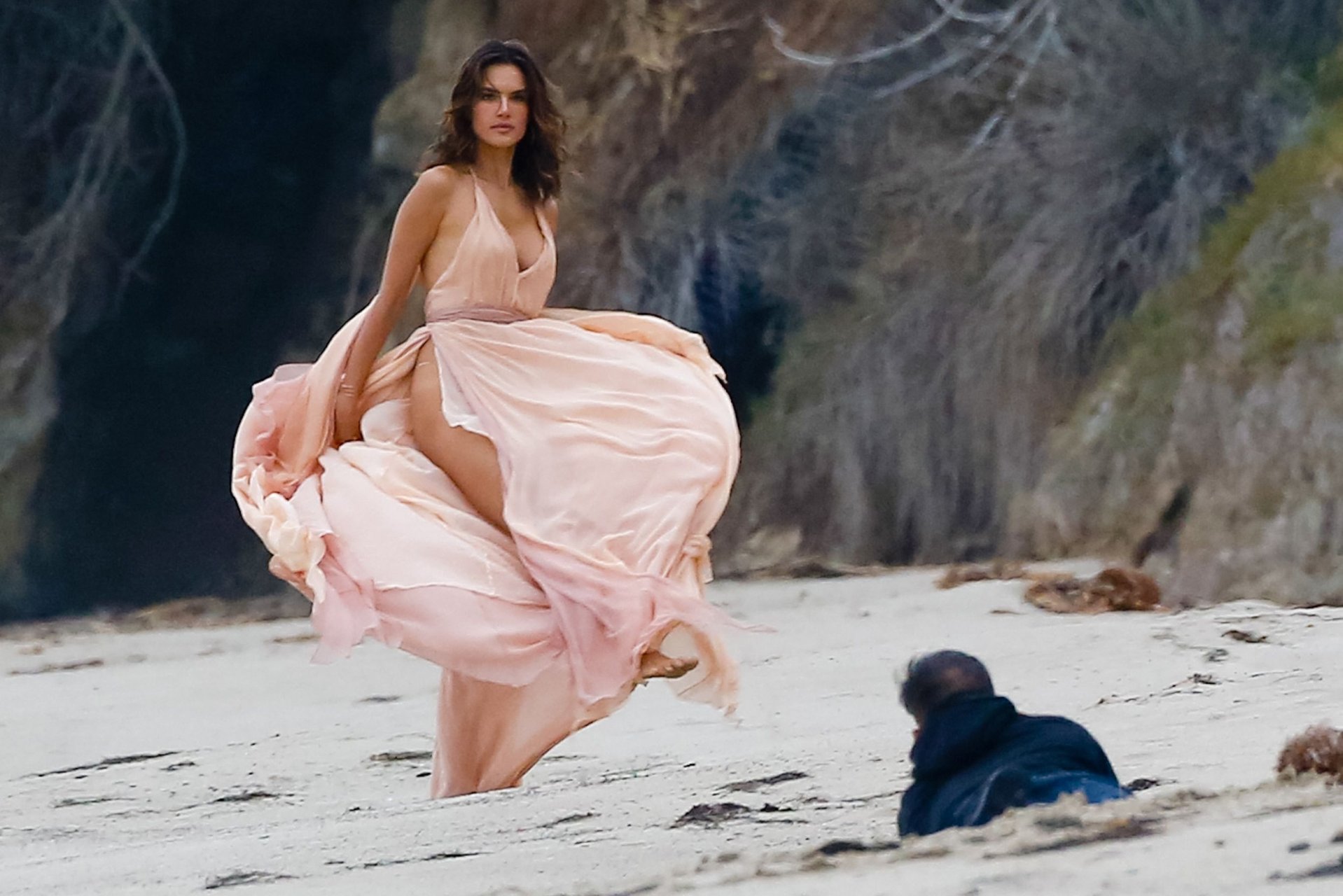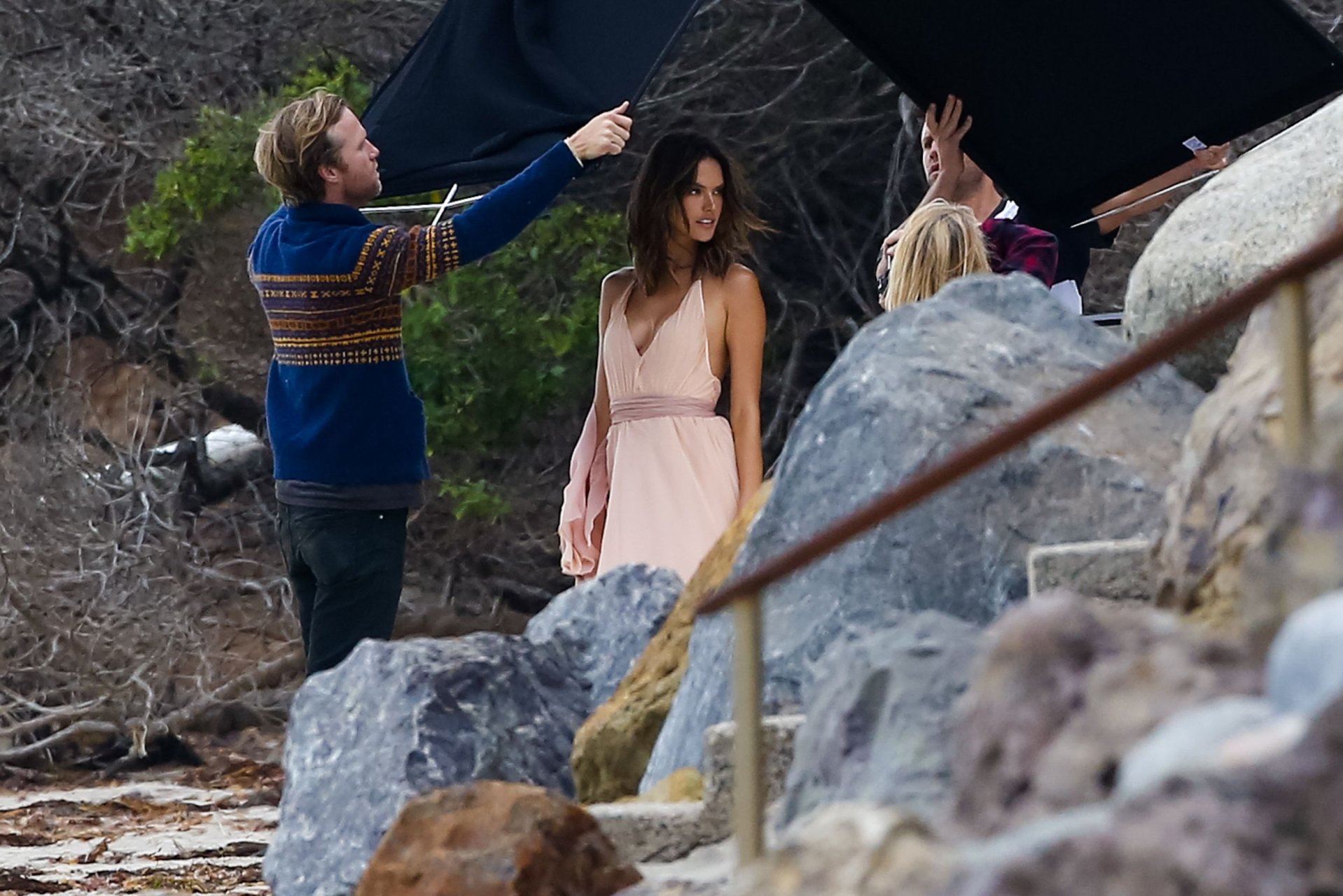 Alessandra Ambrosio usando tanga en el set de una sesión de fotos en Malibu, 10/06/16. ¡El vestido es espectacular! Alessandra Ambrosio es una modelo brasileña. Edad: 35 (11 de abril de 1981). Altura 177 cm.