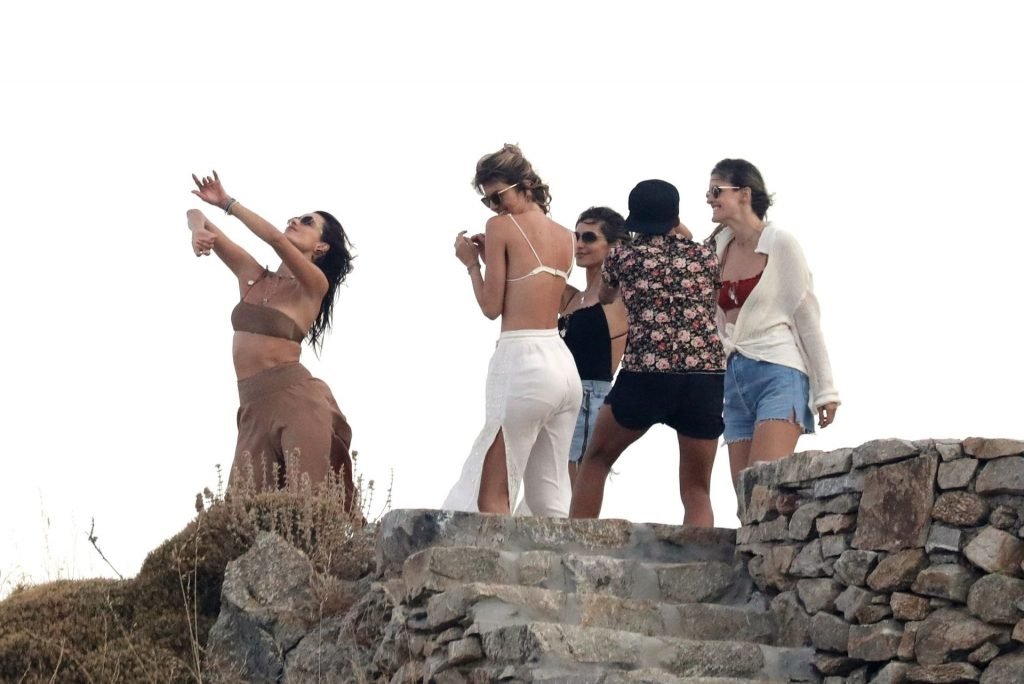 Alessandra estuvo acompañada por su hermana Aline Ambrosio y algunos amigos mientras el grupo se dirigía a la Fiesta Sunset Country, donde subieron la montaña cerca de la playa para bailar desde la parte superior de la playa al ritmo de la música del bar de playa Kensho Psarou.