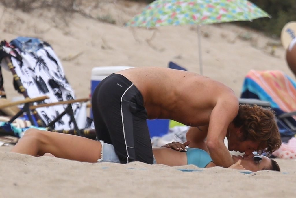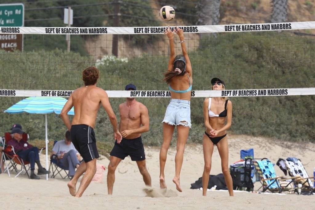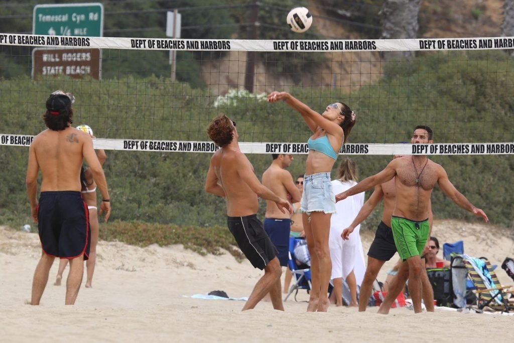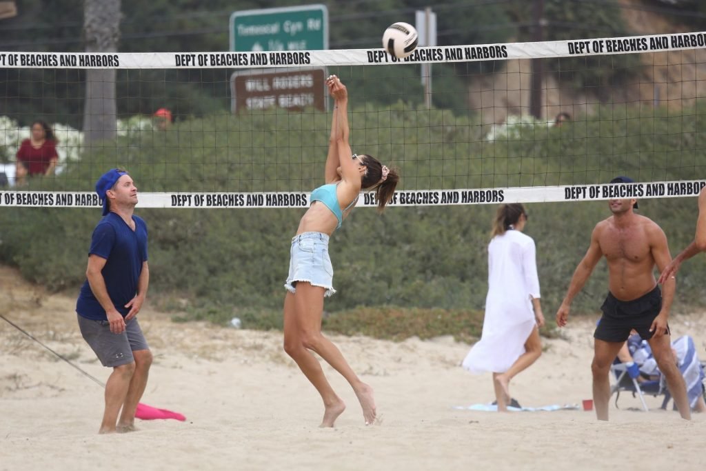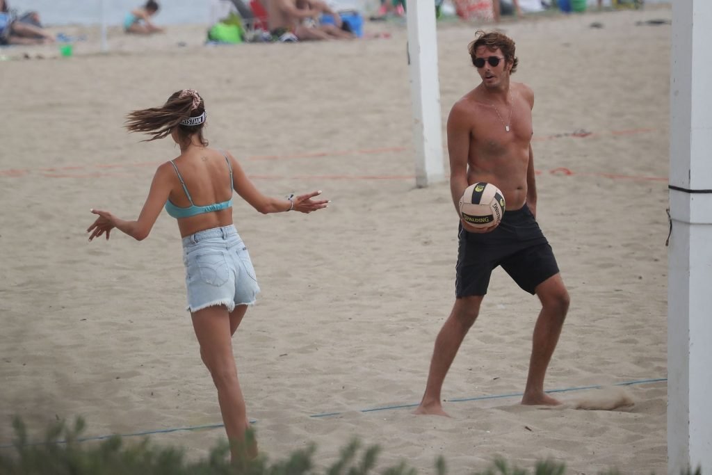 La supermodelo brasileña jugó voleibol con sus amigos y se la pudo ver tomando chupitos y besándose con su pareja entre los juegos antes de irse en su bicicleta.