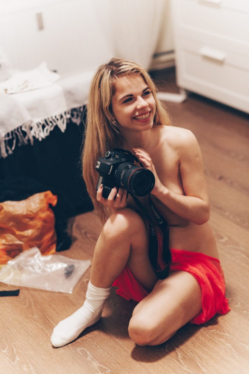 La modelo rusa Alexandra Smelova apareció como fotógrafa desnuda en una sesión de fotos “Naked Backstage” por Sergei Starostin (noviembre de 2018). Esta joven belleza luce genial con la cámara.