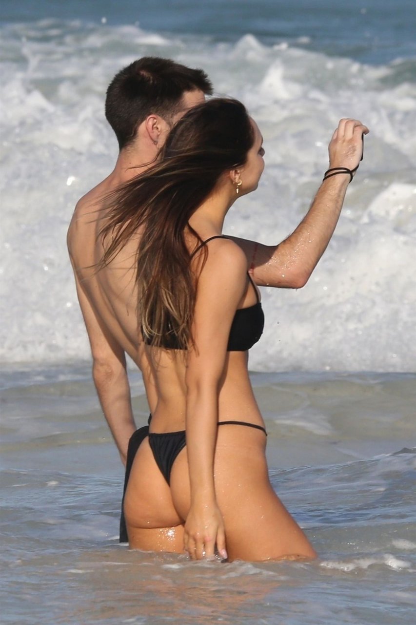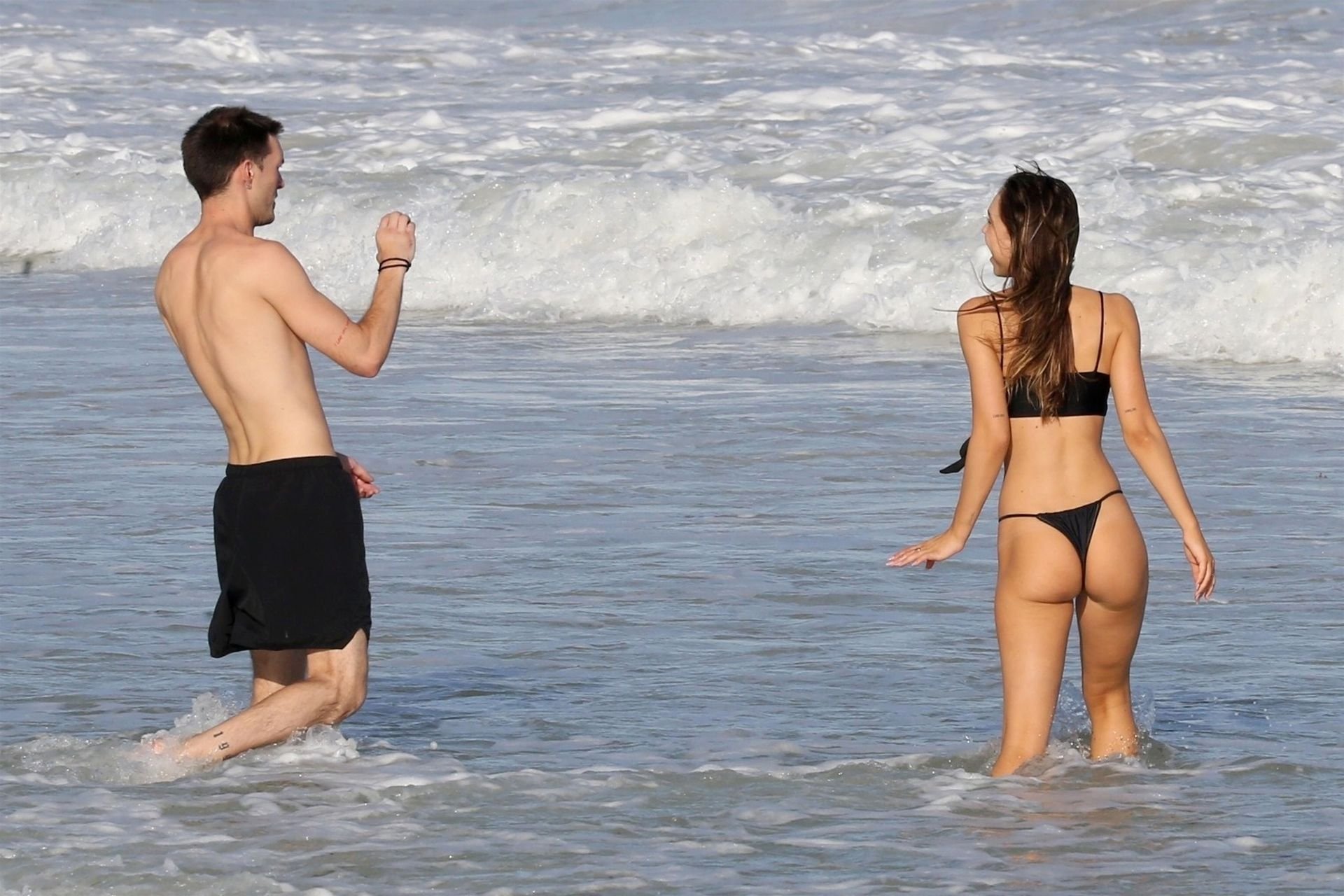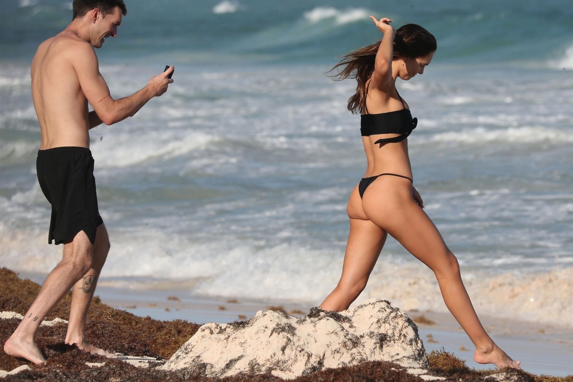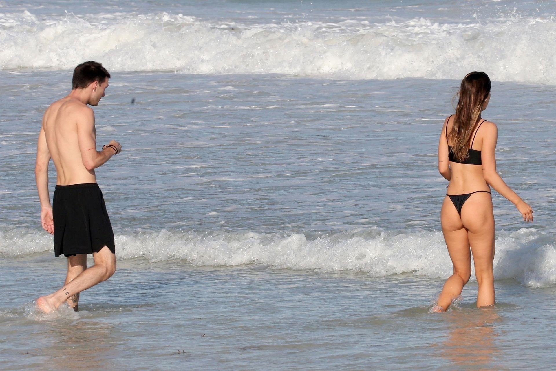 La modelo y ex concursante de Bailando con las Estrellas disfruta de un tiempo de descanso para comenzar el 2019 en el resort Casa Malca Tulum, en Quintana Roo, México, 01/04/2019. Ella deslumbra con un diminuto bikini negro mientras ella y el hombre se lanzan a las olas a lo largo de la playa concurrida.