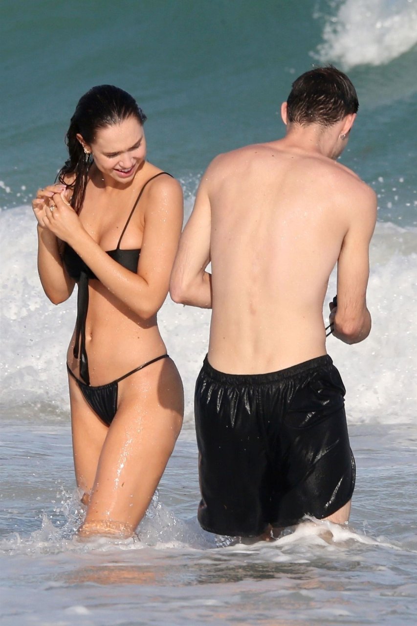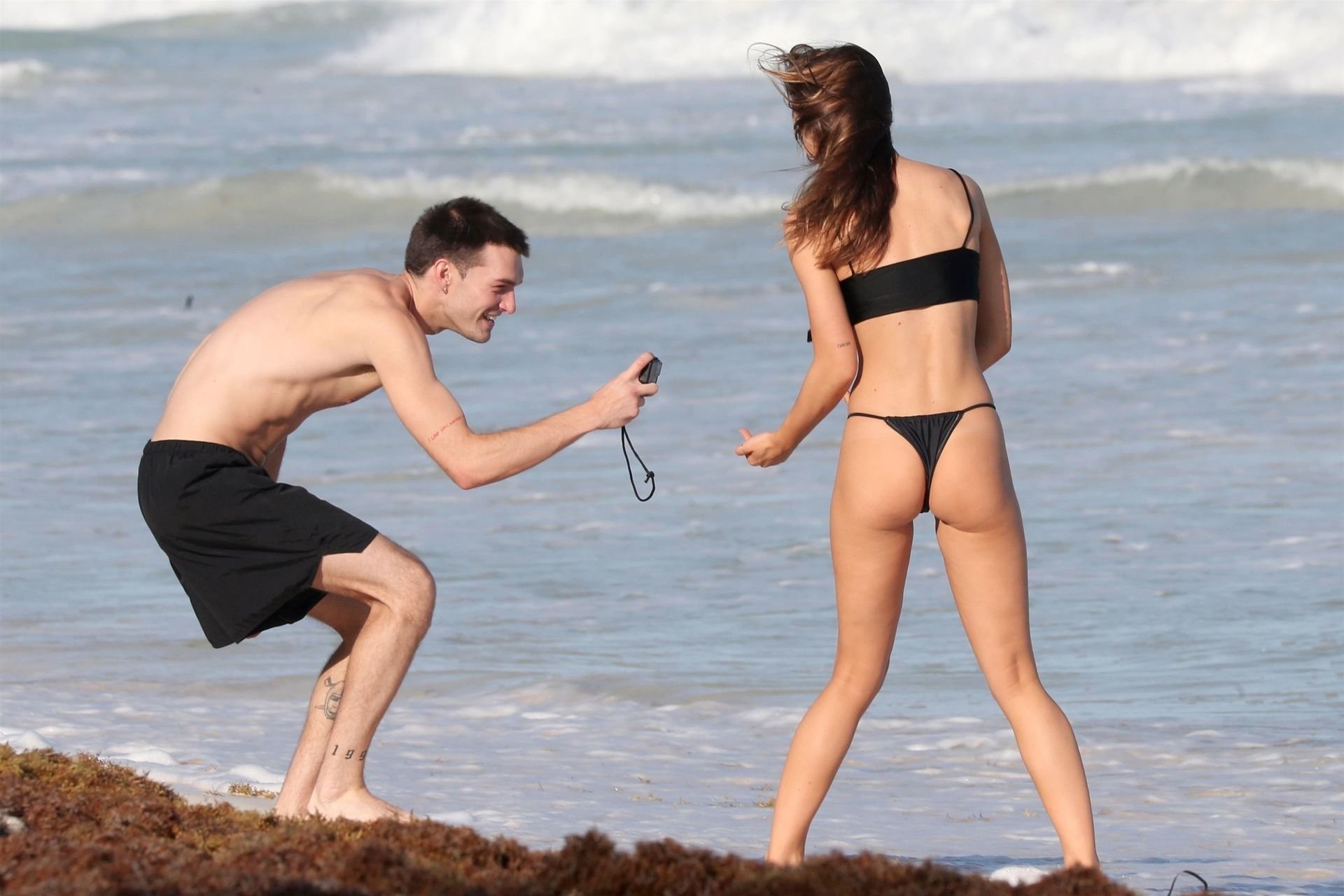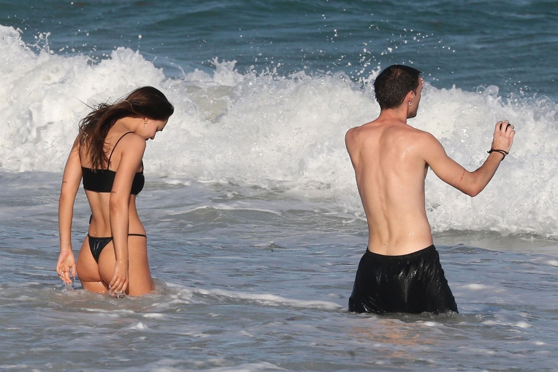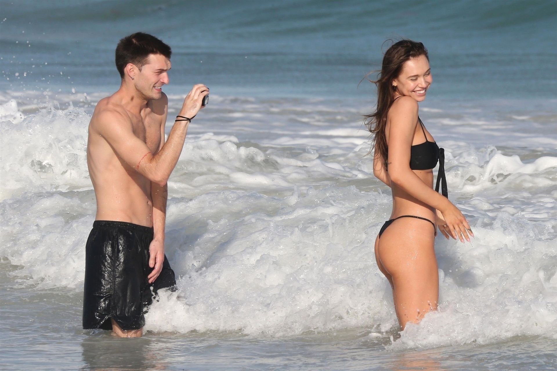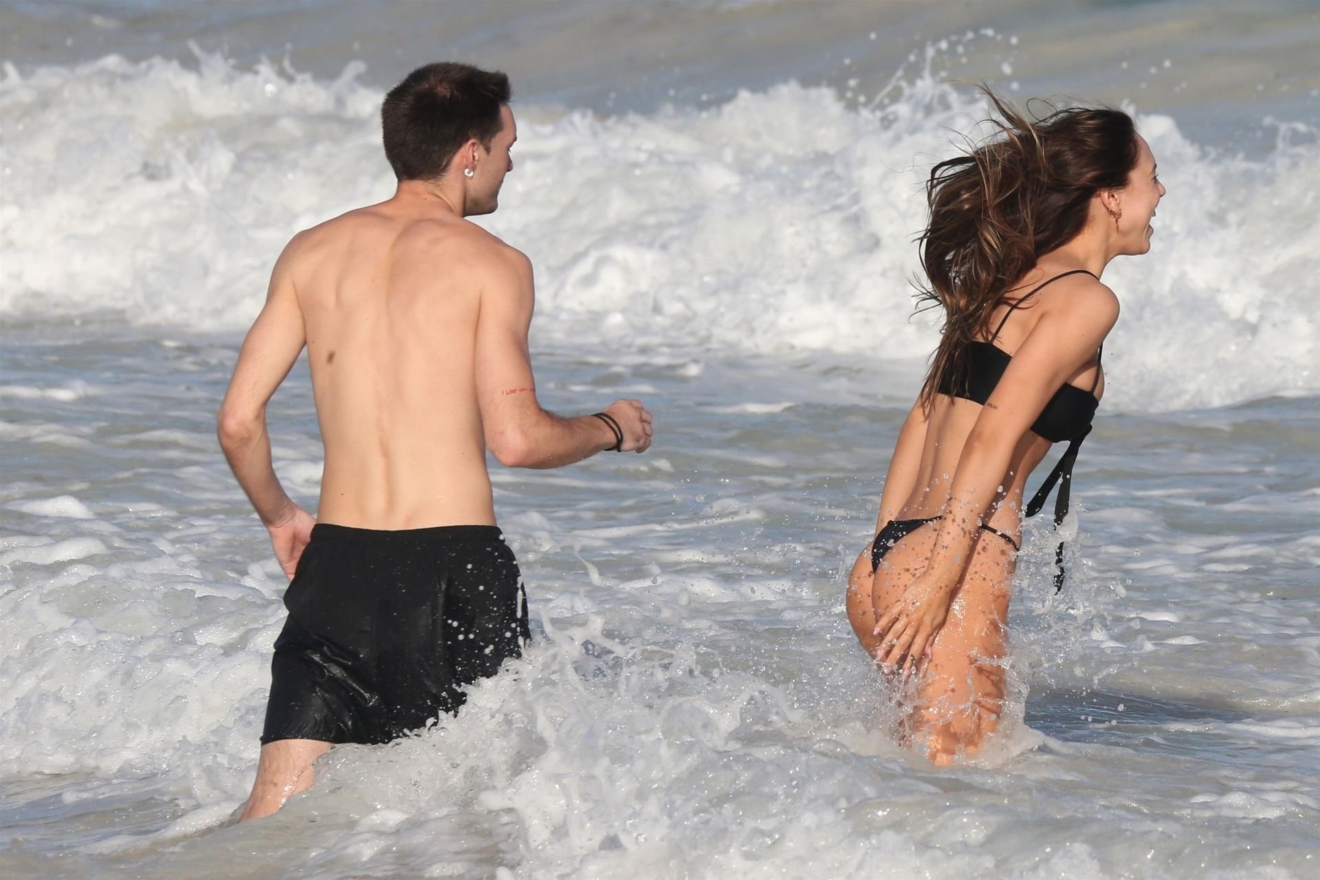 La modelo y ex concursante de Bailando con las Estrellas disfruta de un tiempo de descanso para comenzar el 2019 en el resort Casa Malca Tulum, en Quintana Roo, México, 01/04/2019. Ella deslumbra con un diminuto bikini negro mientras ella y el hombre se lanzan a las olas a lo largo de la playa concurrida.