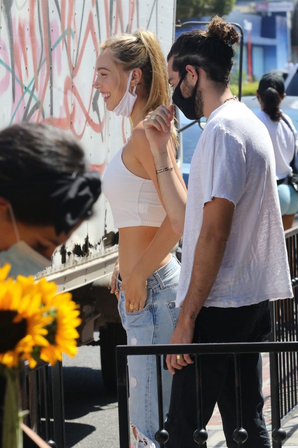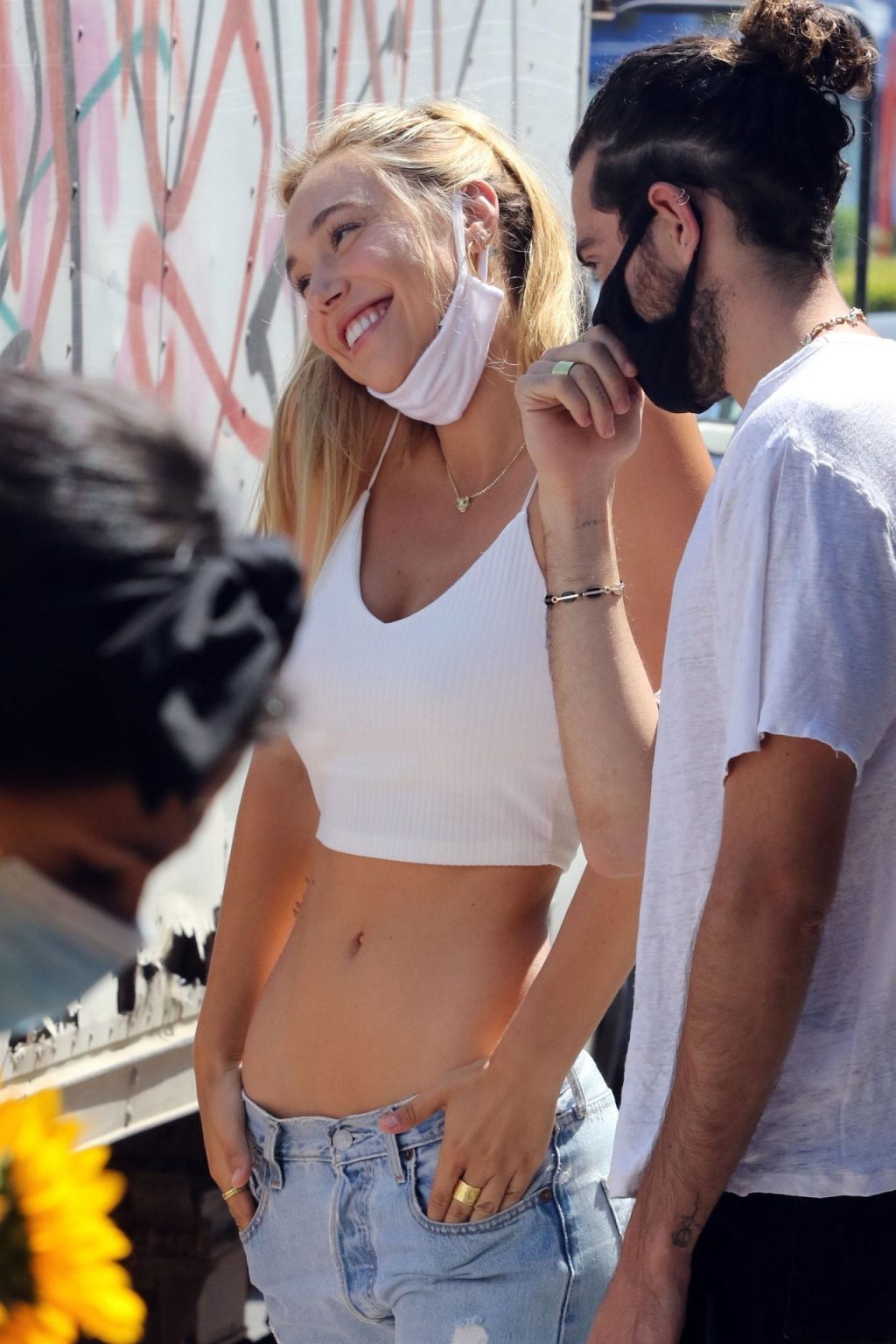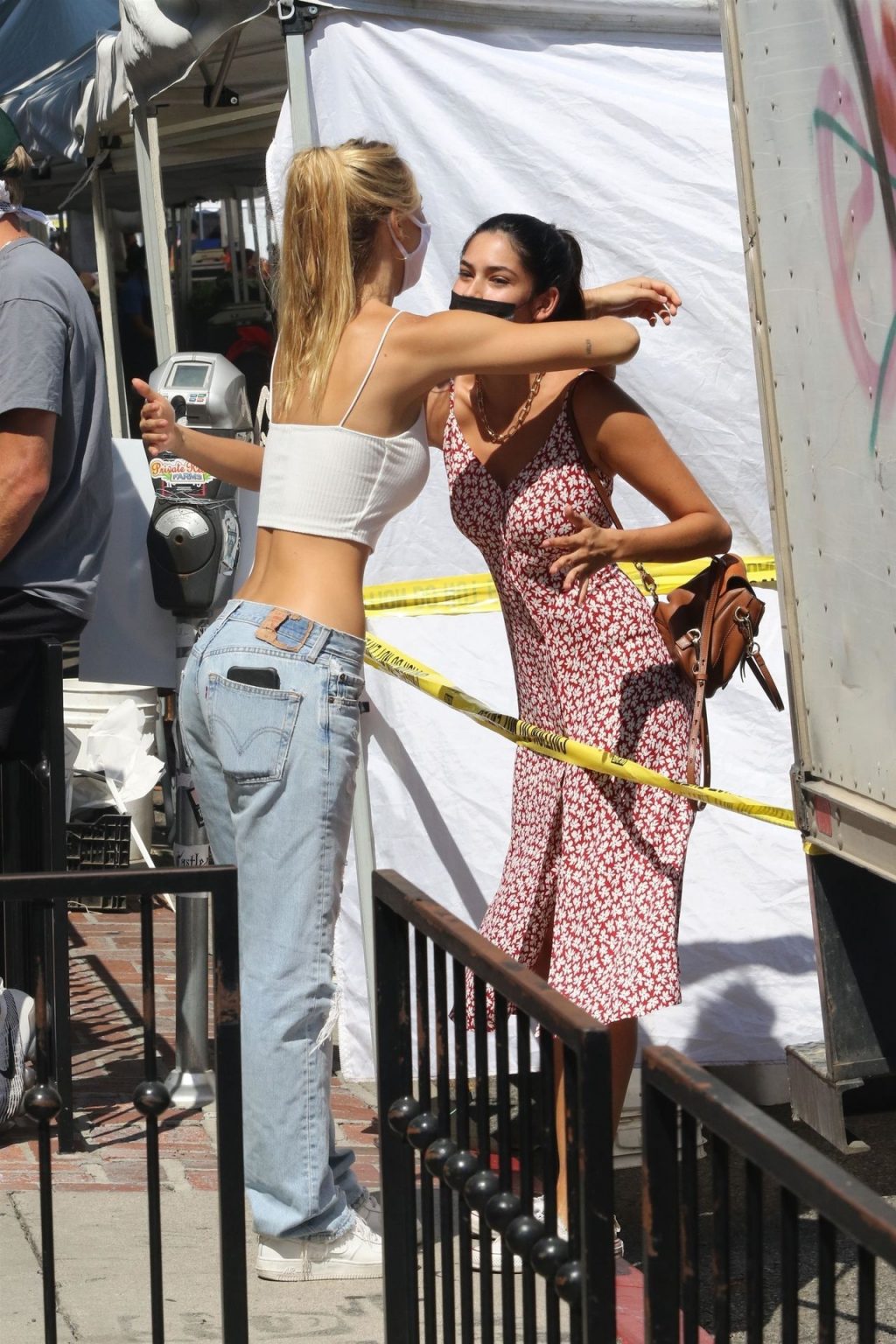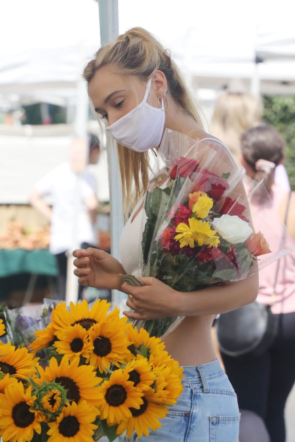 Alexis Ren se ve con una amiga comprando café helado Alfred y flores en el mercado de agricultores en un caluroso y soleado domingo (agosto de 2020).