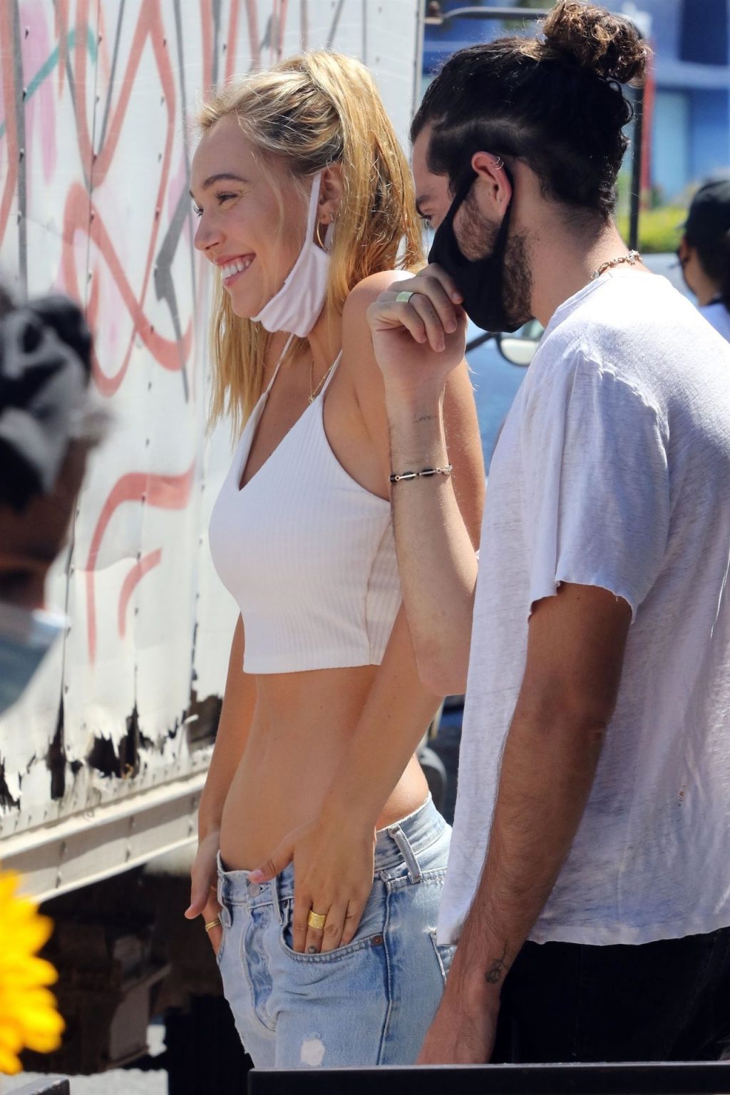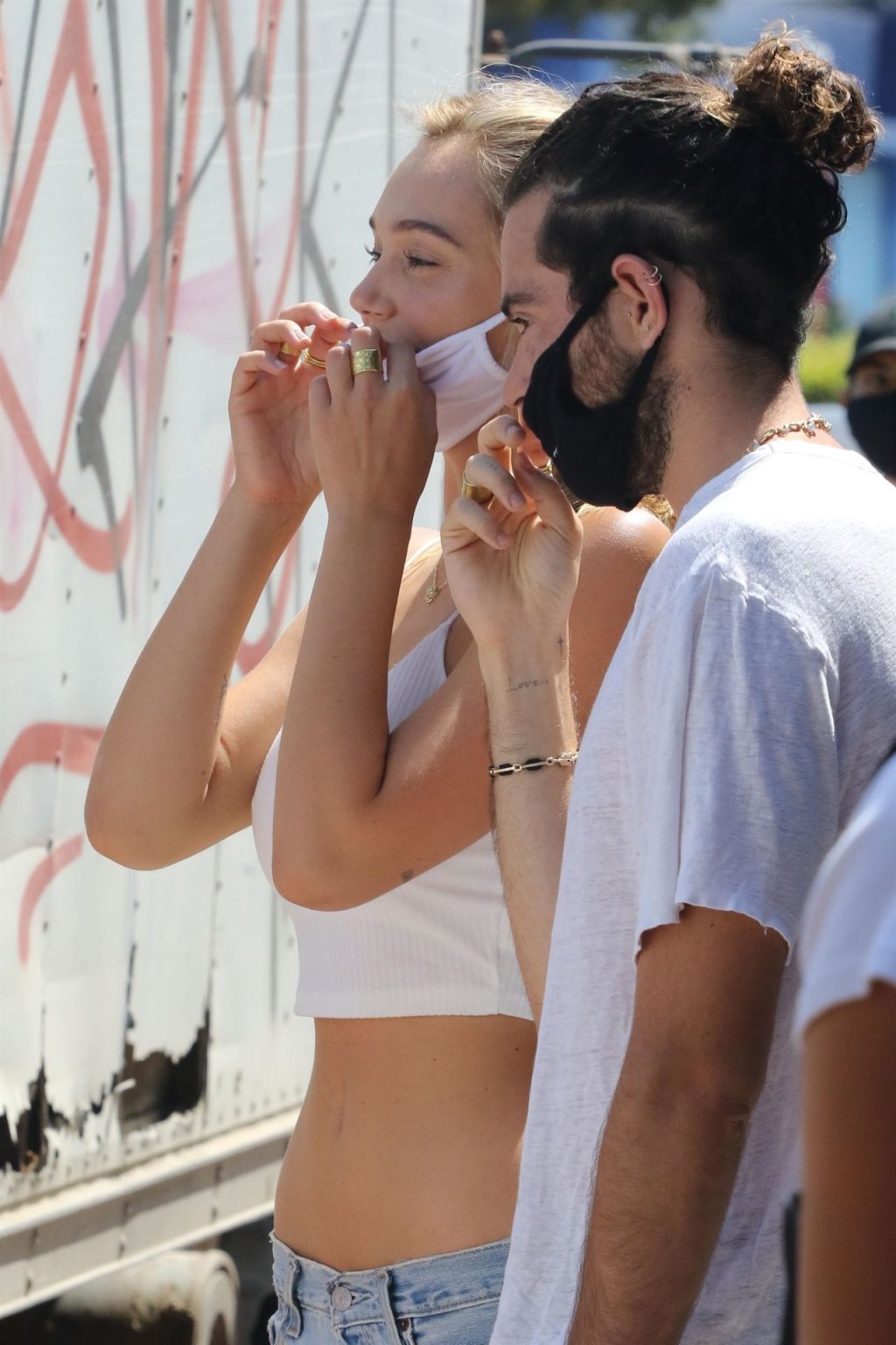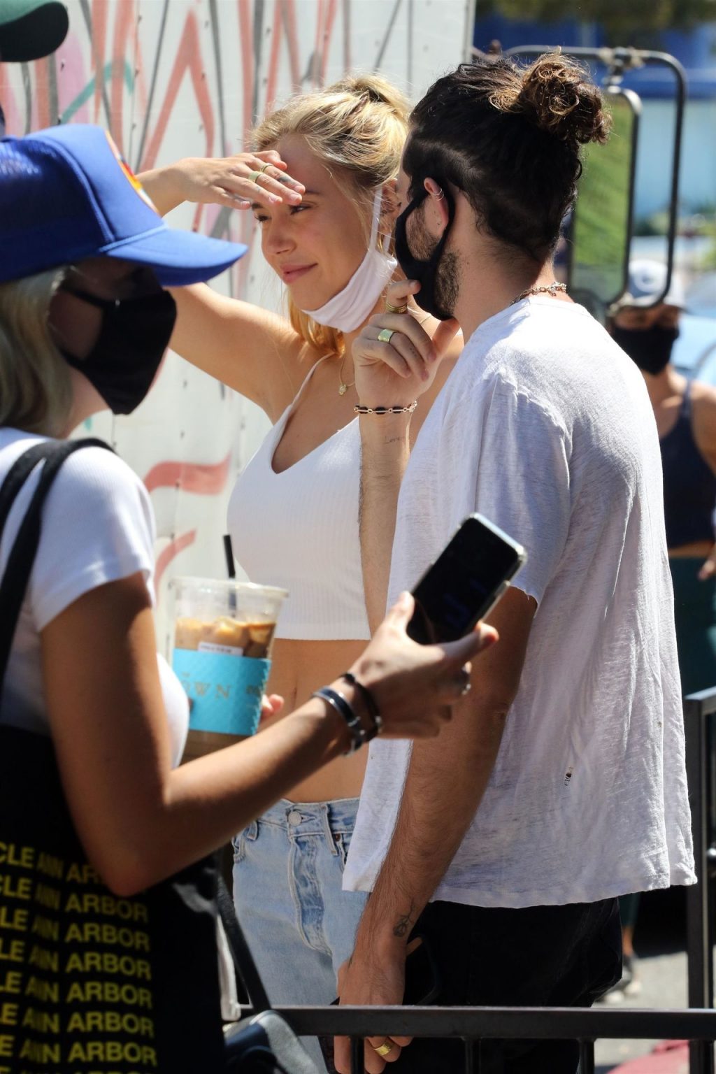 Alexis Ren se ve con una amiga comprando café helado Alfred y flores en el mercado de agricultores en un caluroso y soleado domingo (agosto de 2020).