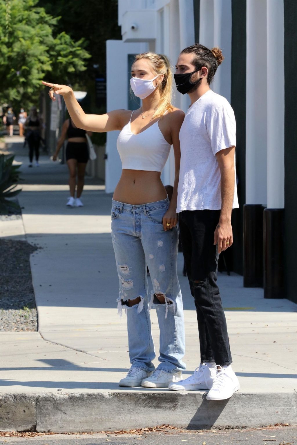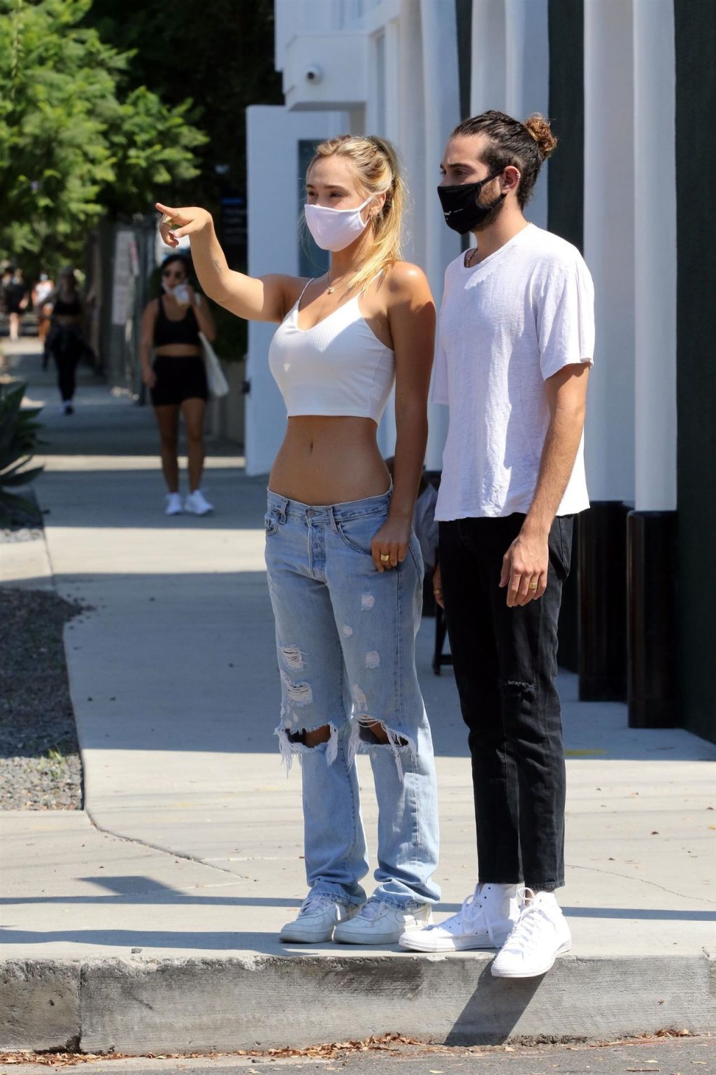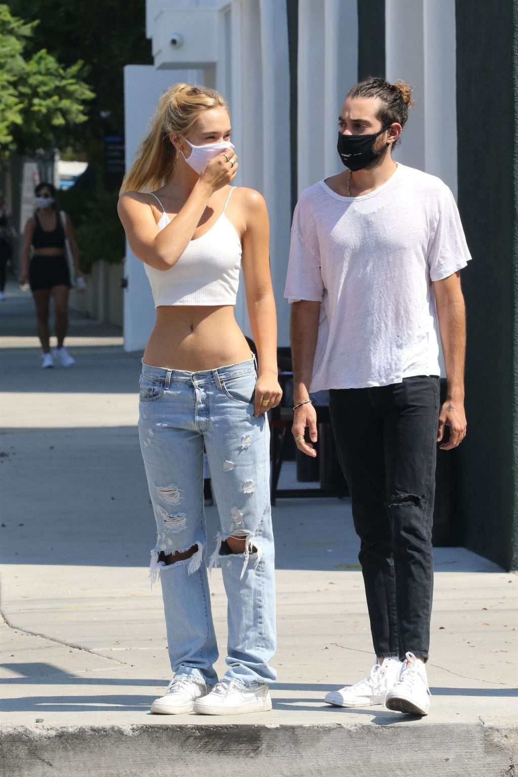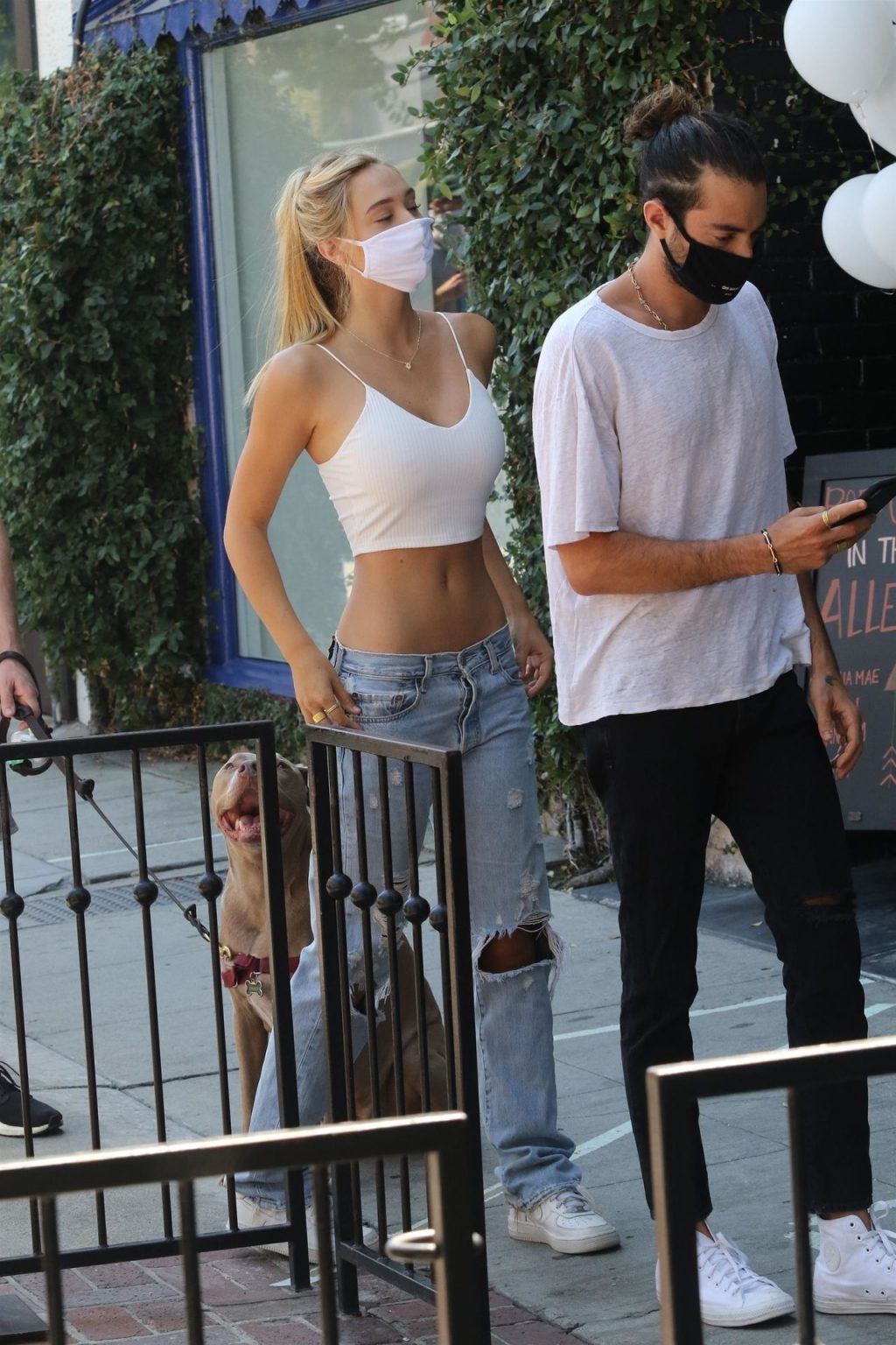 Alexis Ren se ve con una amiga comprando café helado Alfred y flores en el mercado de agricultores en un caluroso y soleado domingo (agosto de 2020).