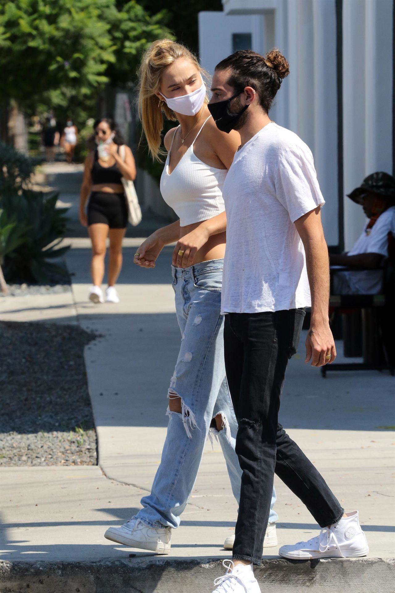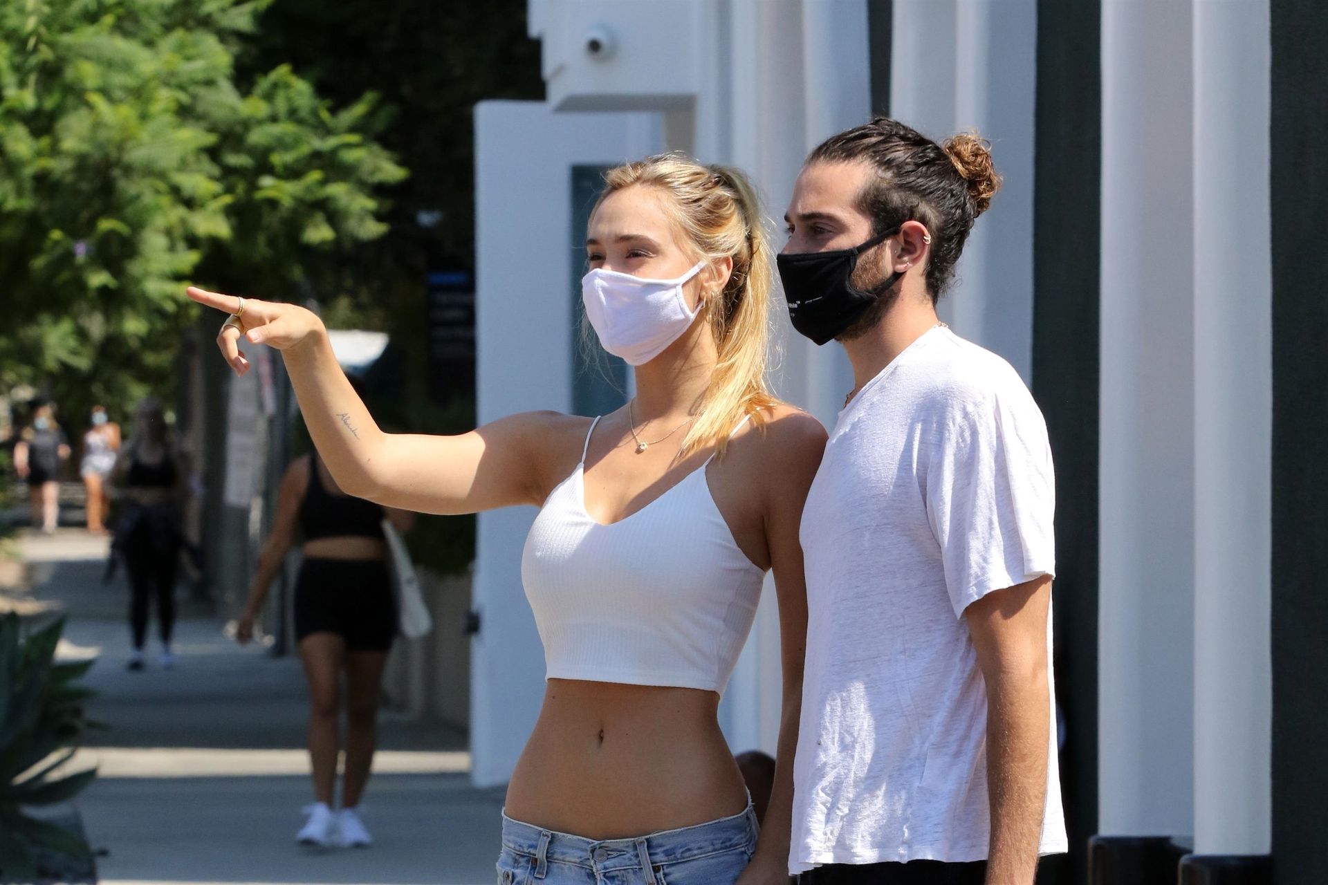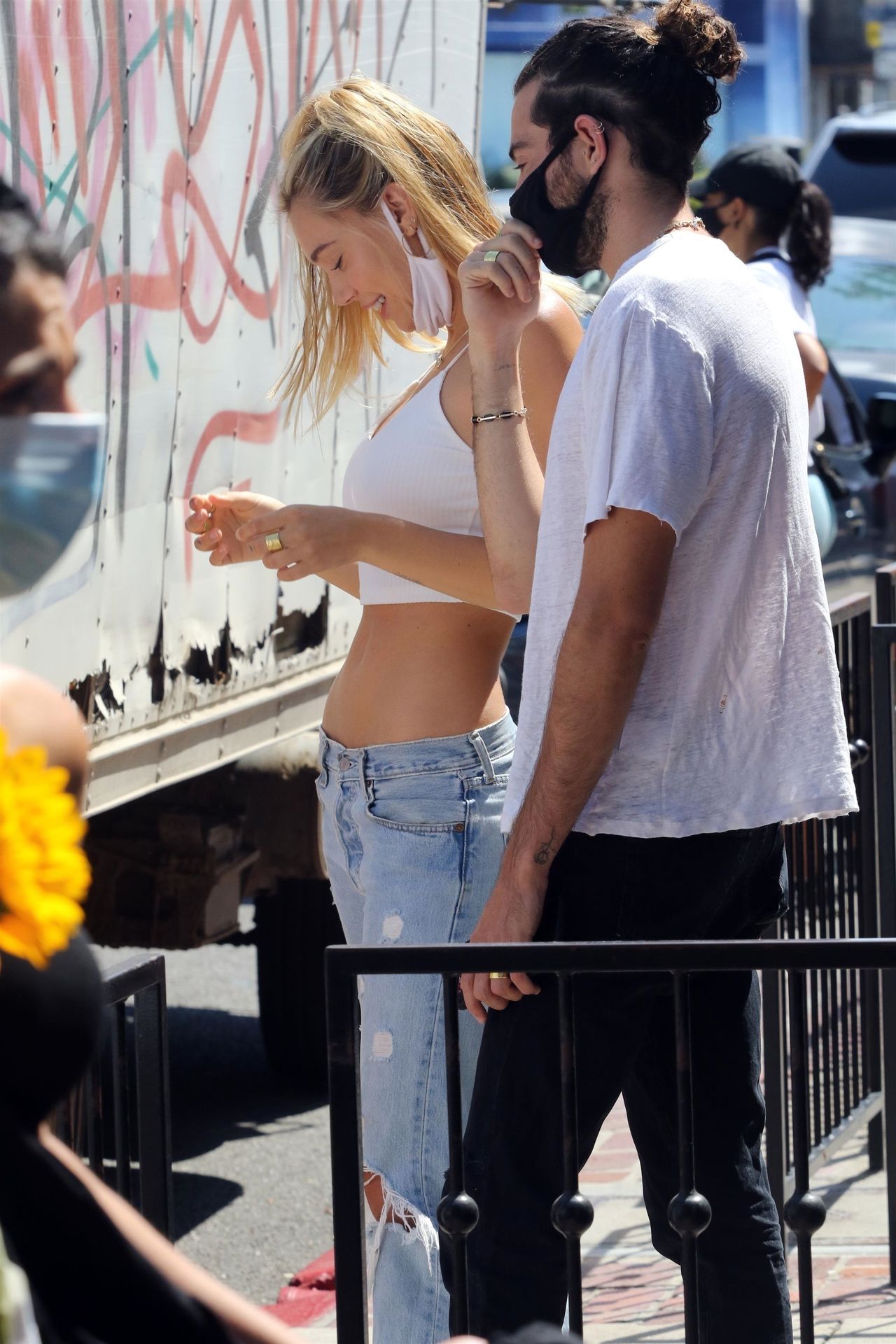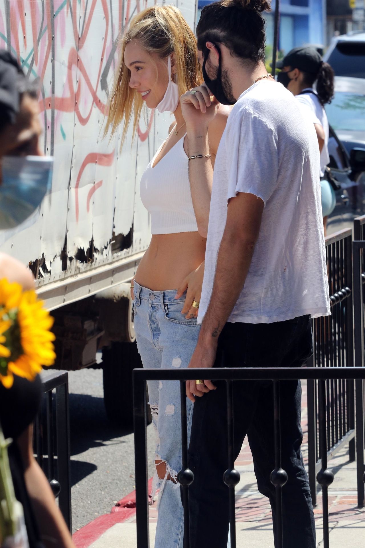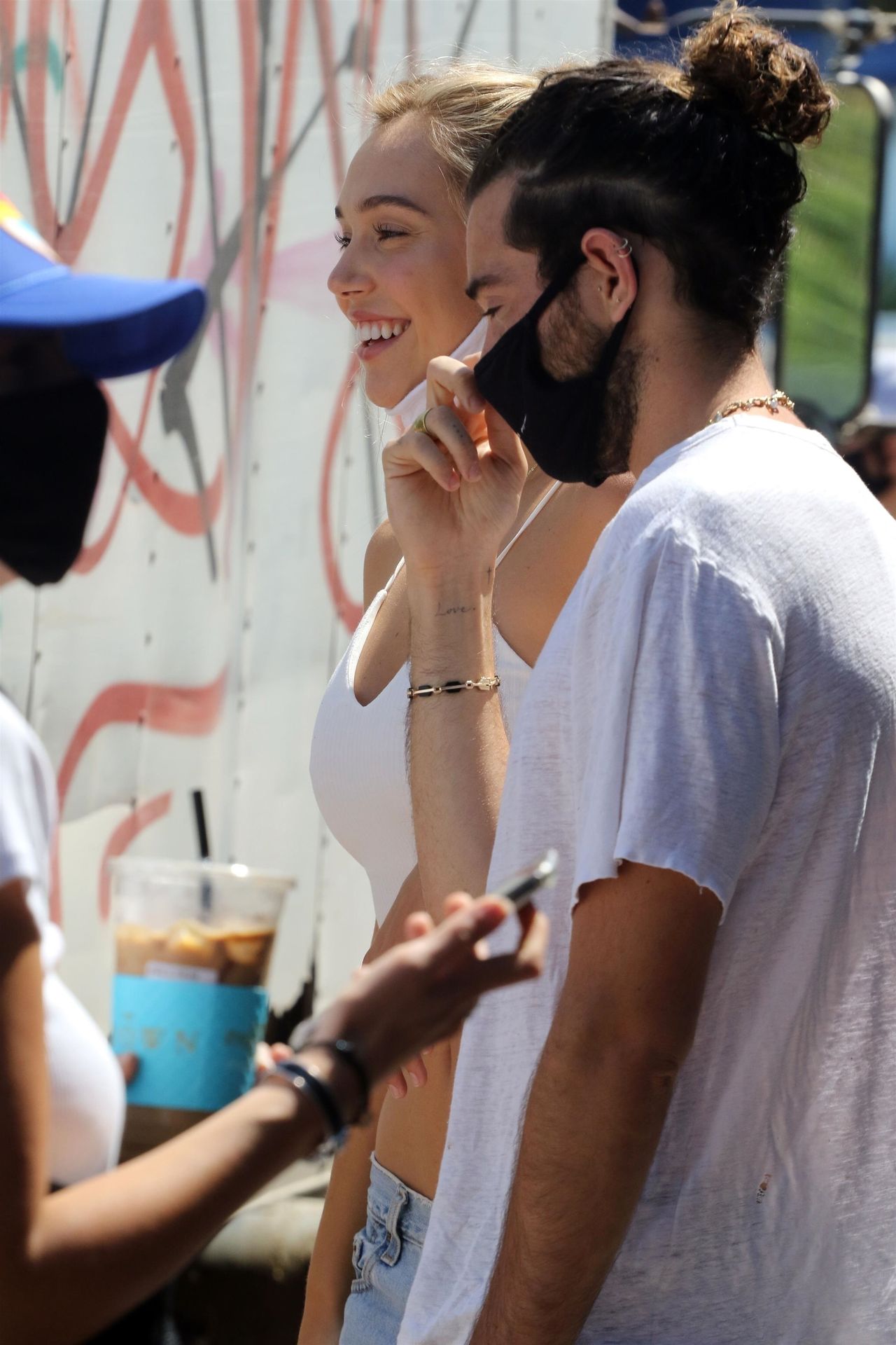 Alexis Ren se ve con una amiga comprando café helado Alfred y flores en el mercado de agricultores en un caluroso y soleado domingo (agosto de 2020).