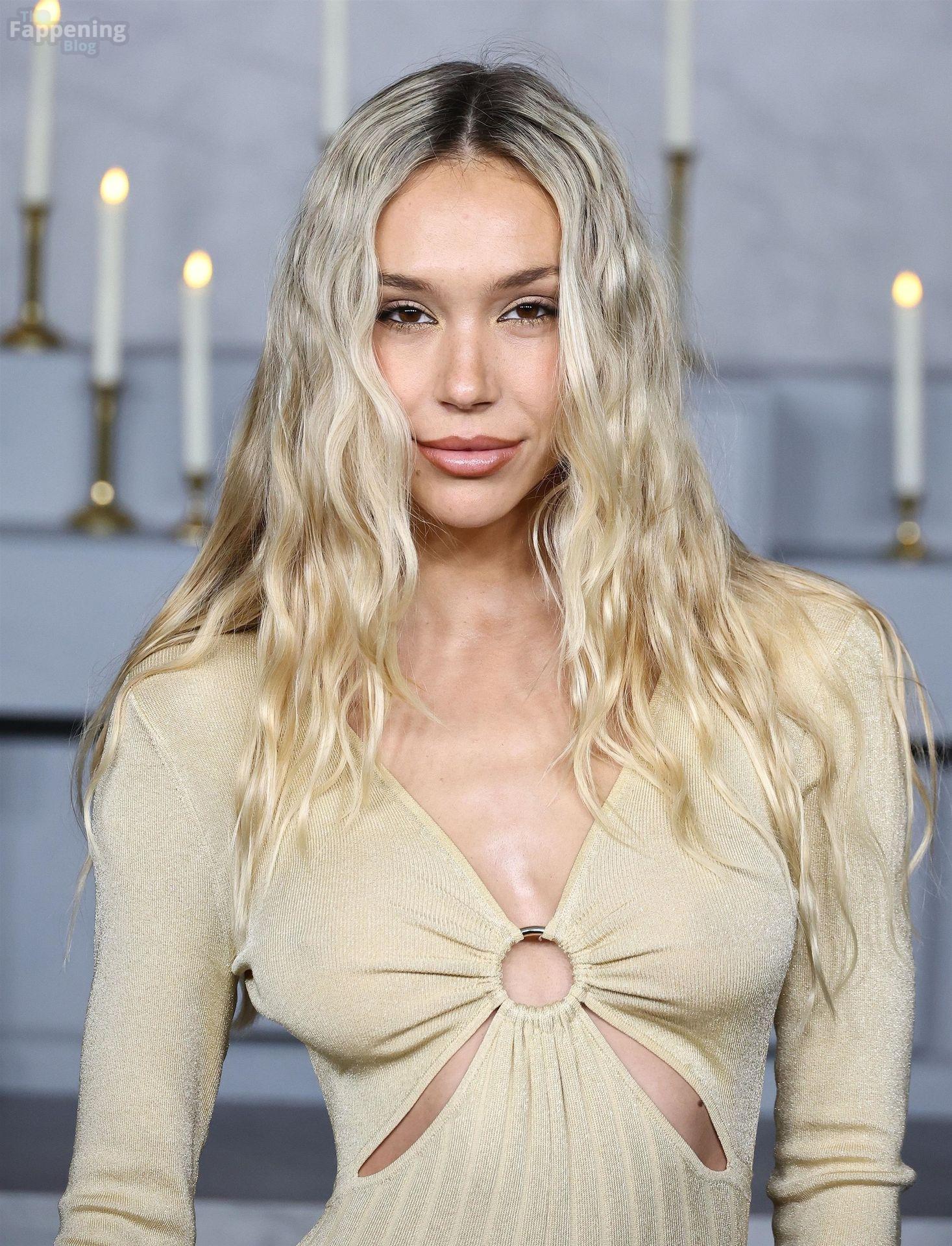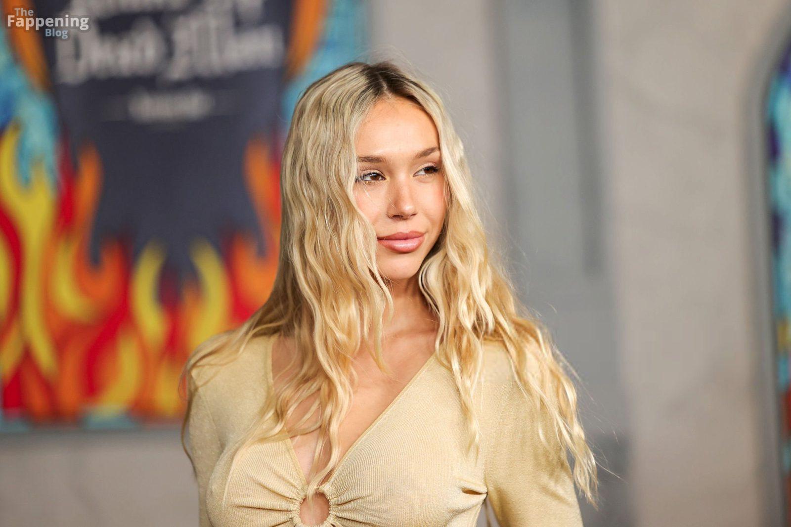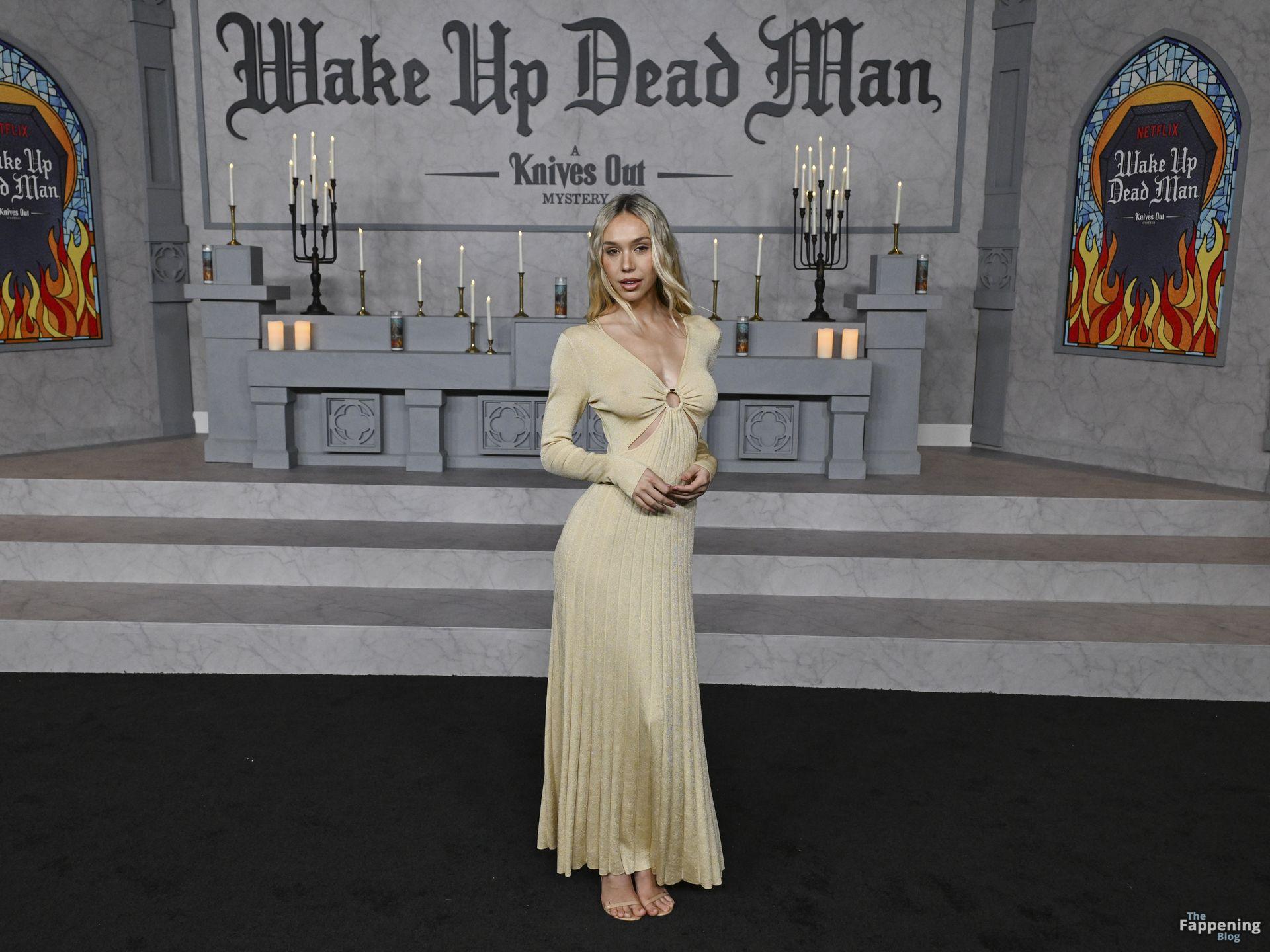 Alexis Ren luce espectacular con un vestido ajustado con recortes en el estreno en Los Ángeles de ‘Wake Up Dead Man: A Knives Out Mystery”.