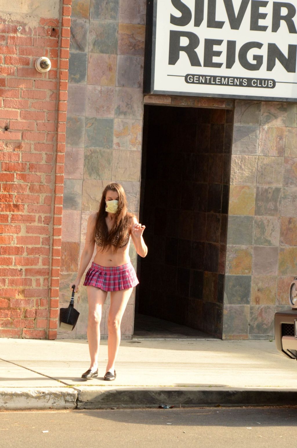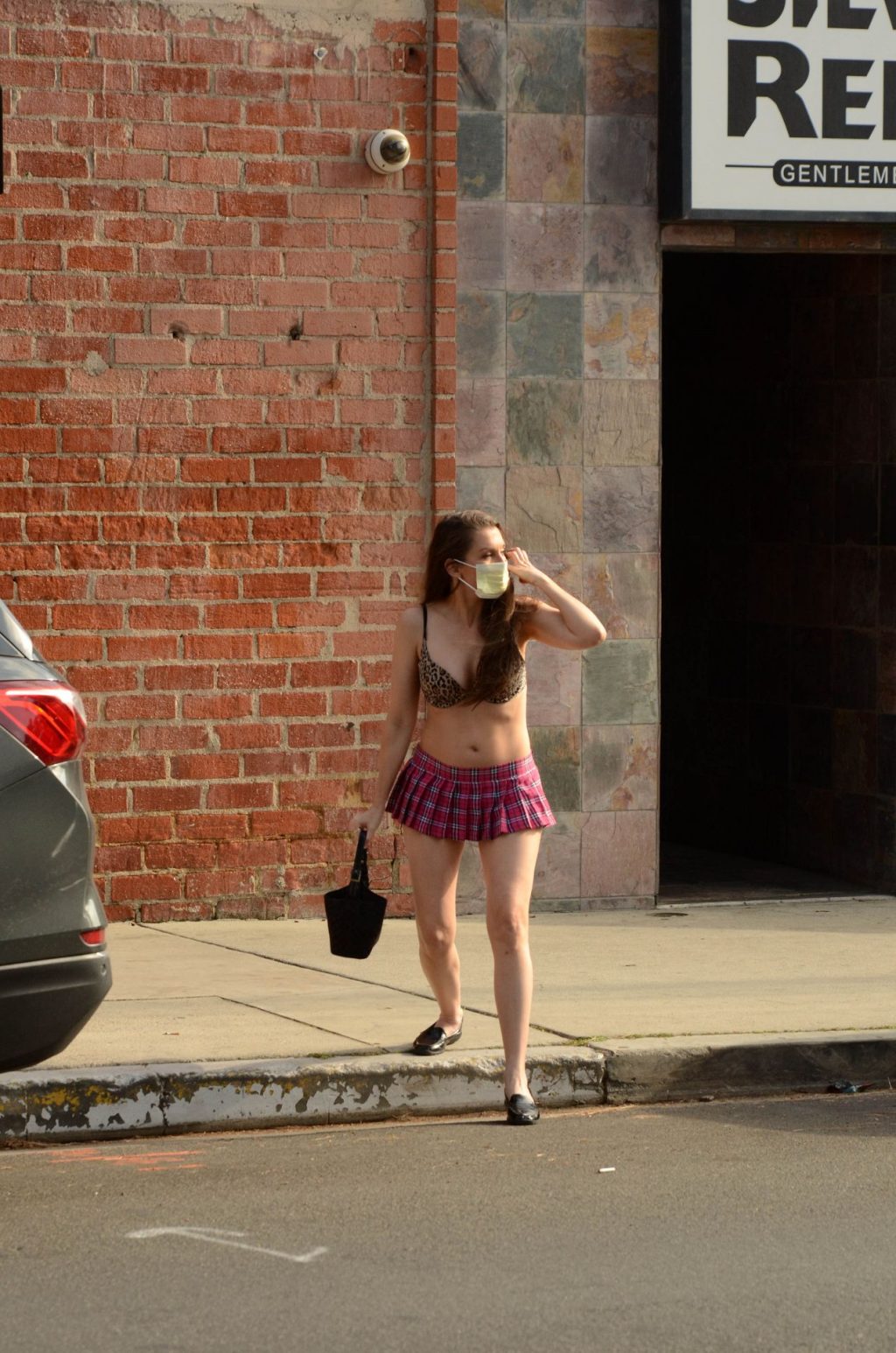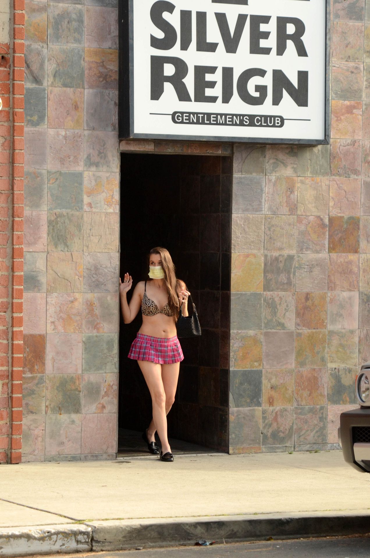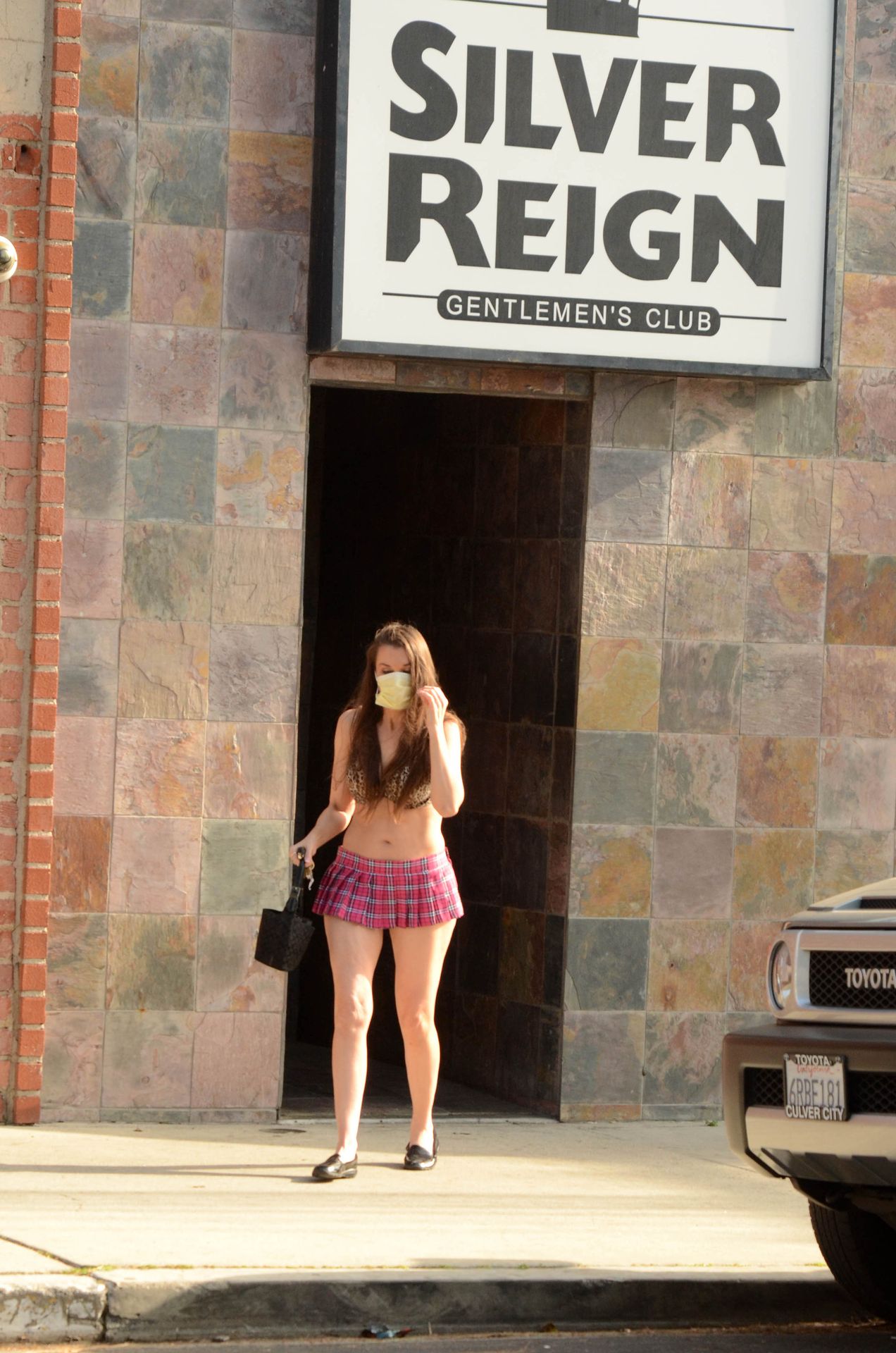 “Baywatch” actriz Alicia Arden fue vista en un club de striptease usando una mascarilla médica y una microfalda atrevida aparentemente sin ropa interior en Los Ángeles, 18/03/2020.