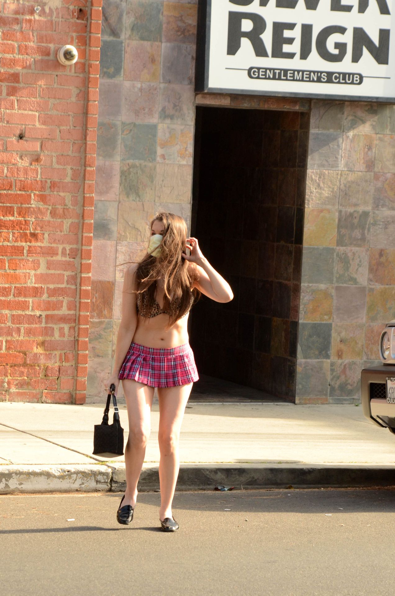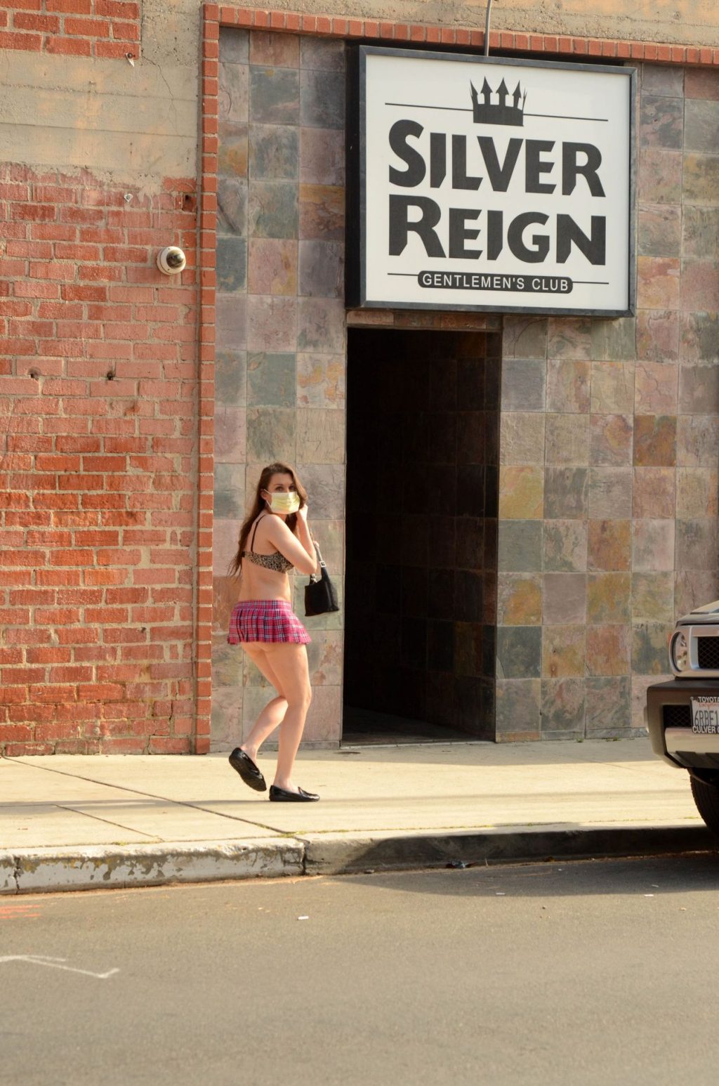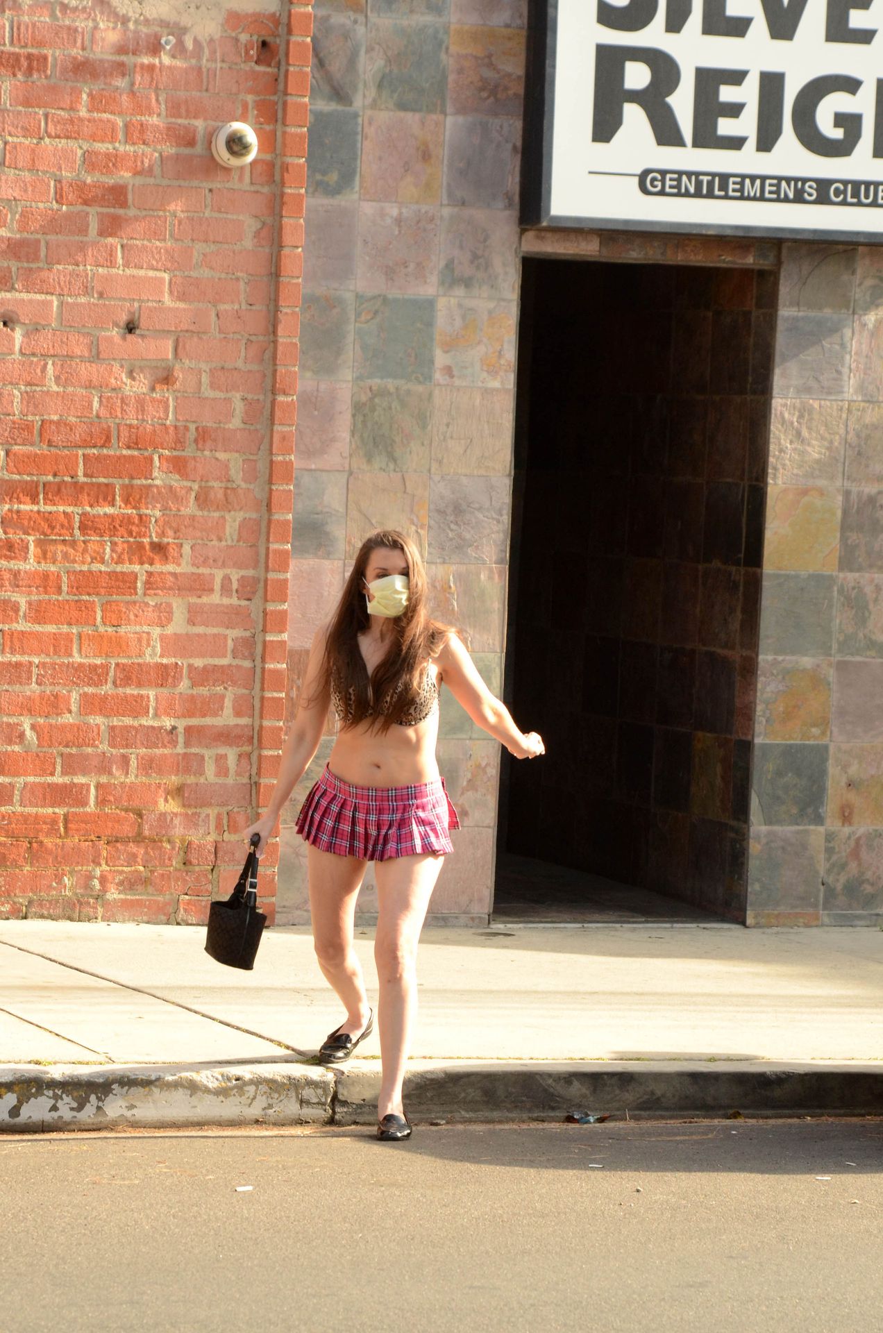 “Baywatch” actriz Alicia Arden fue vista en un club de striptease usando una mascarilla médica y una microfalda atrevida aparentemente sin ropa interior en Los Ángeles, 18/03/2020.