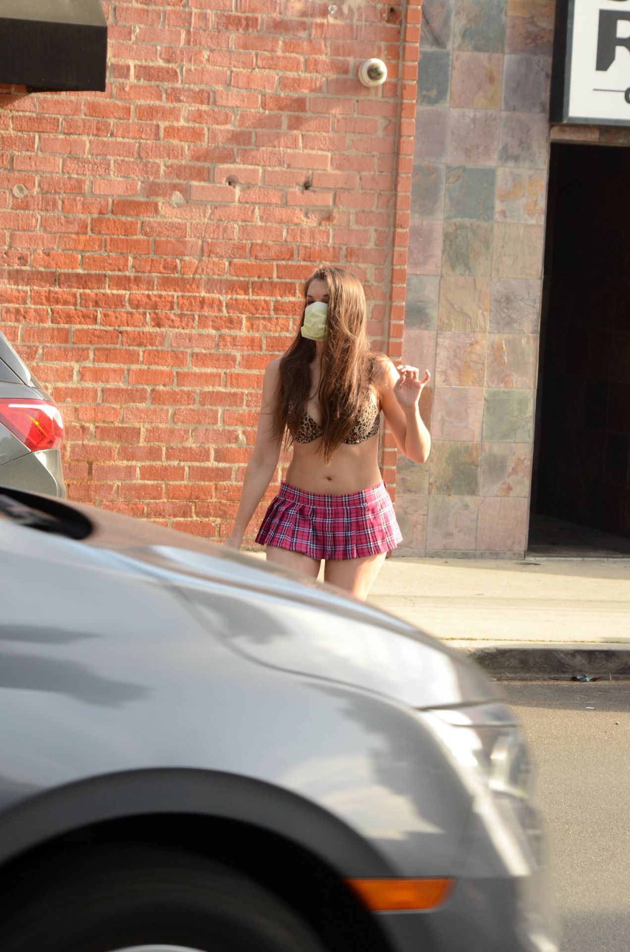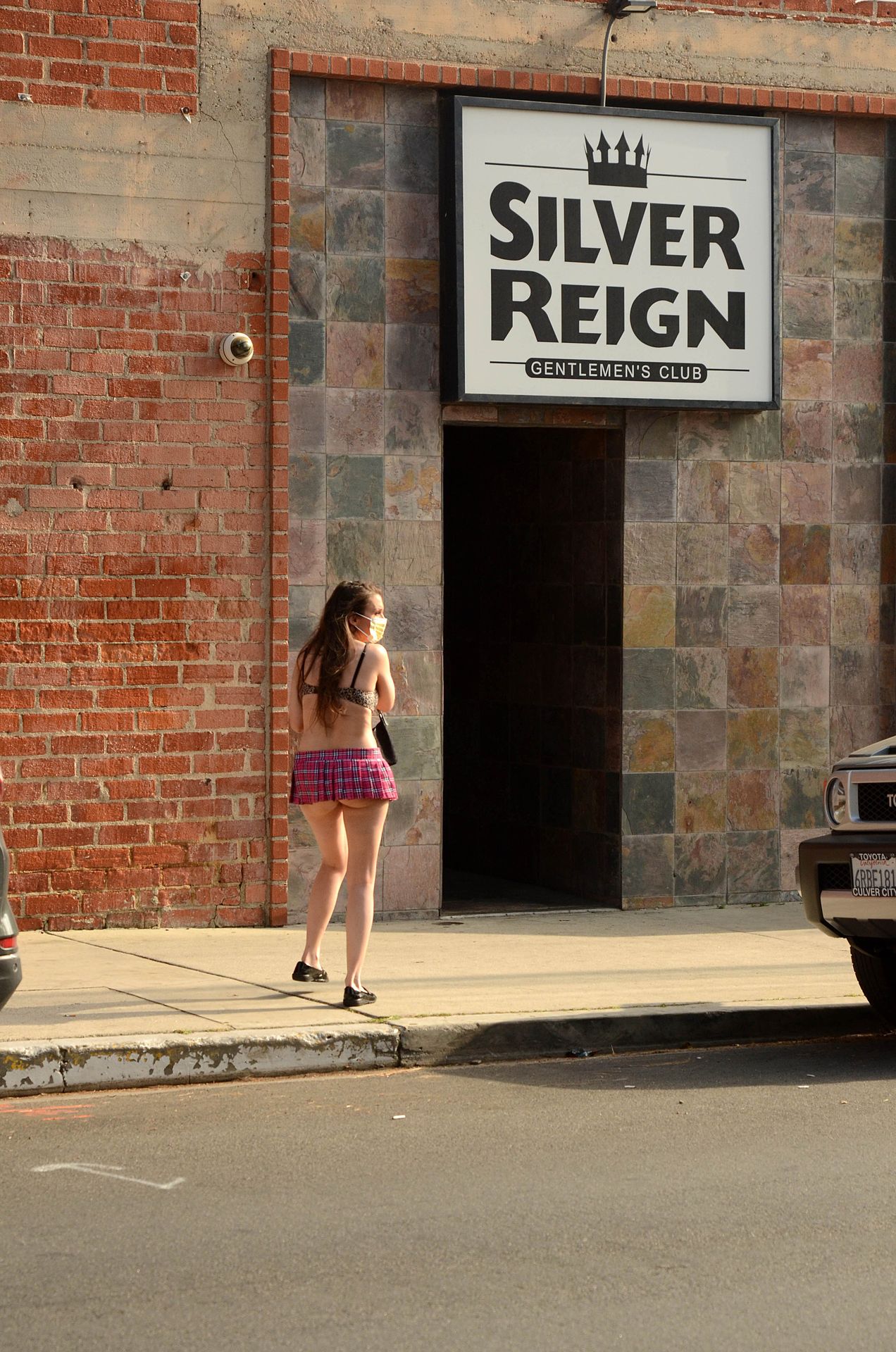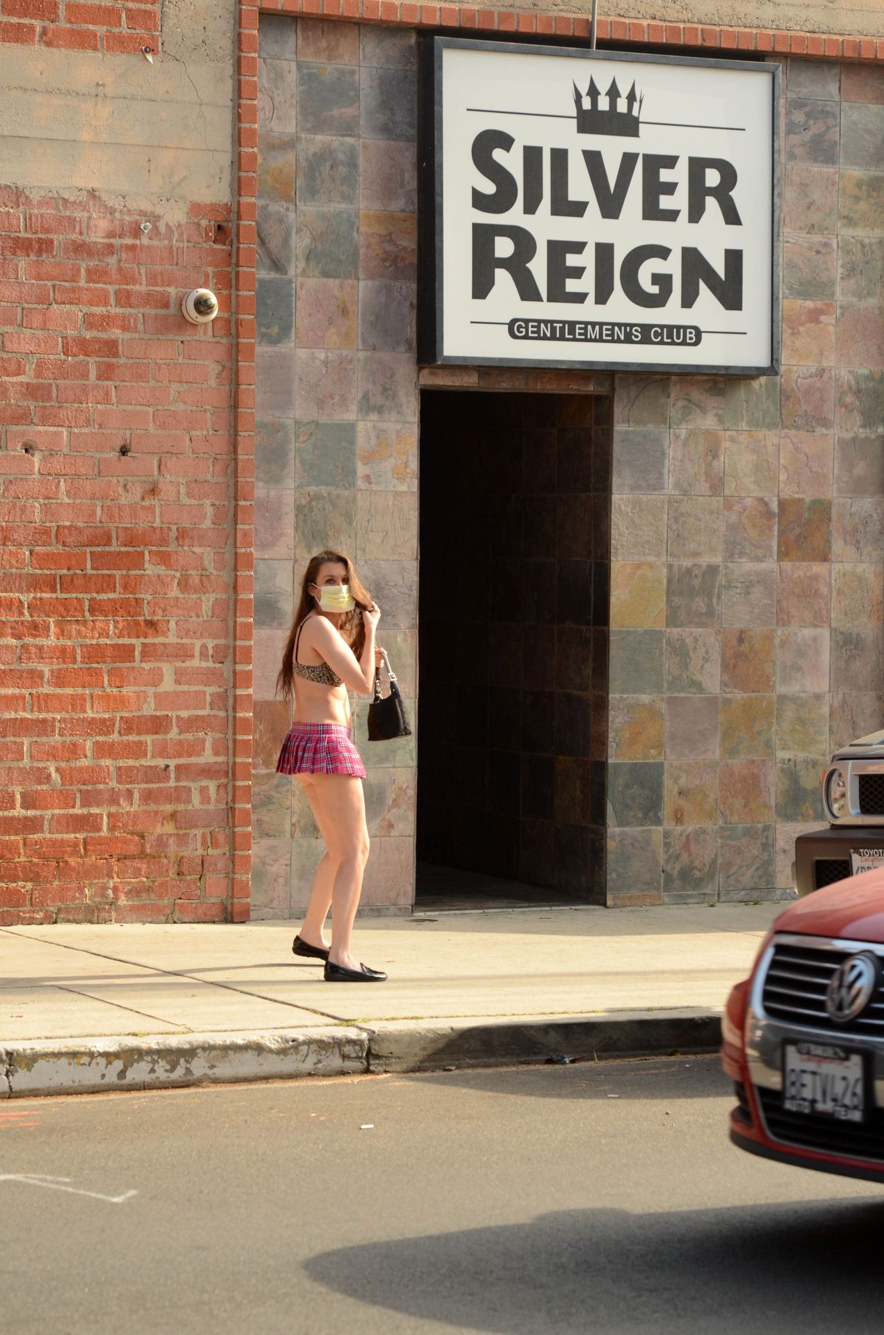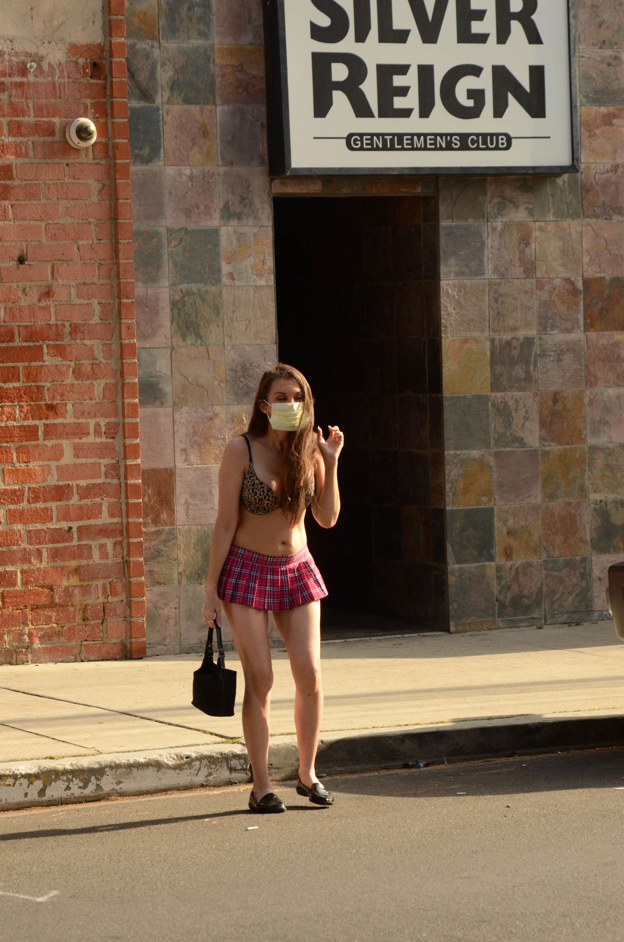 “Baywatch” actriz Alicia Arden fue vista en un club de striptease usando una mascarilla médica y una microfalda atrevida aparentemente sin ropa interior en Los Ángeles, 18/03/2020.