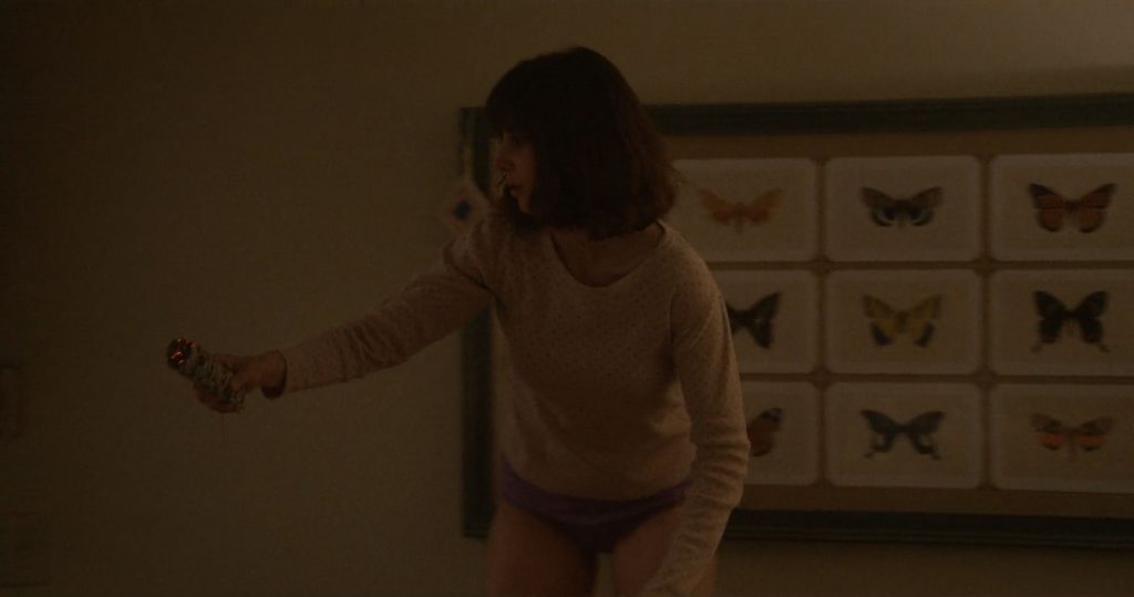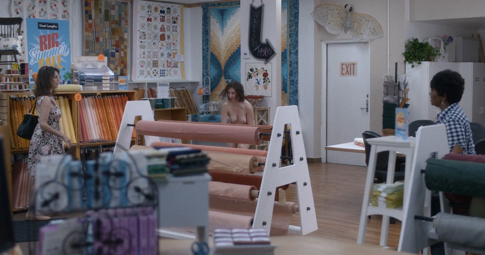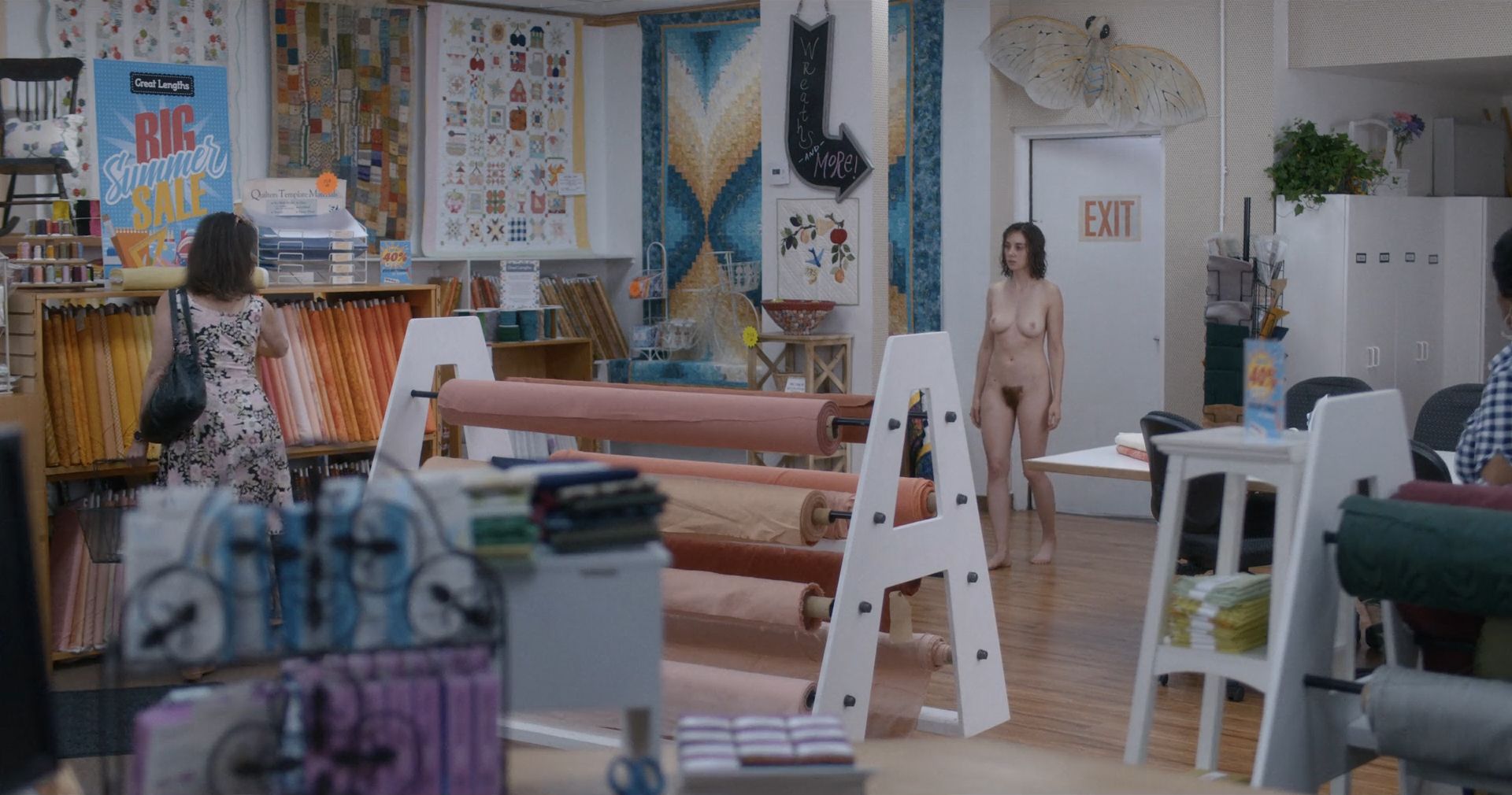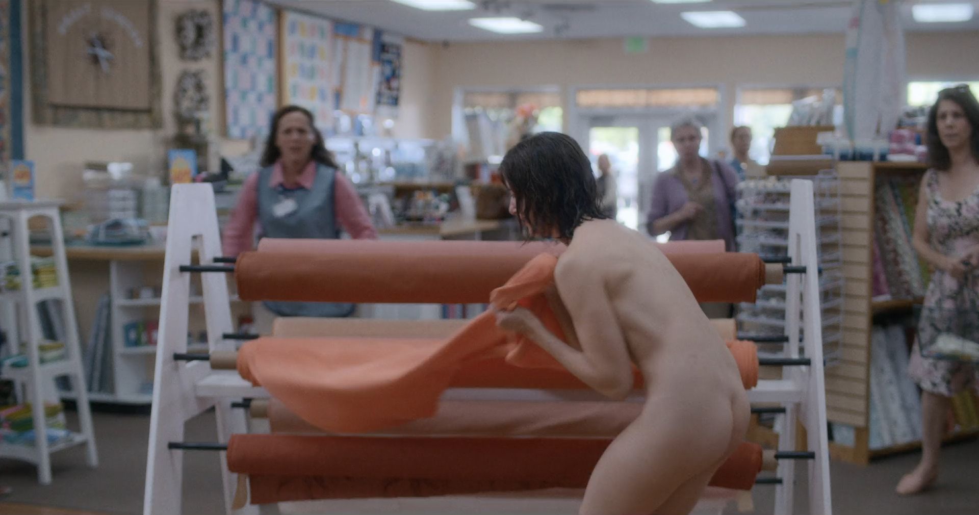 Mira la escena desnuda de Alison Brie en “Horse Girl” (2020), donde camina completamente desnuda por el suelo de la tienda, sus pechos y merkin son visibles mientras avanza, y la gente la mira. Luego, la estrella de The Fappening se acerca al perchero y se arrodilla antes de que alguien la ayude a cubrirse, envolviéndola en tela.