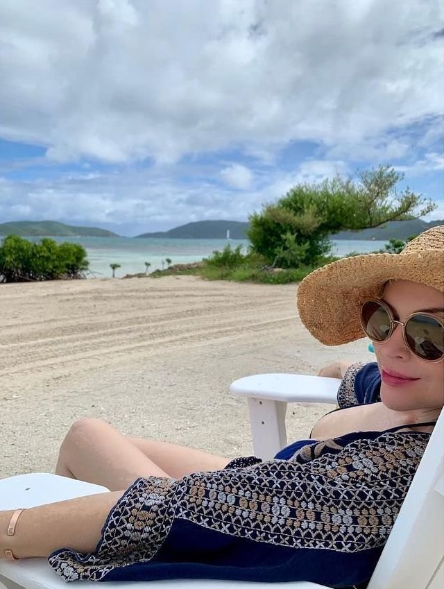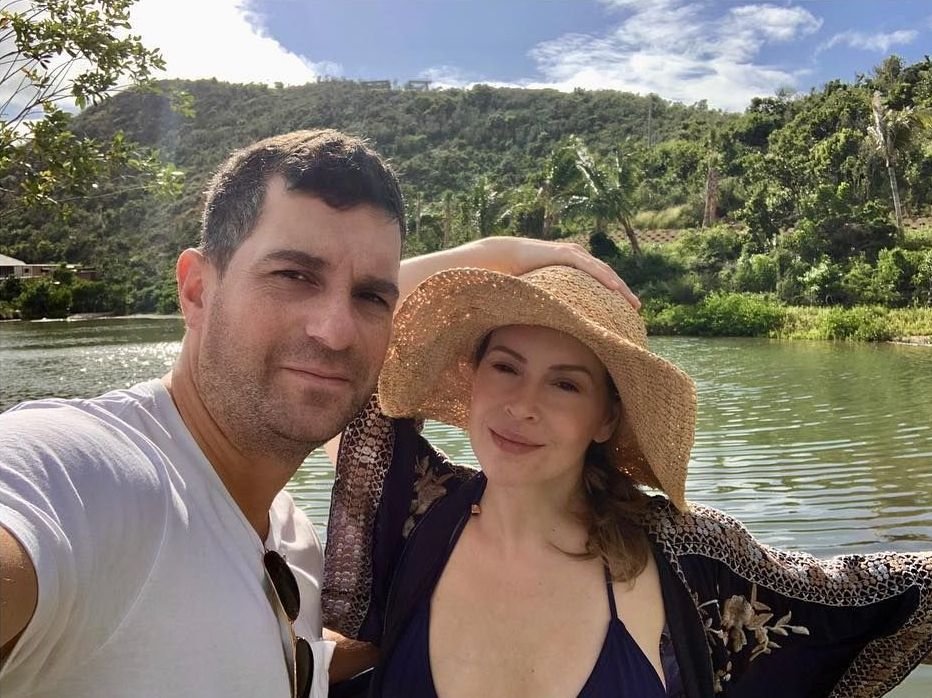 Alyssa Milano compartió algunas fotos sexys en Instagram, 12/08/2018. La actriz de 45 años fue fotografiada usando un top de bikini azul durante sus vacaciones en Necker Island.
