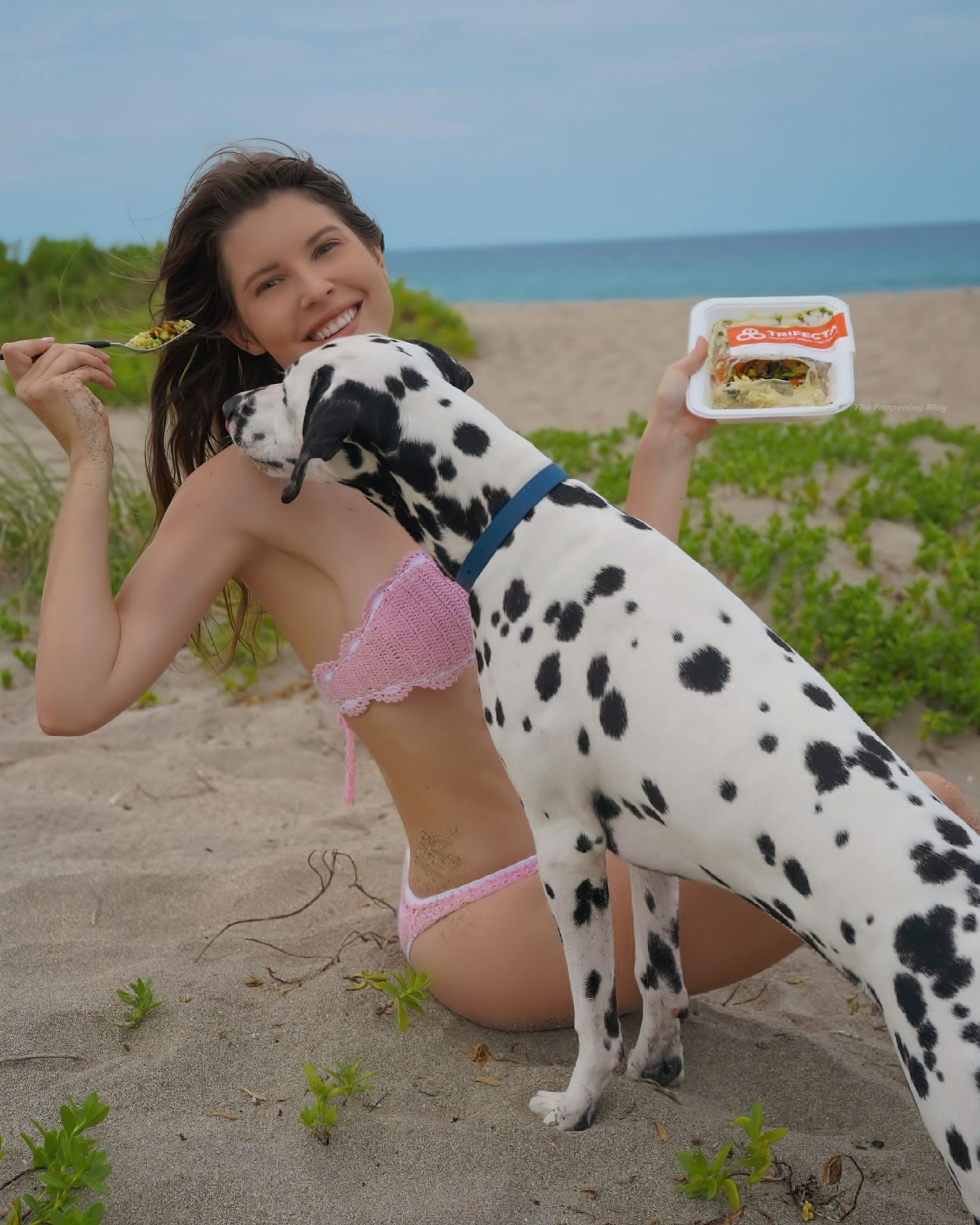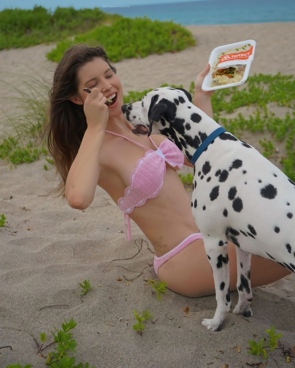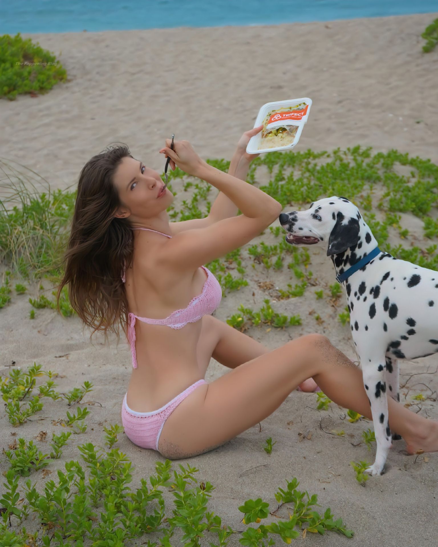 Amanda Cerny disfruta un día con su perro en la playa. La modelo muestra su lindo trasero y cintura delgada, posando en un bikini rosa para una nueva foto en redes sociales (mayo 2021).