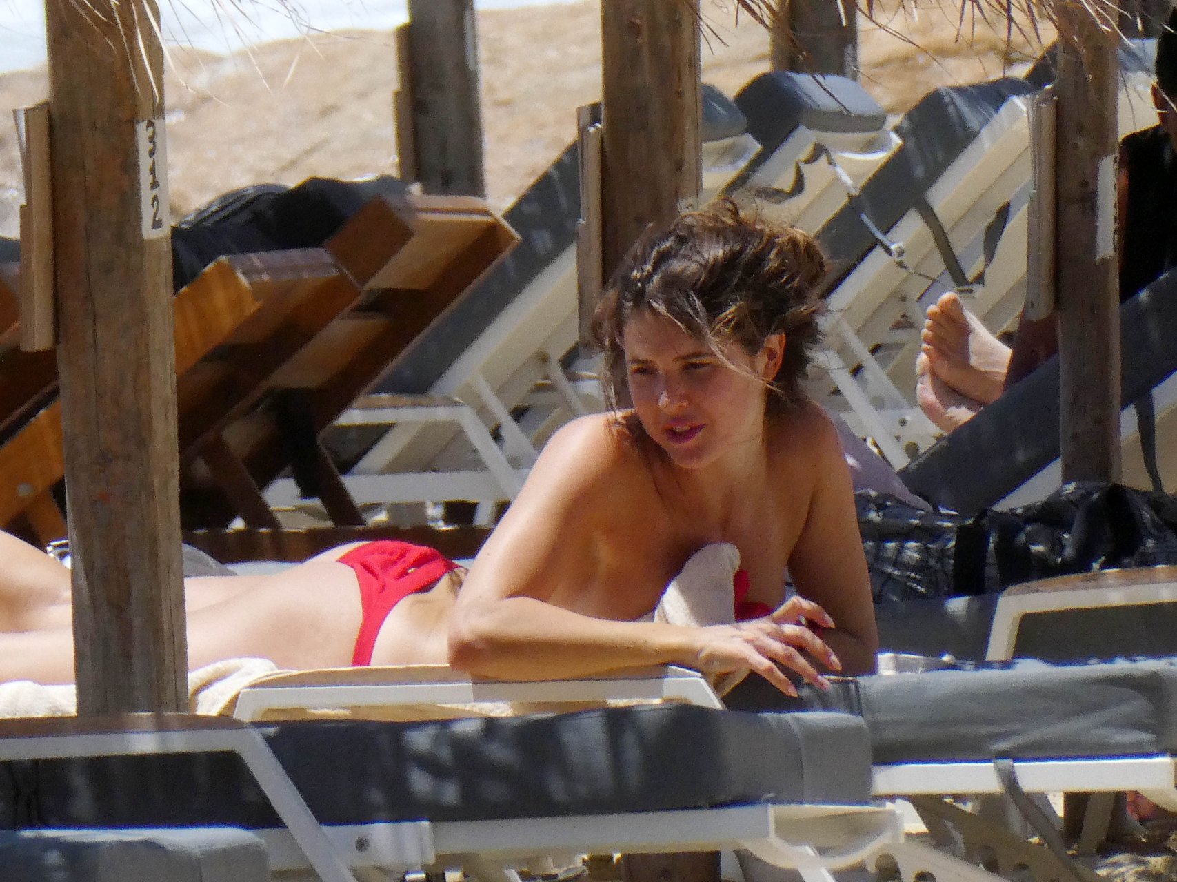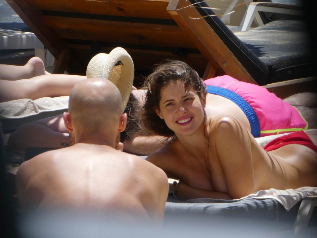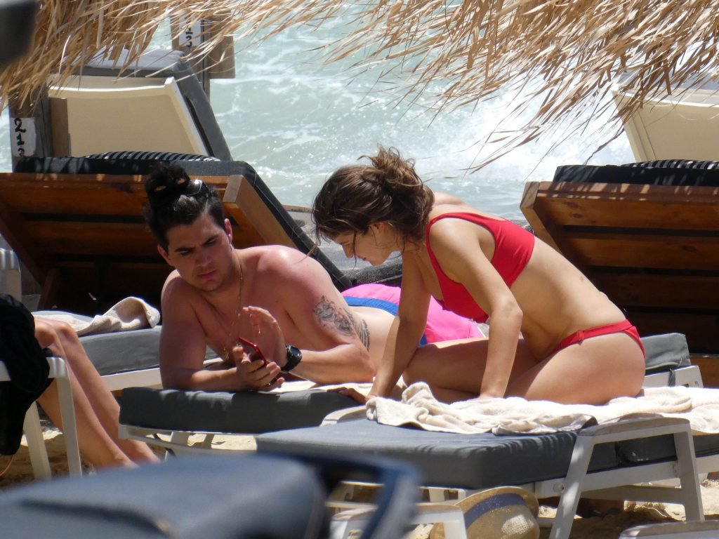 La actriz estadounidense, modelo y estrella de las redes sociales Amanda Cerny aparece desnuda de pecho en la playa de Mykonos con amigos y su pareja Johannes Bartl, 28/06/2018.