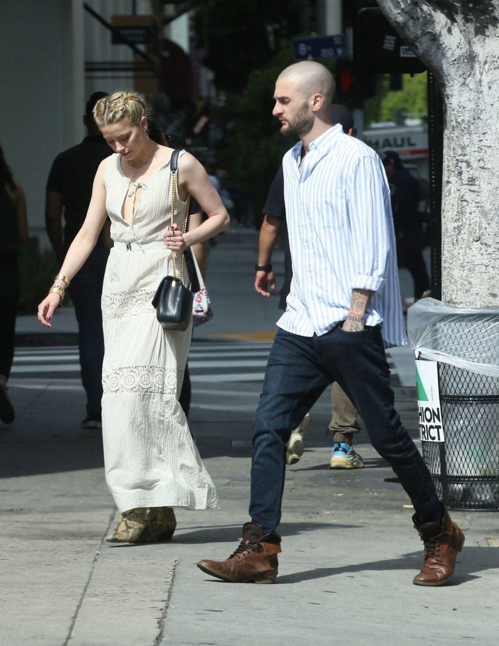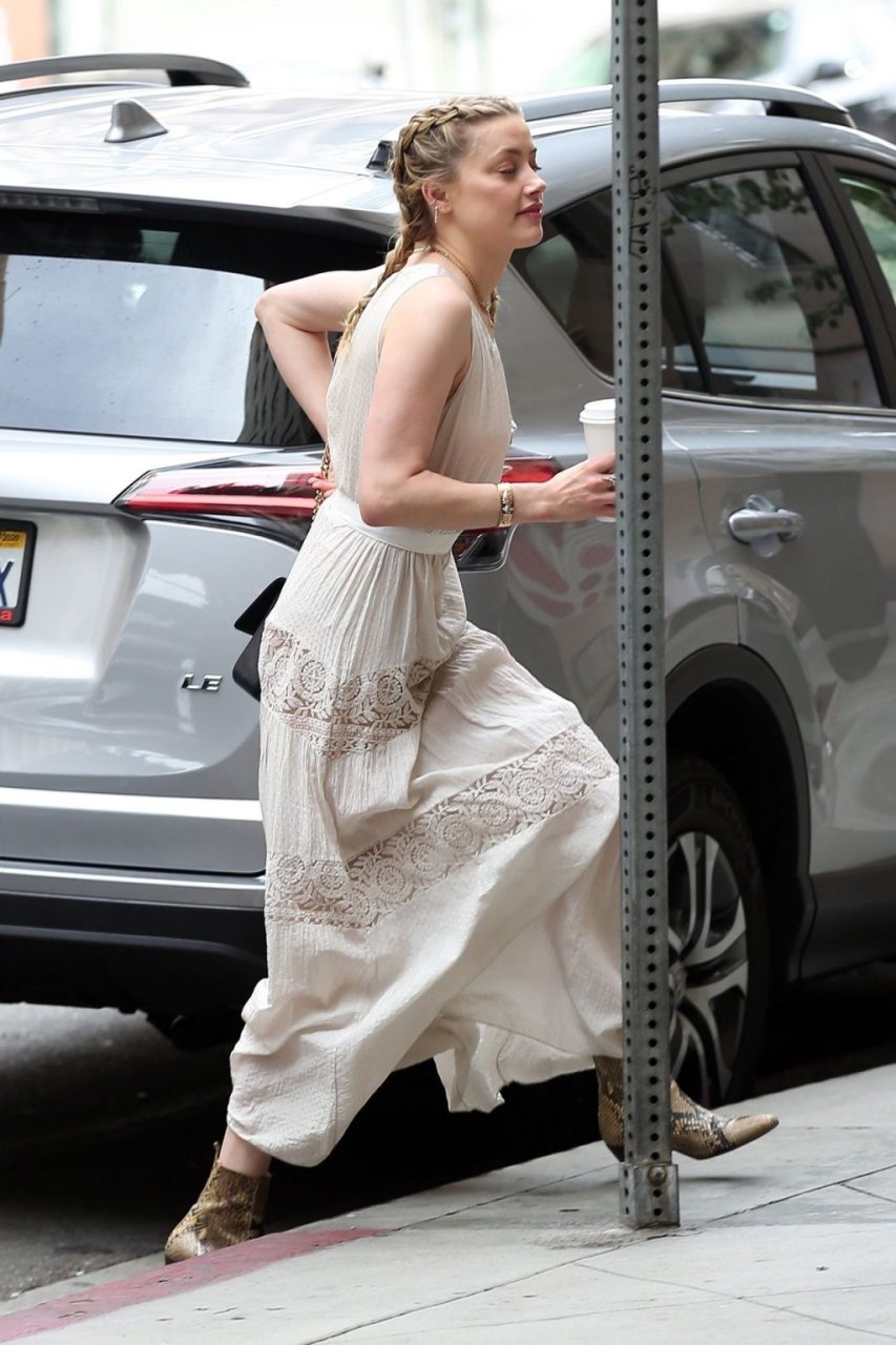 Amber Heard va a una reunión de negocios en el centro de Los Ángeles y luego almuerza con un hombre misterioso, 07/04/2019. La actriz de “Aquaman” fue sin maquillaje y mostró algo de escote con un vestido bohemio de escote bajo.