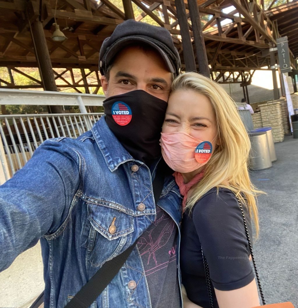 La estrella de The Fappening y actriz Amber Heard muestra sus tetas mientras posa con una camiseta negra transparente con la pegatina “I voted” – Instagram, 11/03/2020.