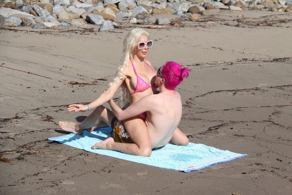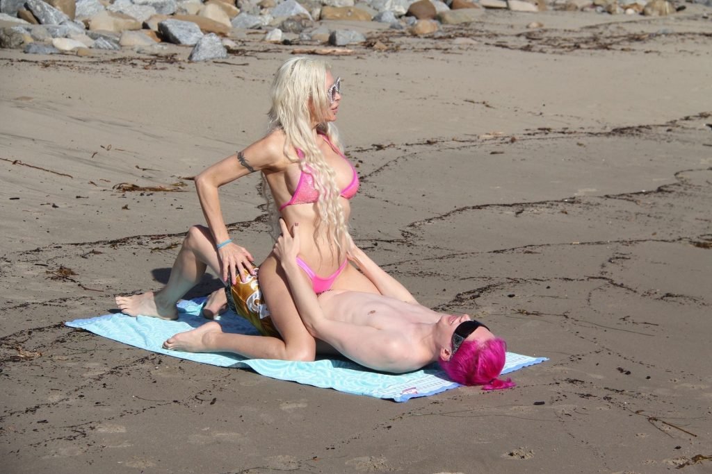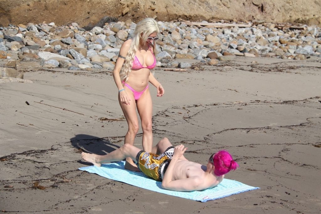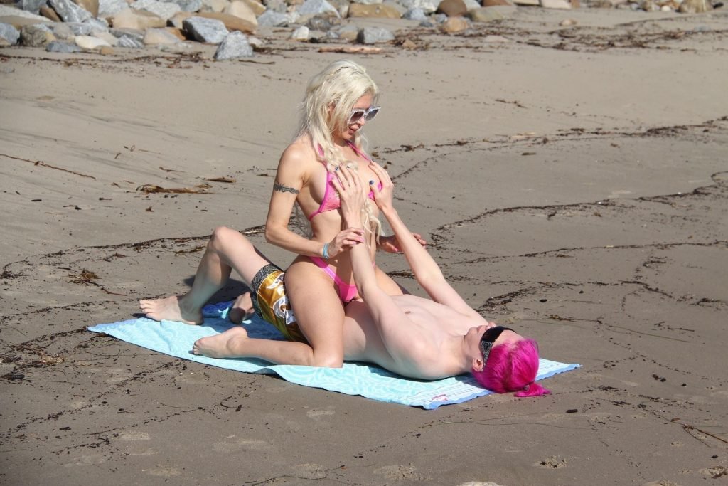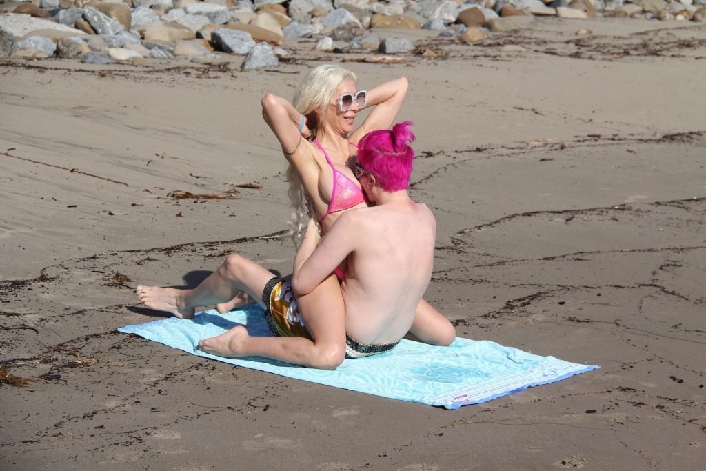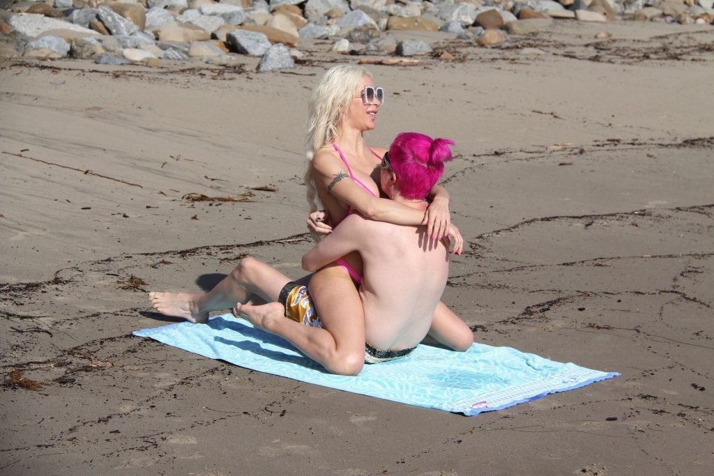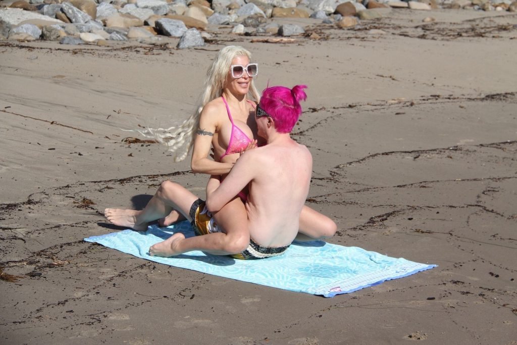 Angelique “Frenchy” Morgan y Oli London se ponen calientes y apasionados en la playa de Los Ángeles, 23/12/2018. Oli combina su cabello con el traje de baño de Frenchy mientras la pareja muestra mucha PDA mientras están acostados en la playa.