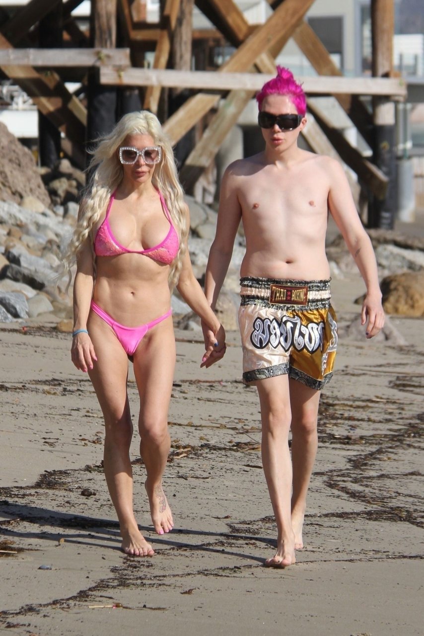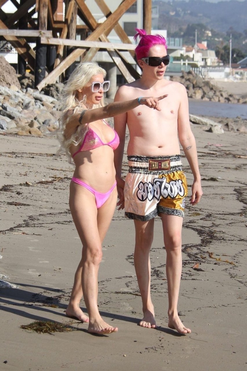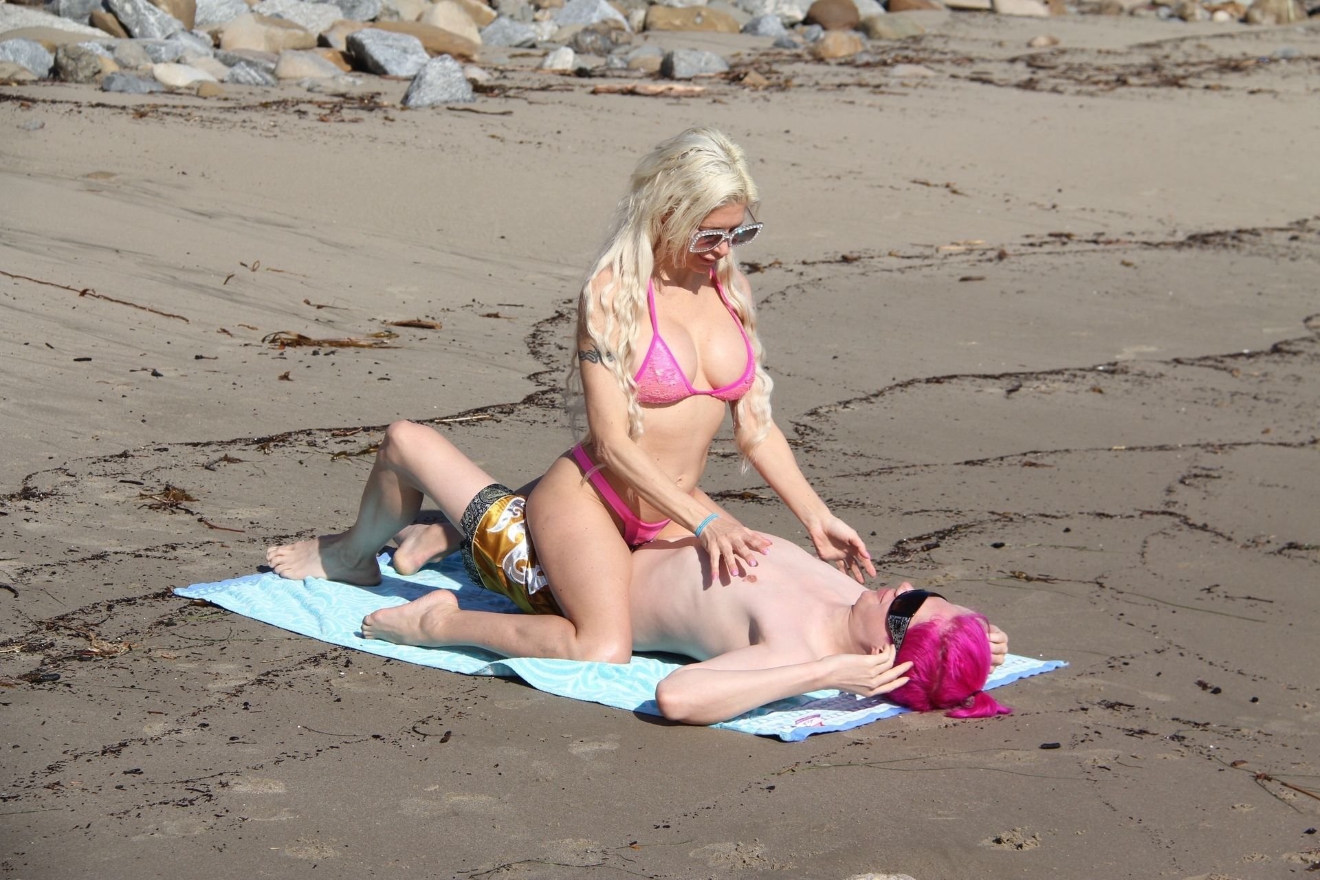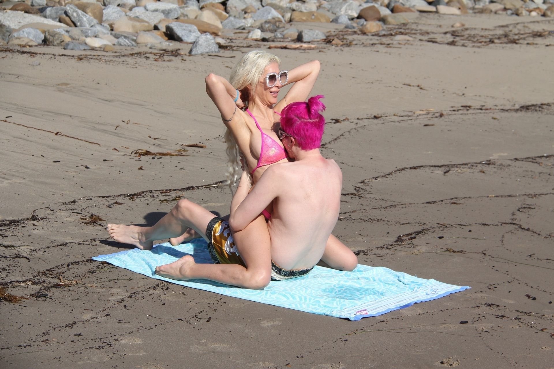 Angelique “Frenchy” Morgan y Oli London se ponen calientes y apasionados en la playa de Los Ángeles, 23/12/2018. Oli combina su cabello con el traje de baño de Frenchy mientras la pareja muestra mucha PDA mientras están acostados en la playa.