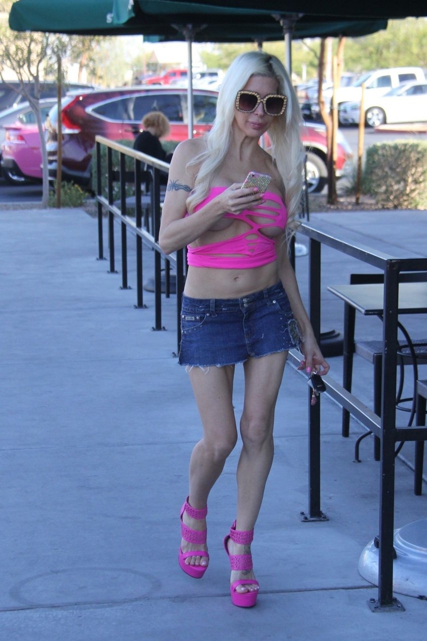 Milf rubia Angelique “Frenchy” Morgan opta por una blusa rosa mientras sale a tomar un café en Las Vegas, 13/12/2018. Frenchy fue vista con una blusa de tirantes y una falda corta de mezclilla mientras se dirige de regreso a su coche.