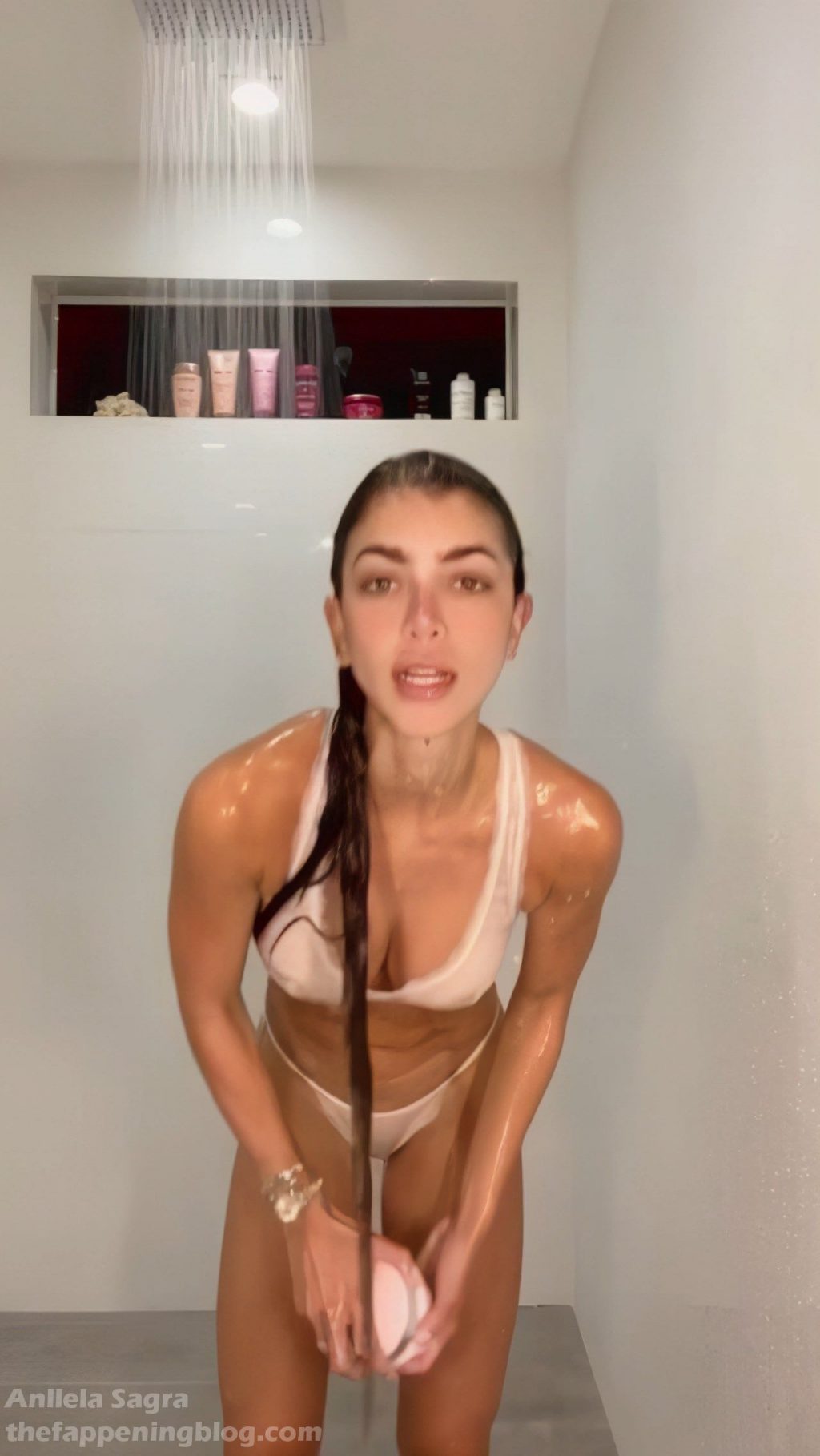 La modelo fitness Anllela Sagra muestra sus tetas ligeramente desnudas con lencería de encaje mientras posa mojada en la ducha – Instagram, 09/03/2020.