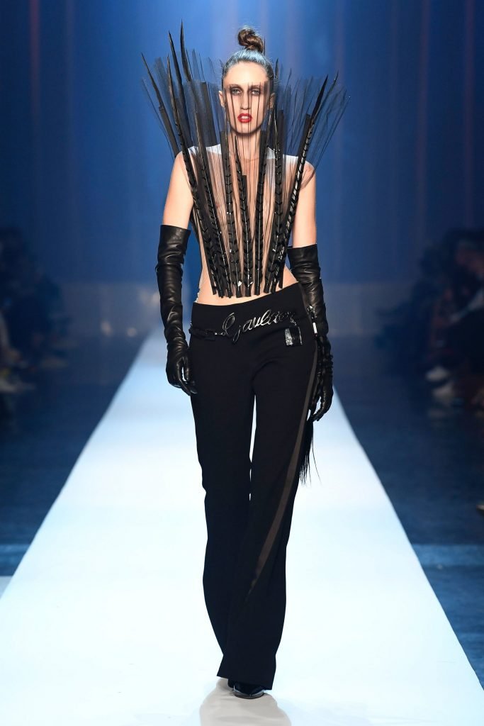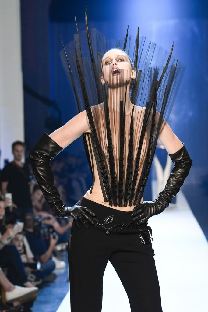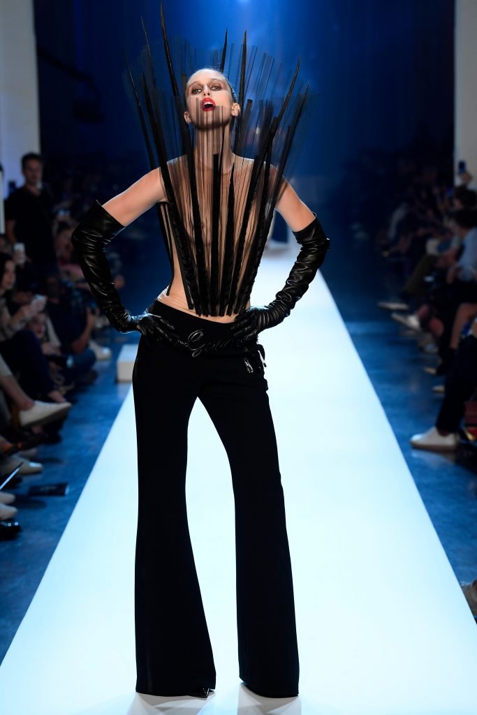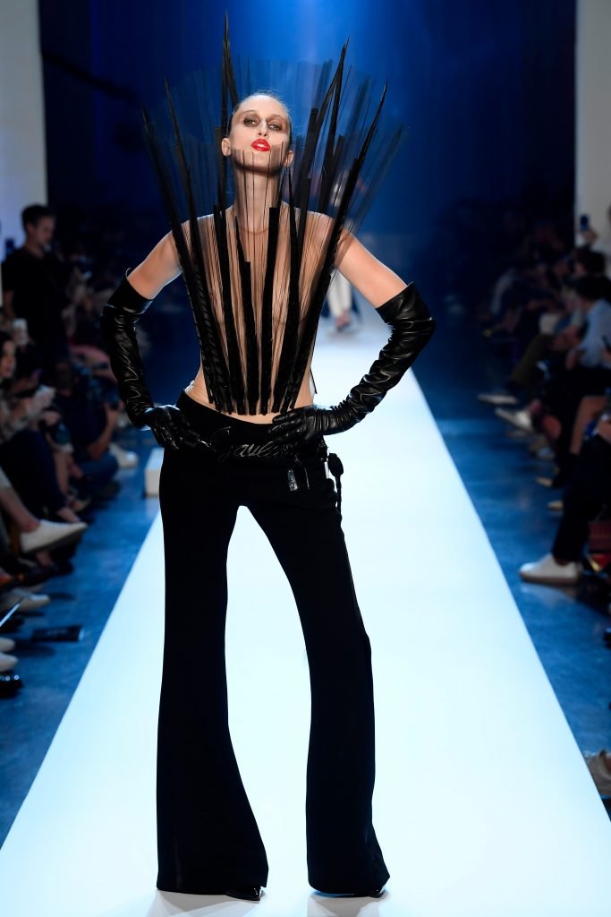 Model Anna Cleveland camina por la pasarela durante la Semana de la Moda Haute Couture de Jean-Paul Gaultier en París Otoño/Invierno 2018/19, celebrada en París, Francia, 07/04/2018. Anna llevaba una blusa extraña sin sujetador.