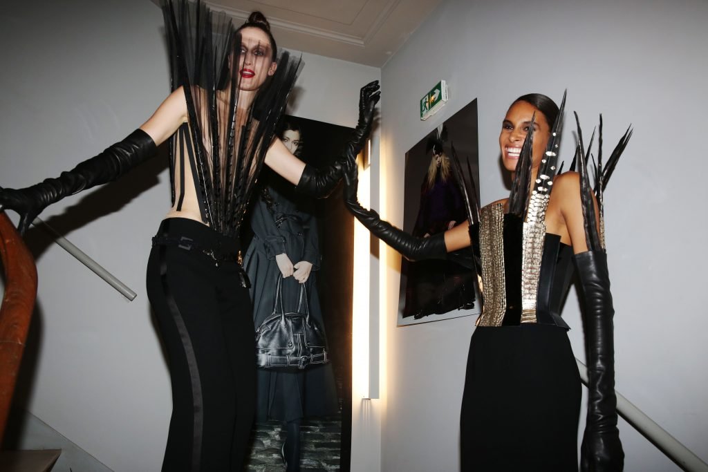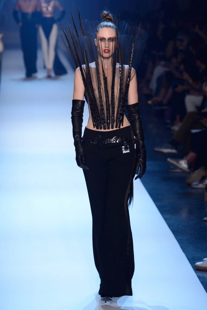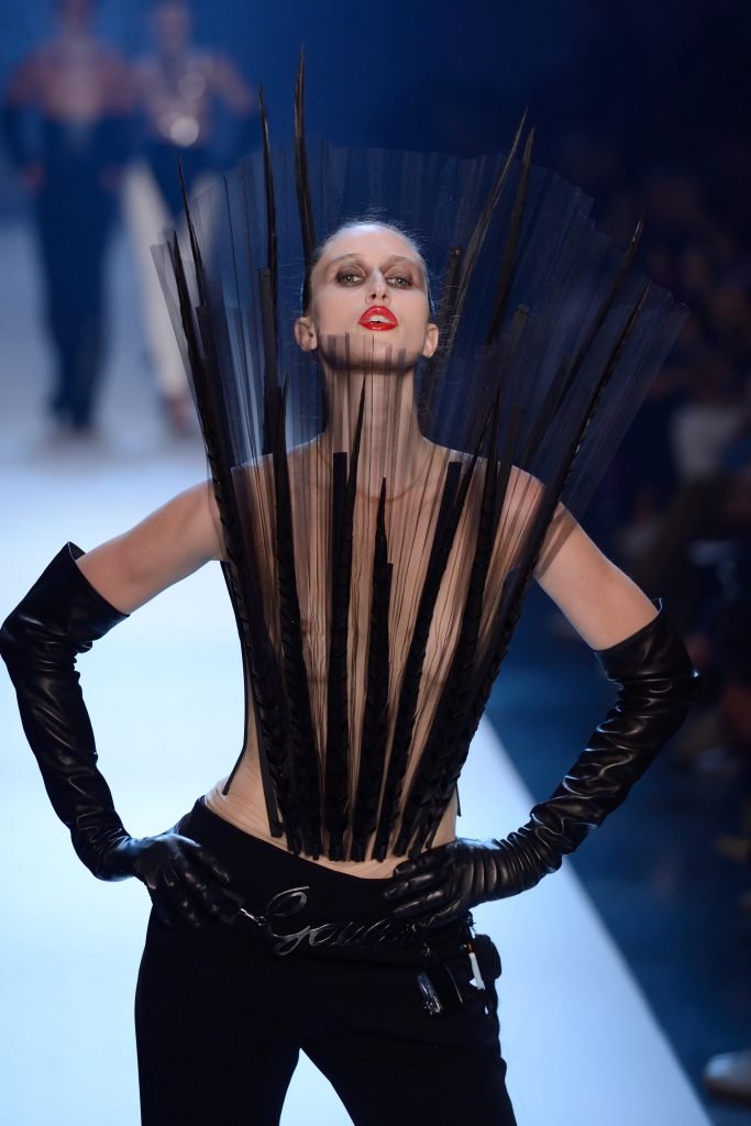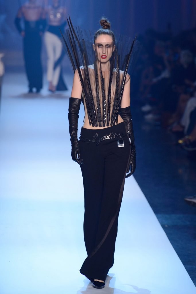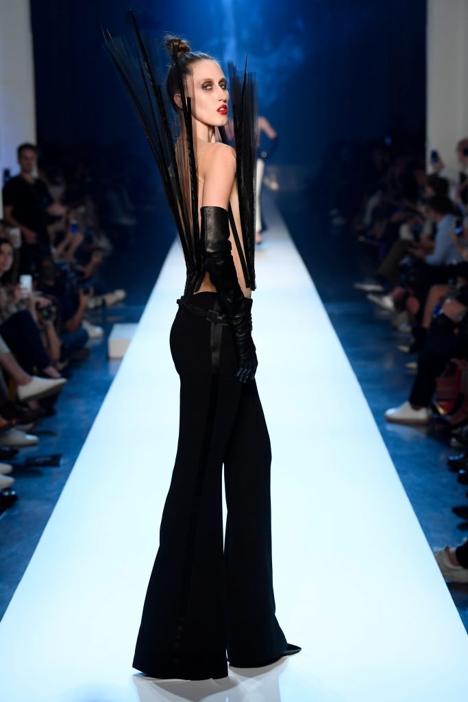 Model Anna Cleveland camina por la pasarela durante la Semana de la Moda Haute Couture de Jean-Paul Gaultier en París Otoño/Invierno 2018/19, celebrada en París, Francia, 07/04/2018. Anna llevaba una blusa extraña sin sujetador.