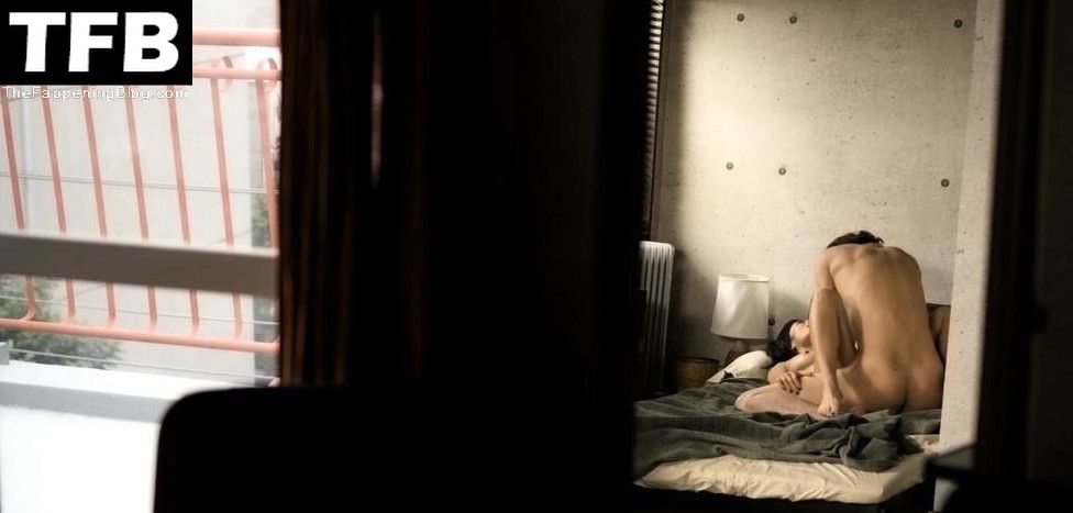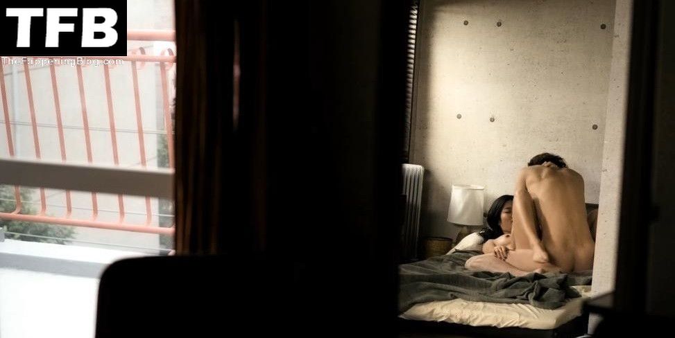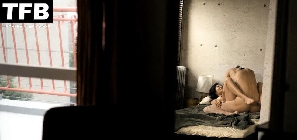 Anna Sawai is seen from across a room as she lies naked on her back on a bed having sex with a guy, one of her breasts in view.