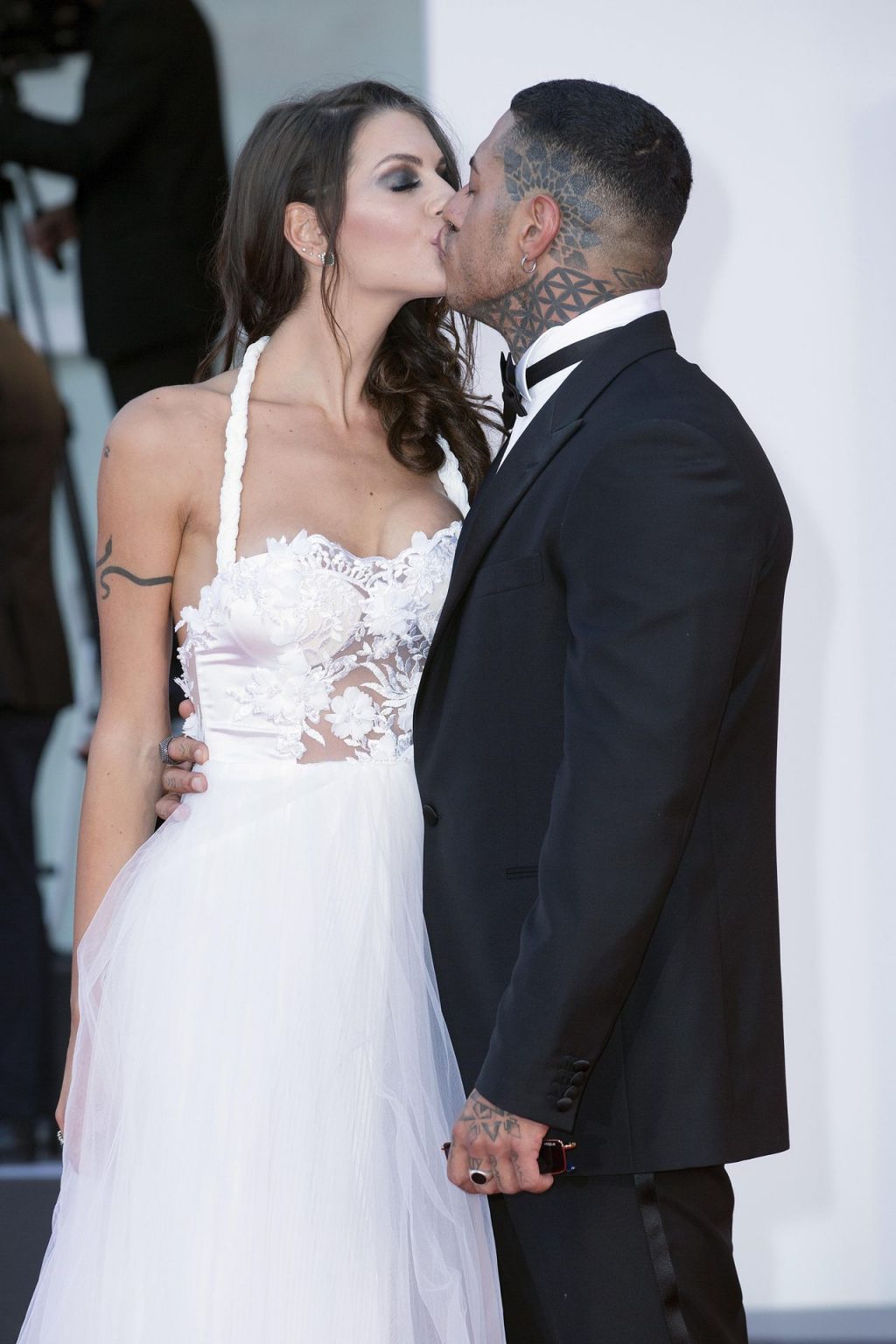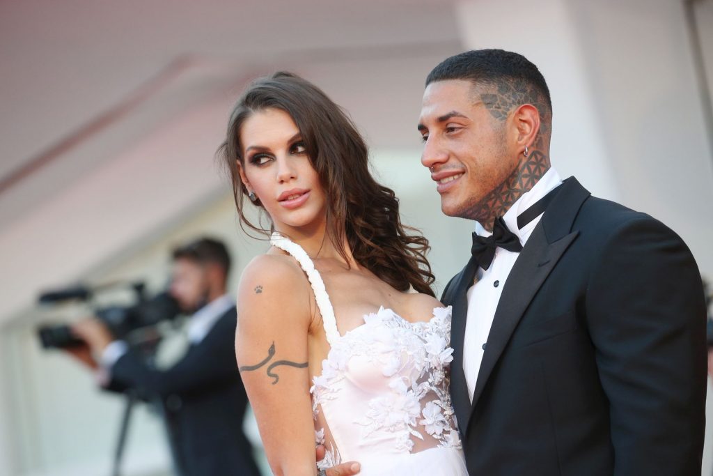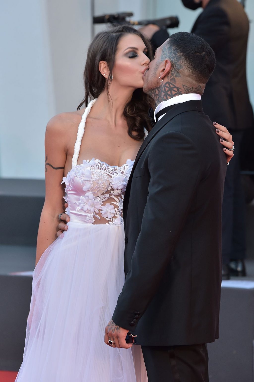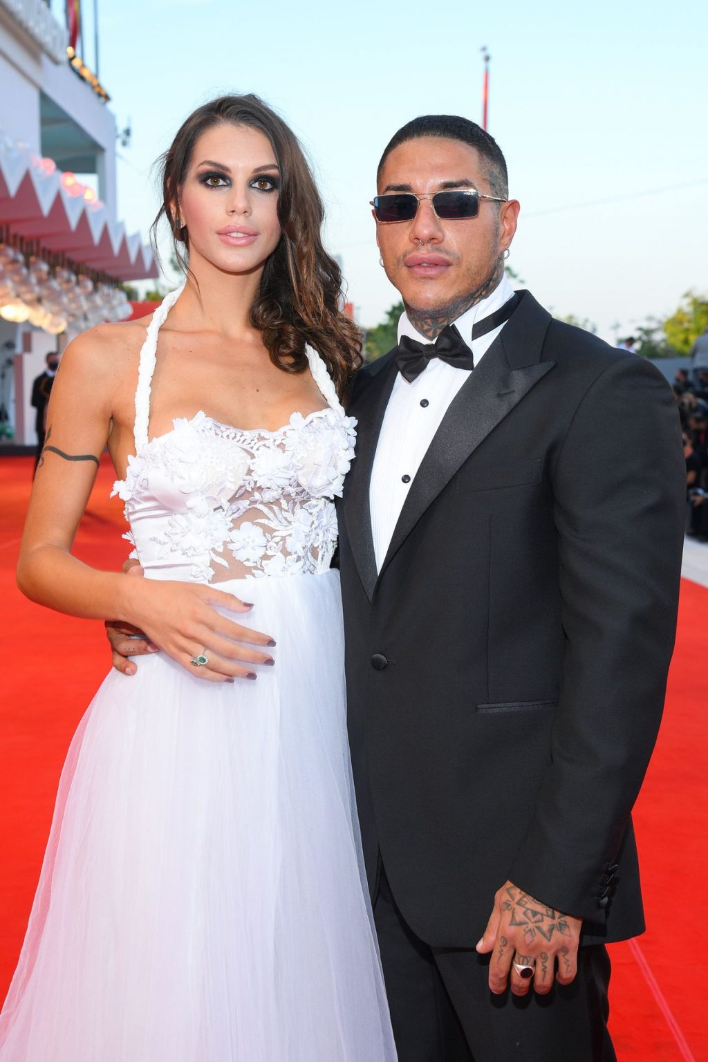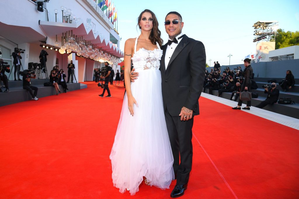 Sexy modelo italiana Antonella Fiordelisi muestra su escote posando con un vestido blanco en la alfombra roja antes de la película “Le Sorelle Macaluso” en el 77º Festival de Cine de Venecia en Venecia, 09/09/2020.