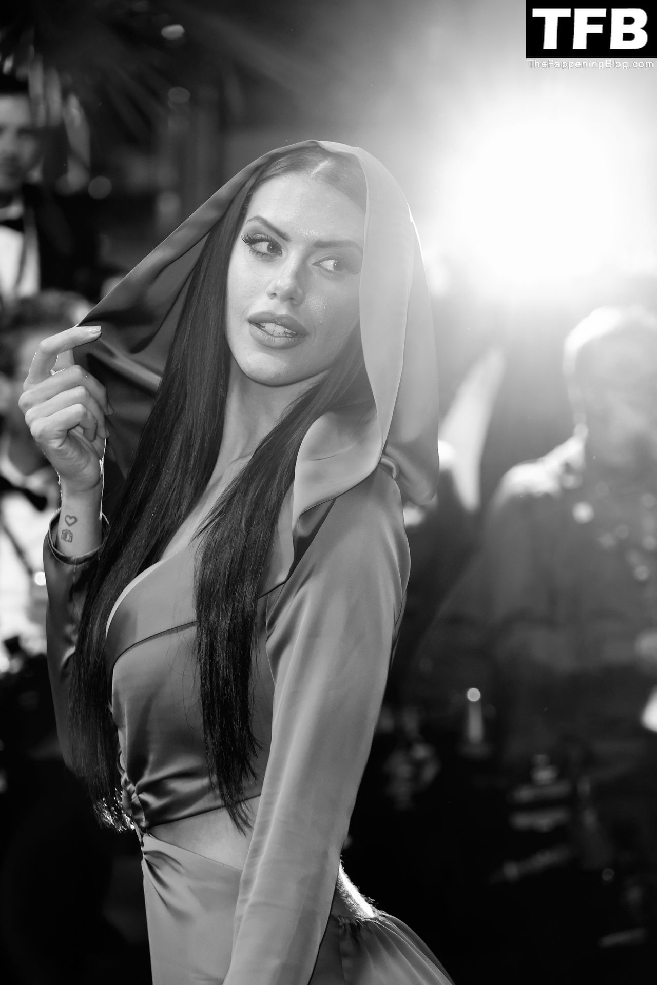 La modelo italiana Antonella Fiordelisi tiene un fallo de vestuario mientras posa con un vestido azul en la alfombra roja de “Nostalgia” durante el 75º Festival de Cine de Cannes, 24/05/2022.