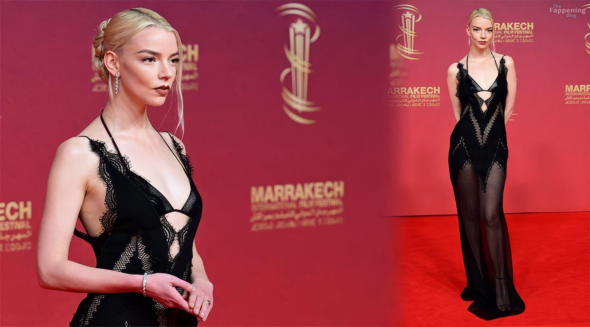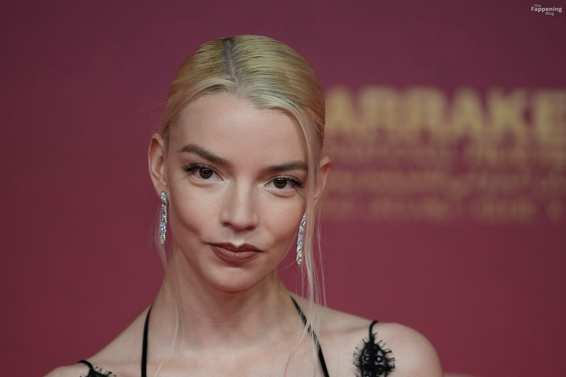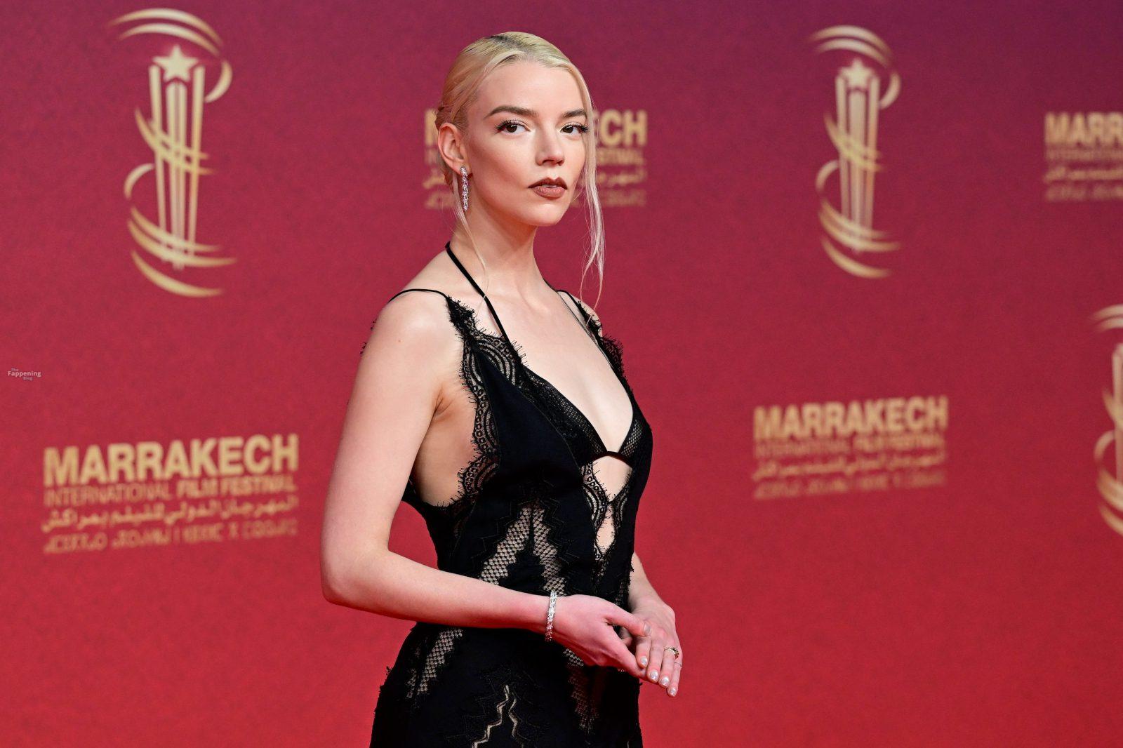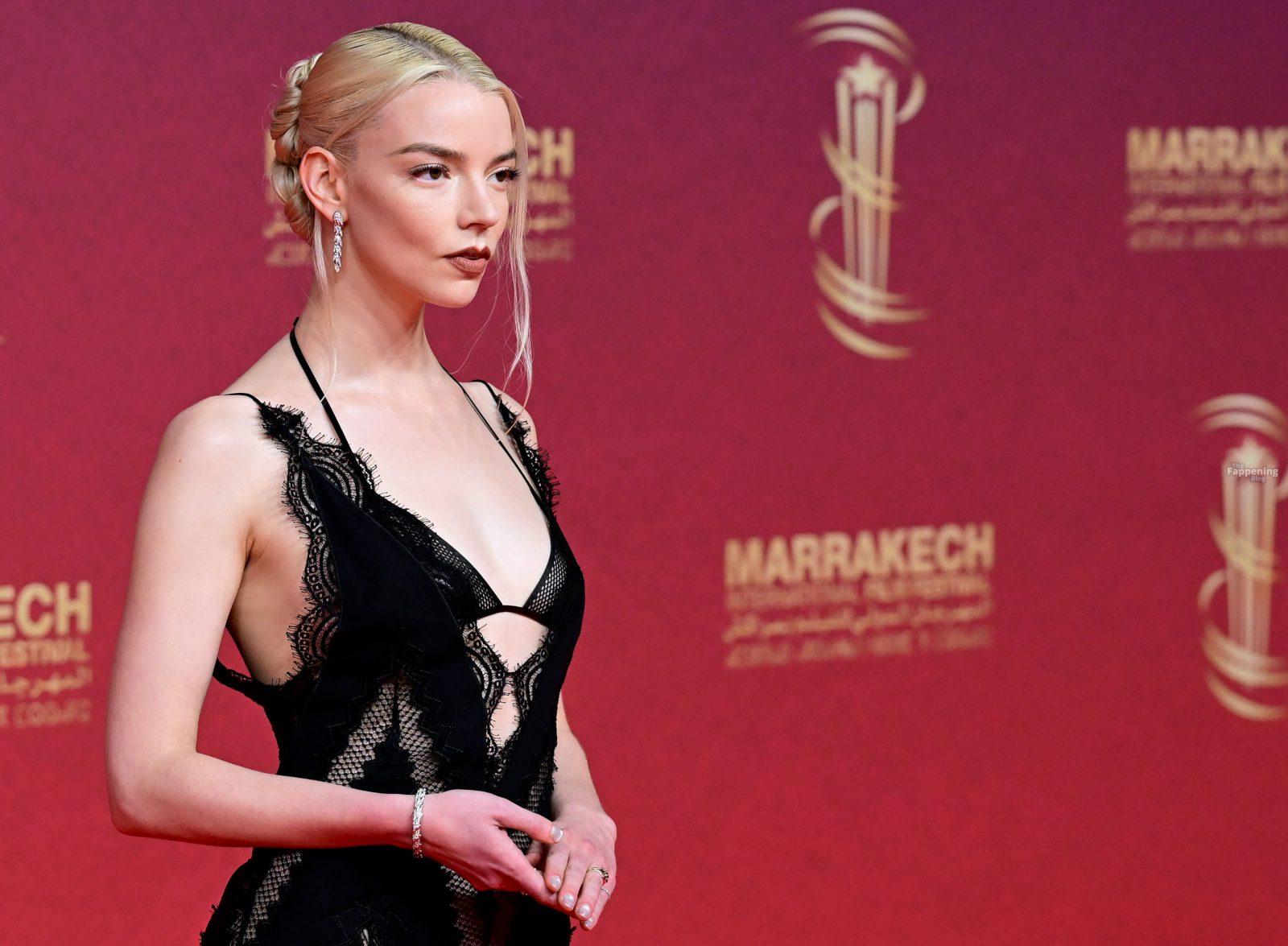 La actriz estadounidense Anya Taylor-Joy posa con un vestido de encaje transparente que muestra sus piernas en la alfombra roja mientras llega a la ceremonia de clausura del 22º Festival de Cine de Marrakech (FIFM) en Marrakech.
