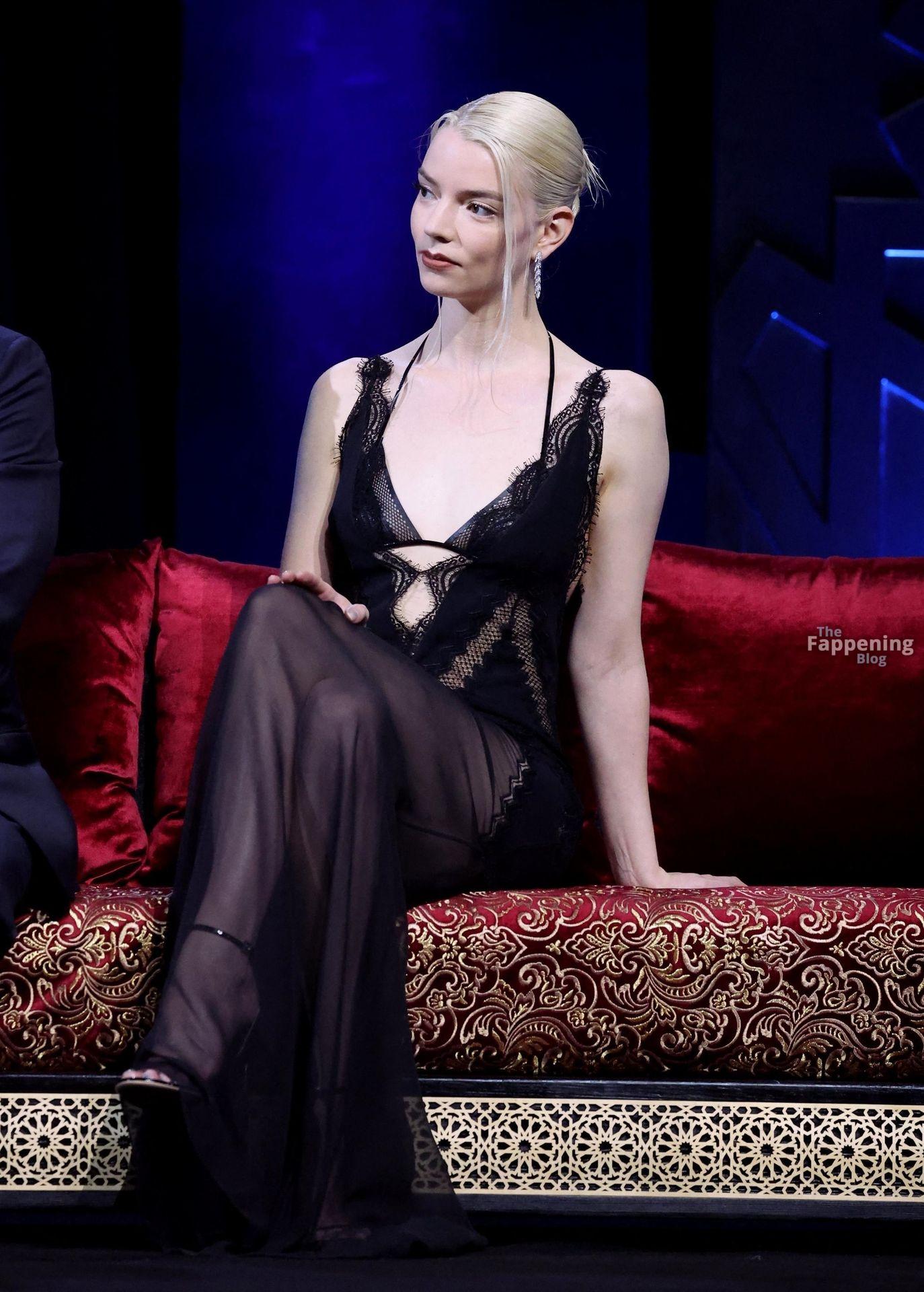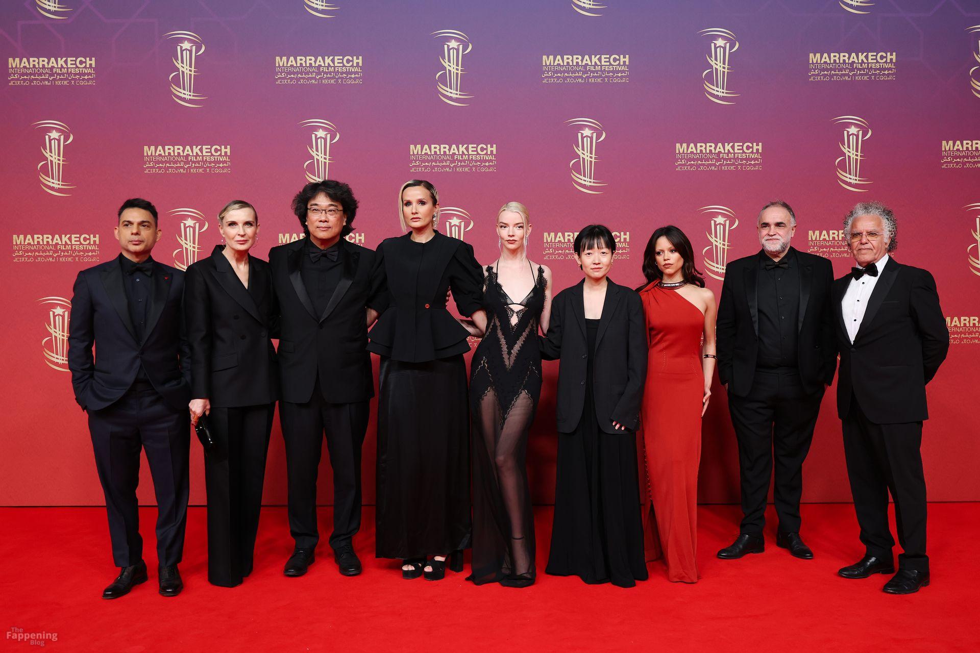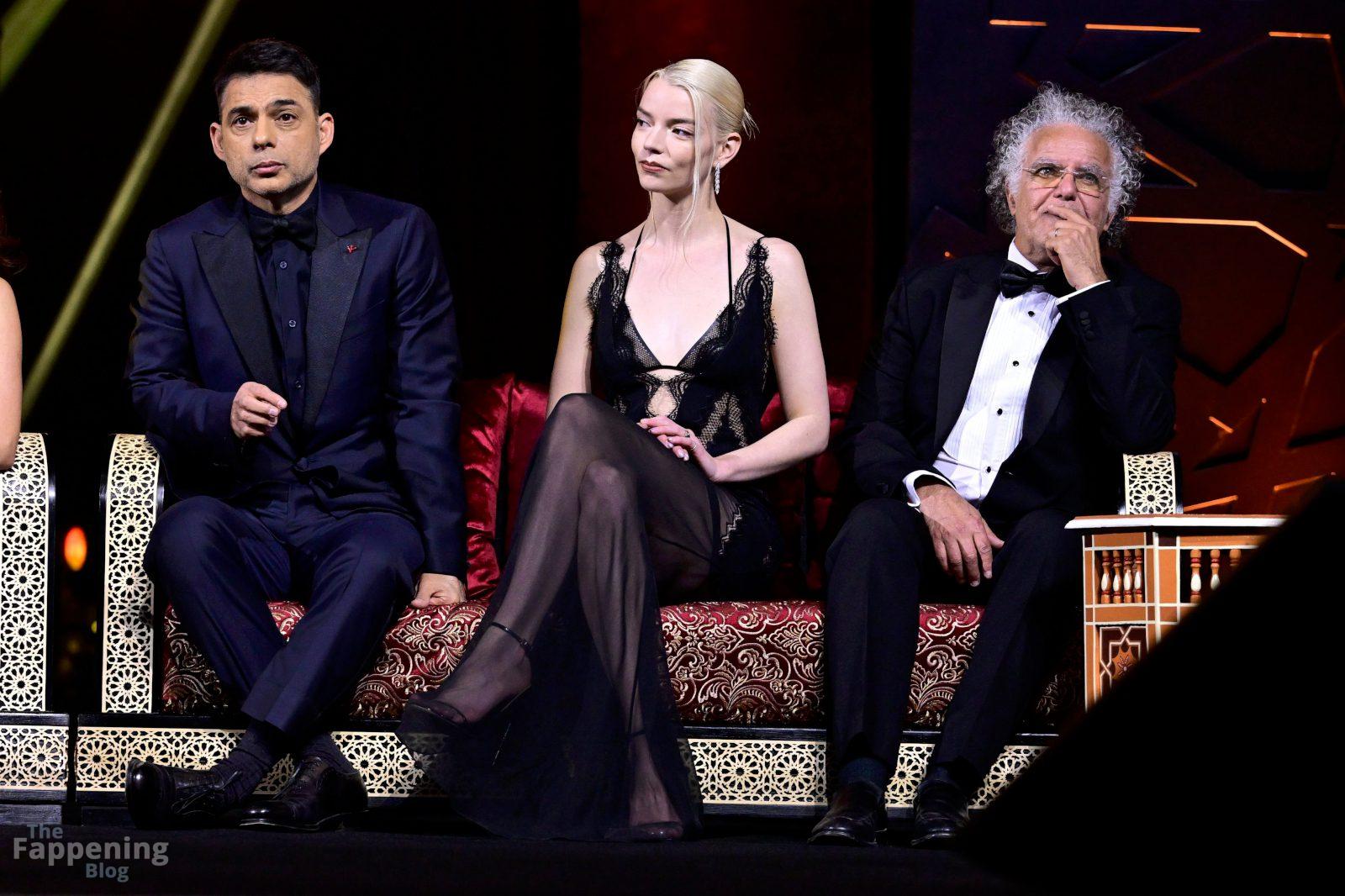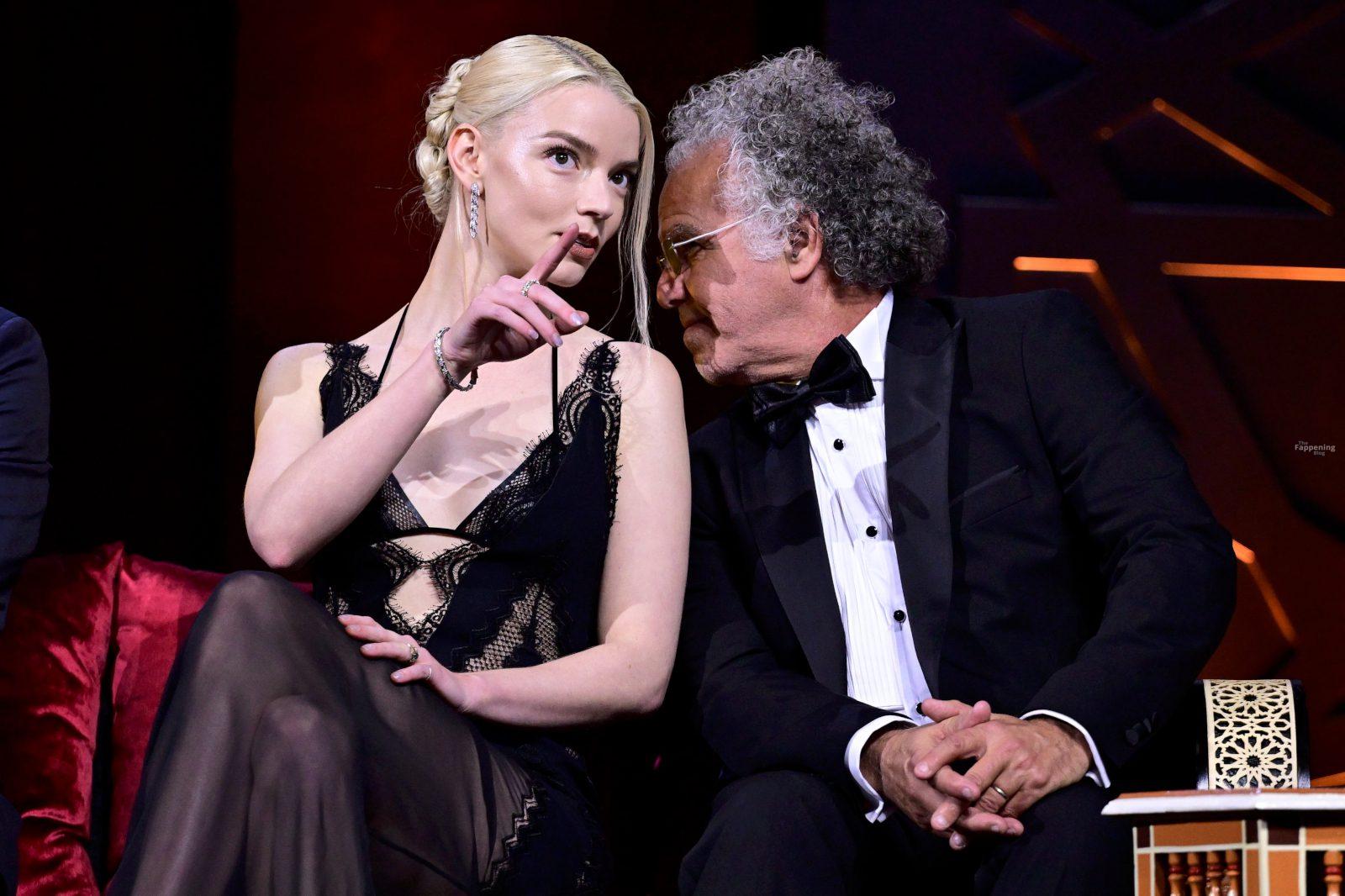 La actriz estadounidense Anya Taylor-Joy posa con un vestido de encaje transparente que muestra sus piernas en la alfombra roja mientras llega a la ceremonia de clausura del 22º Festival de Cine de Marrakech (FIFM) en Marrakech.