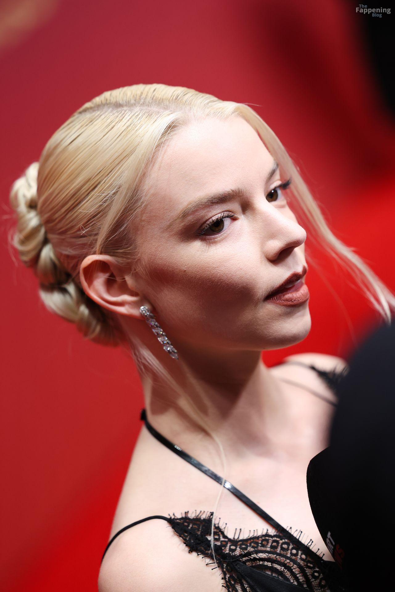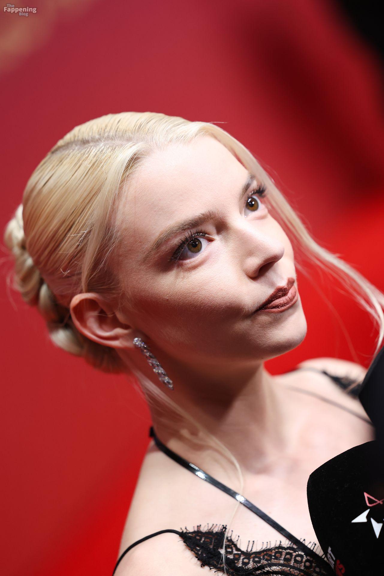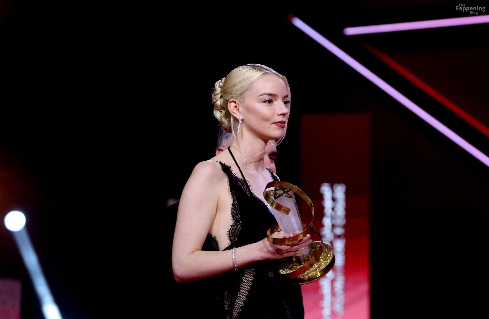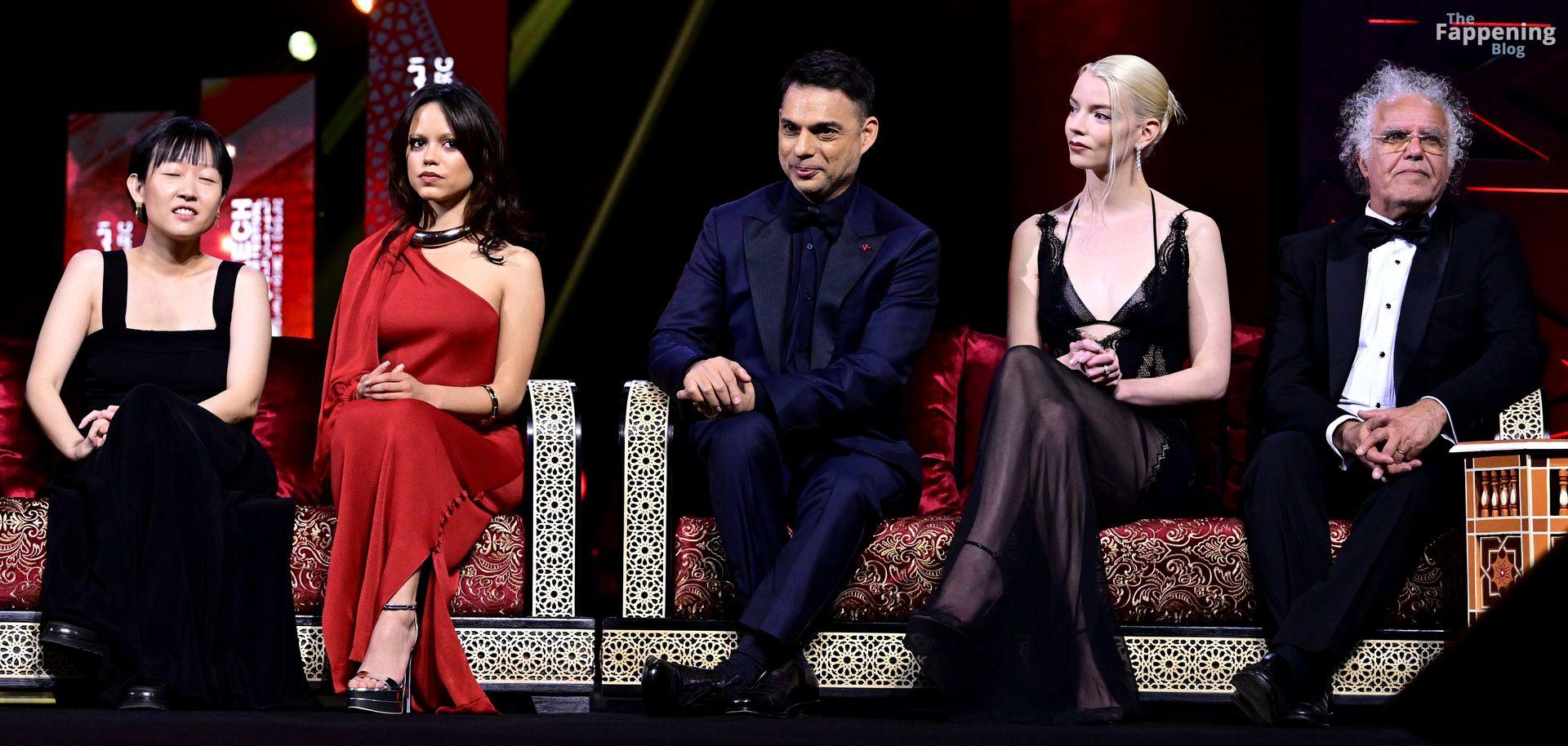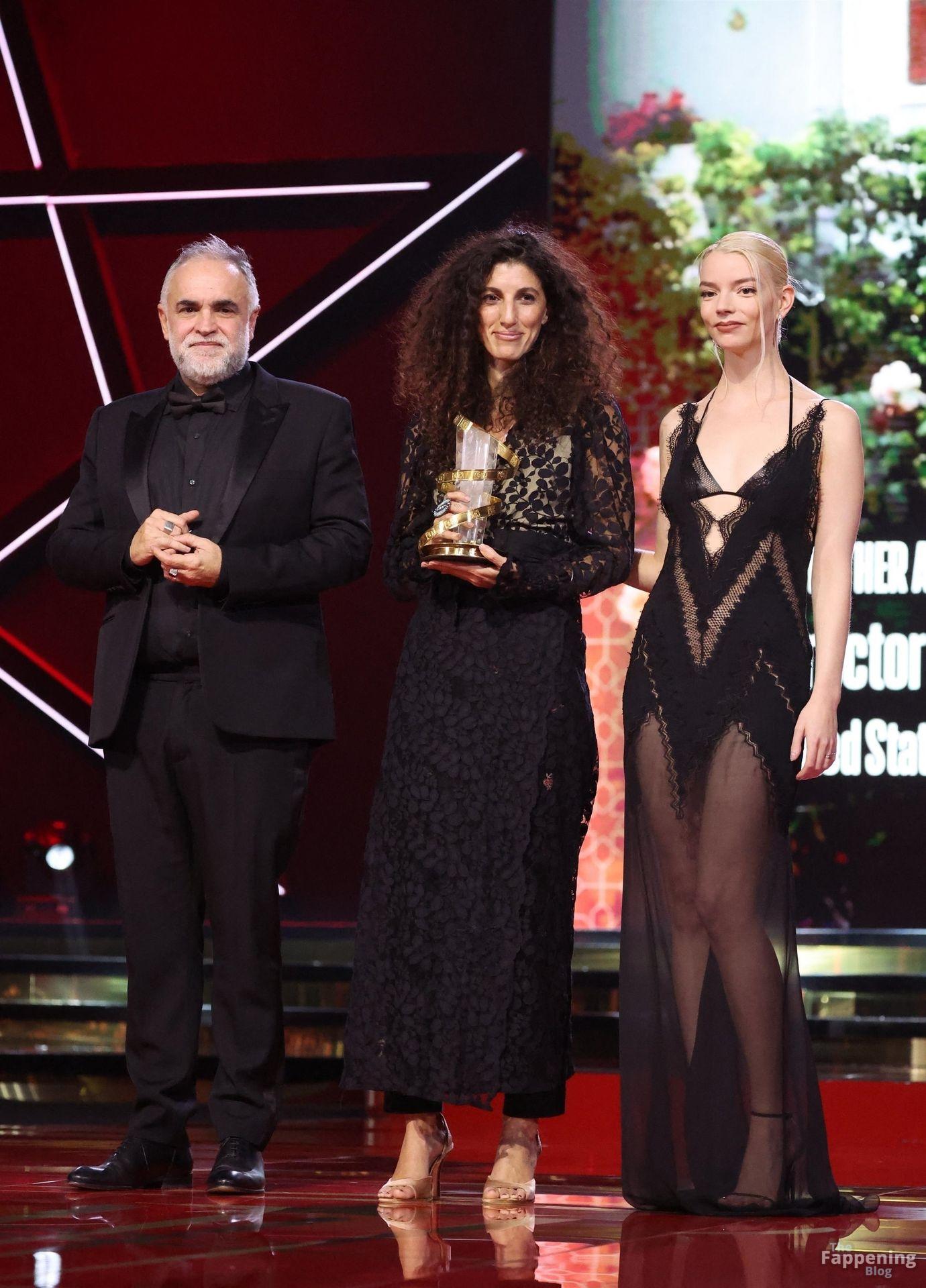 La actriz estadounidense Anya Taylor-Joy posa con un vestido de encaje transparente que muestra sus piernas en la alfombra roja mientras llega a la ceremonia de clausura del 22º Festival de Cine de Marrakech (FIFM) en Marrakech.
