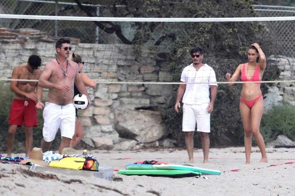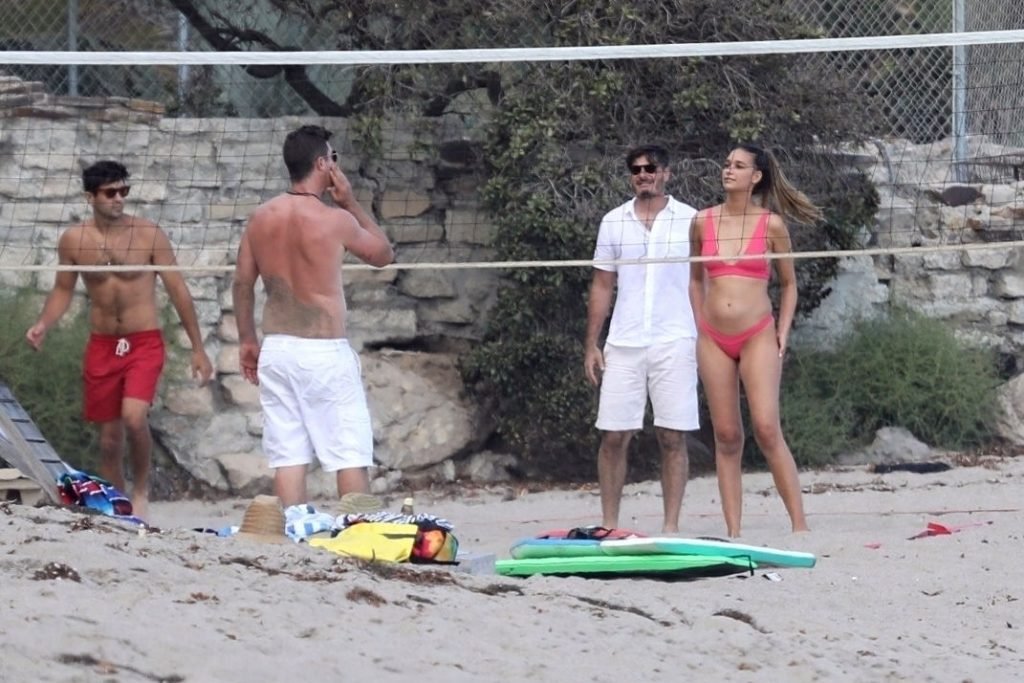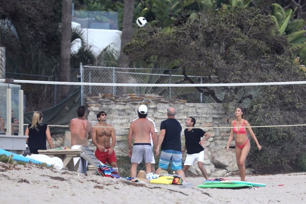 Robin Thicke y su novia April Love Geary (23) disfrutan de un juego de voleibol de playa con amigos. April muestra un cuerpo sexy mientras la pareja bromea y ríe con amigos durante el juego.