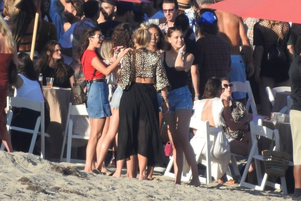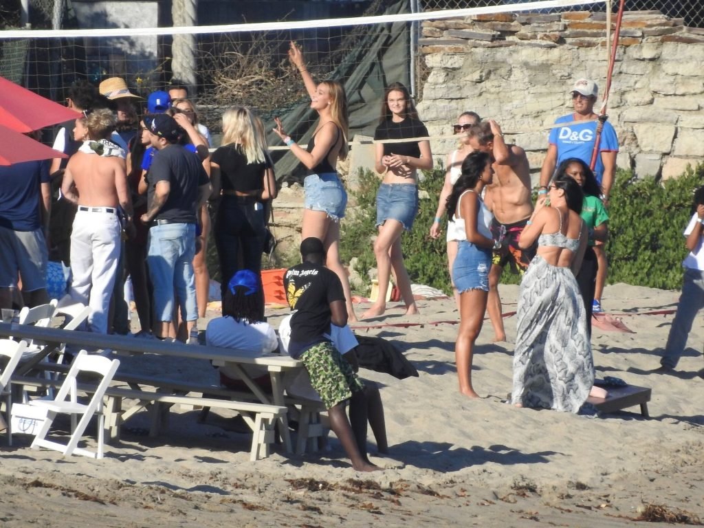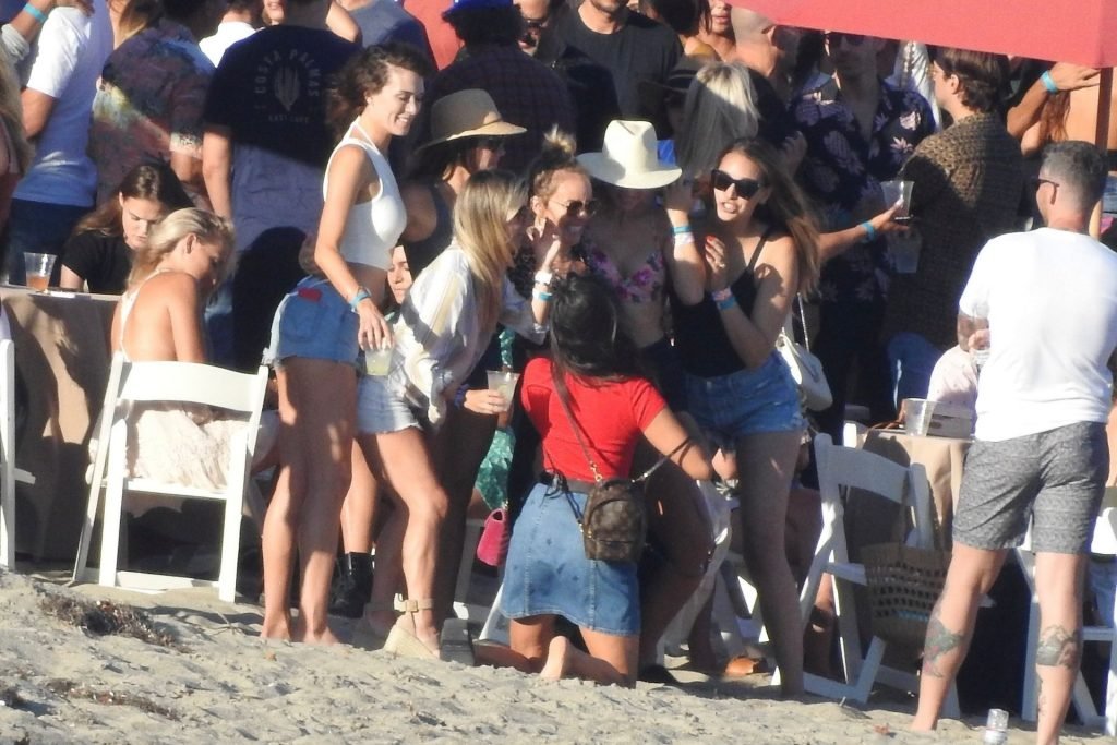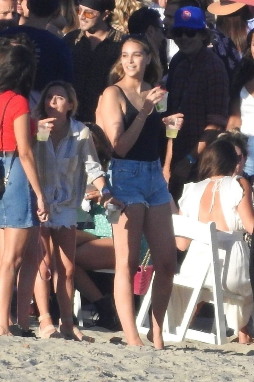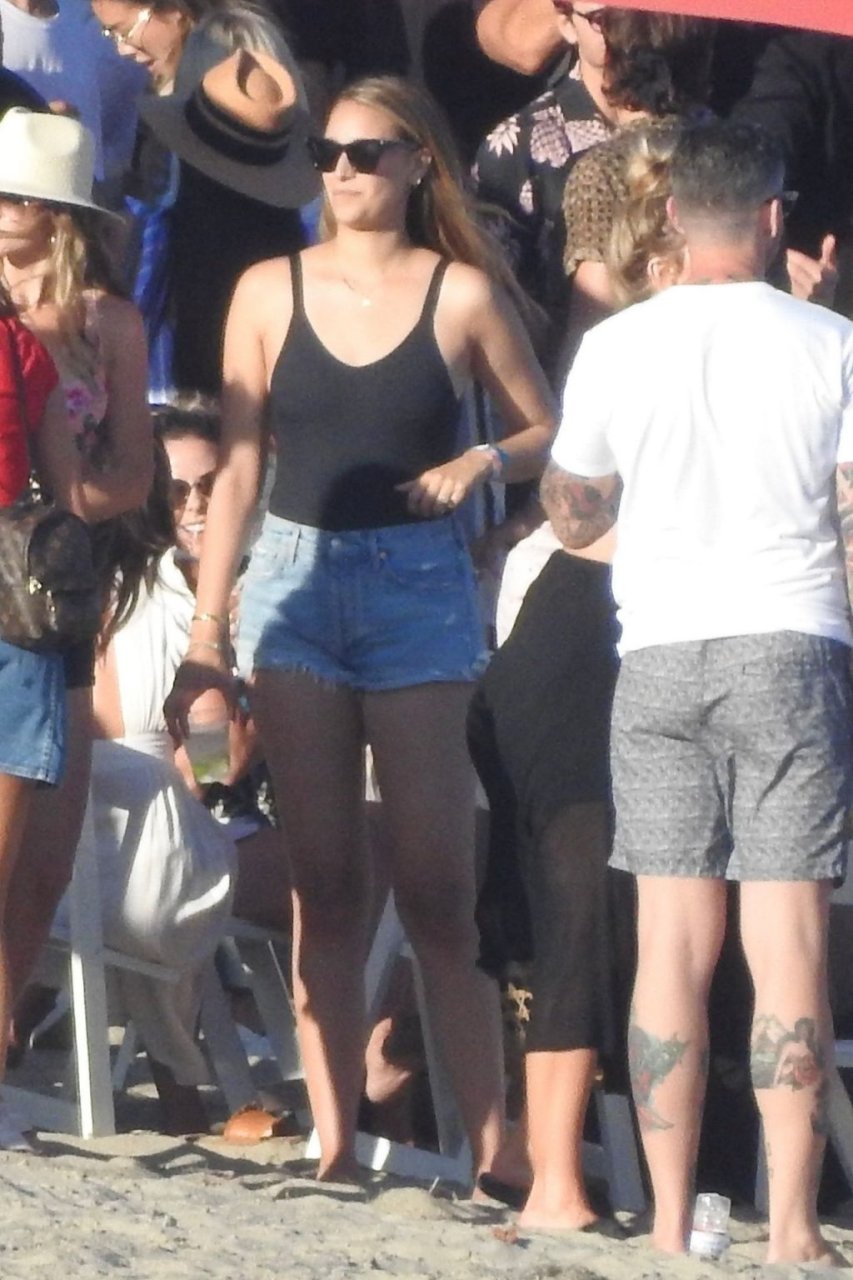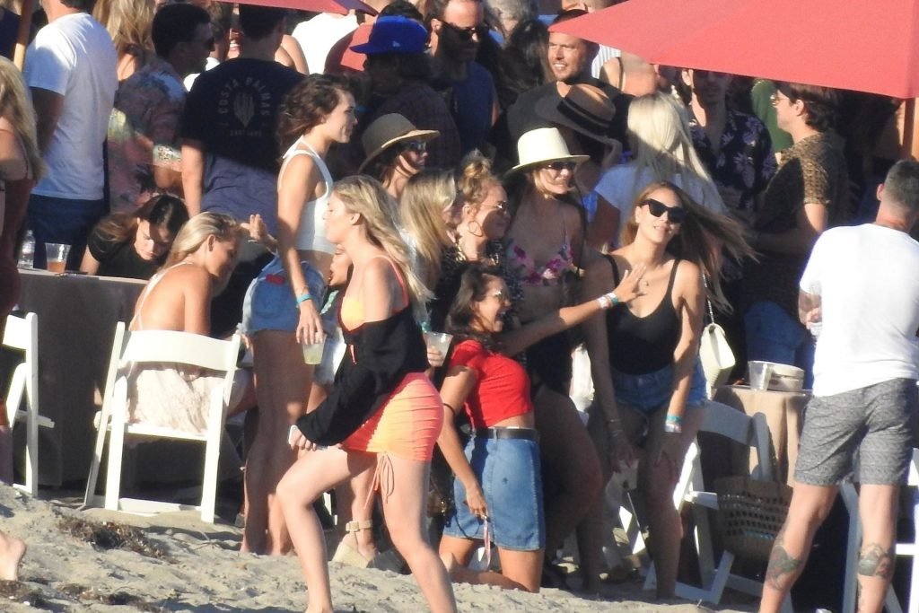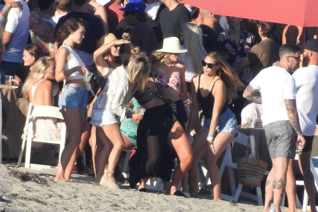 April Love Geary asiste a una fiesta en la playa en Malibu donde Jamie Foxx y Sean Penn también son invitados, 25/08/2019. La modelo llegó con algunas amigas y se la pudo ver disfrutando de una bebida fría en la playa.