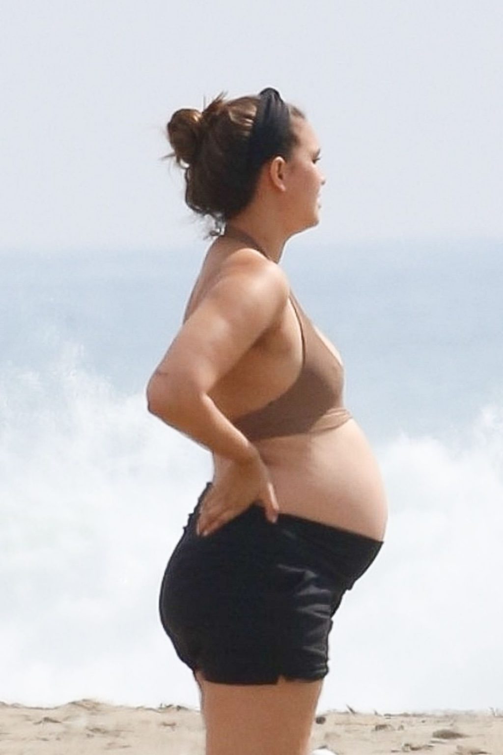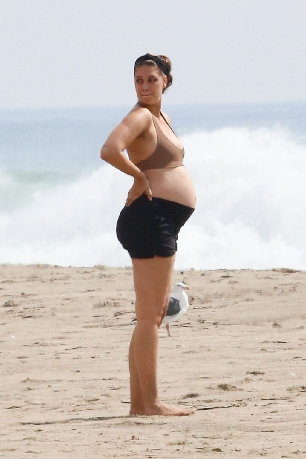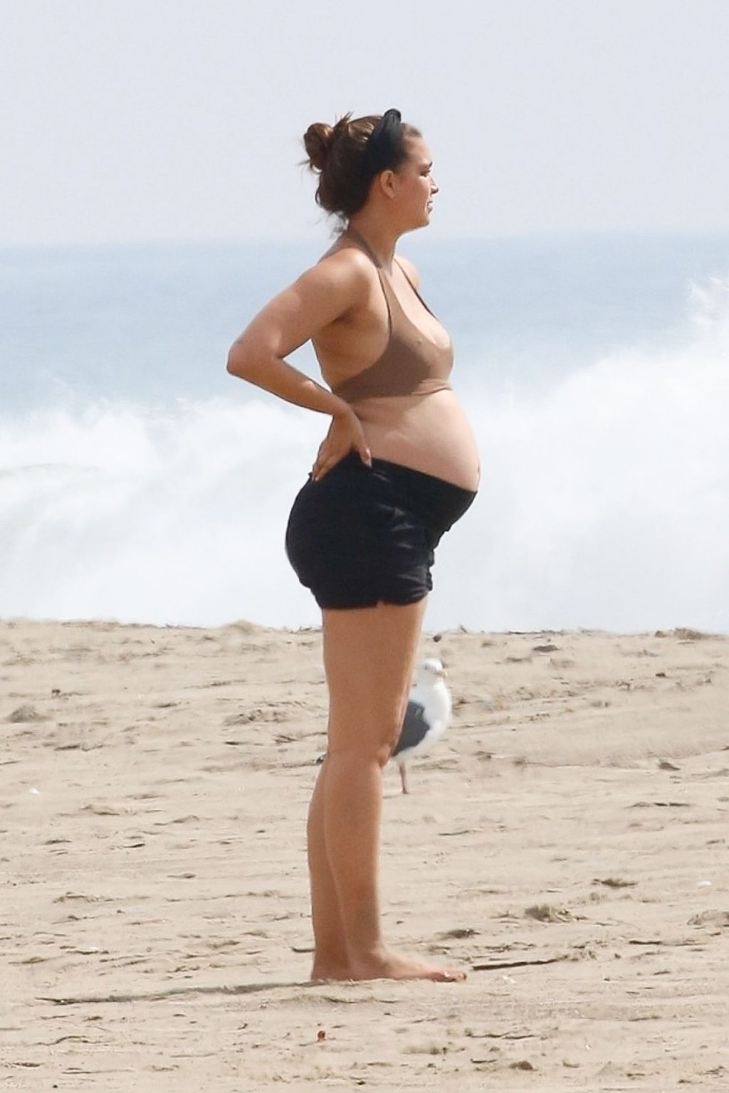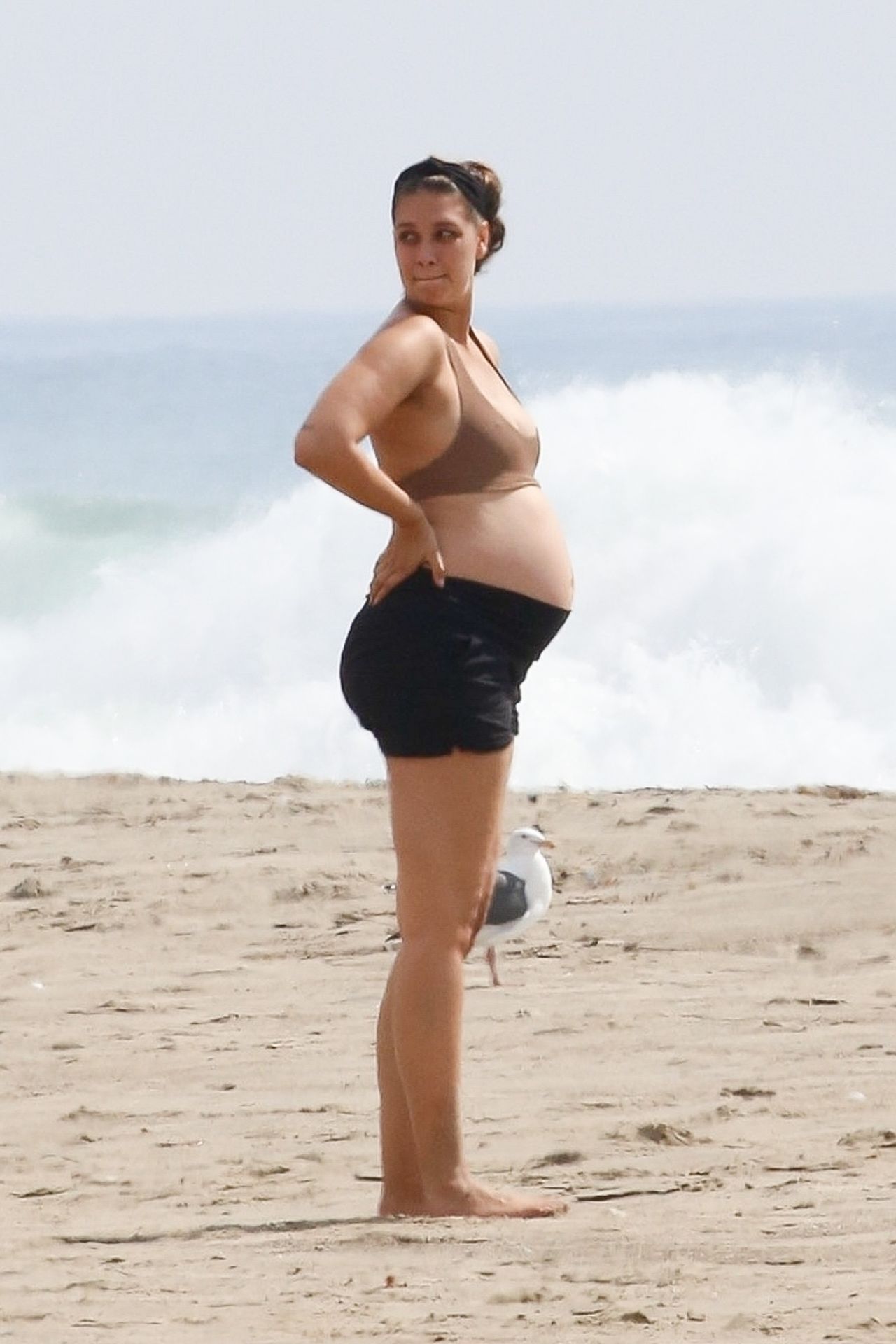 April Love Geary, embarazada, muestra su creciente barriga mientras disfruta de un día en la playa con su esposo Robin Thicke en Malibu, 05/10/2020.