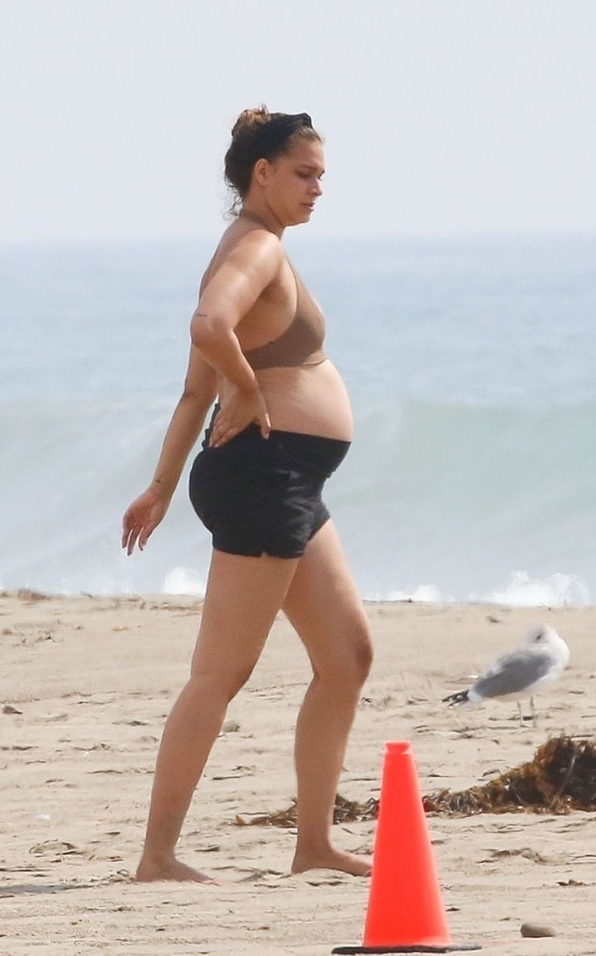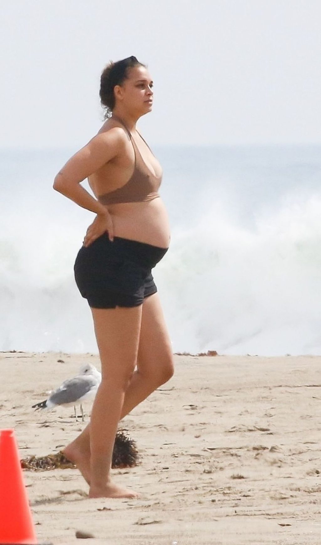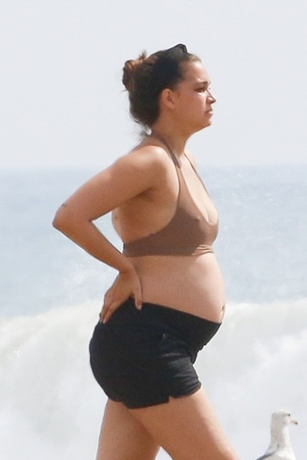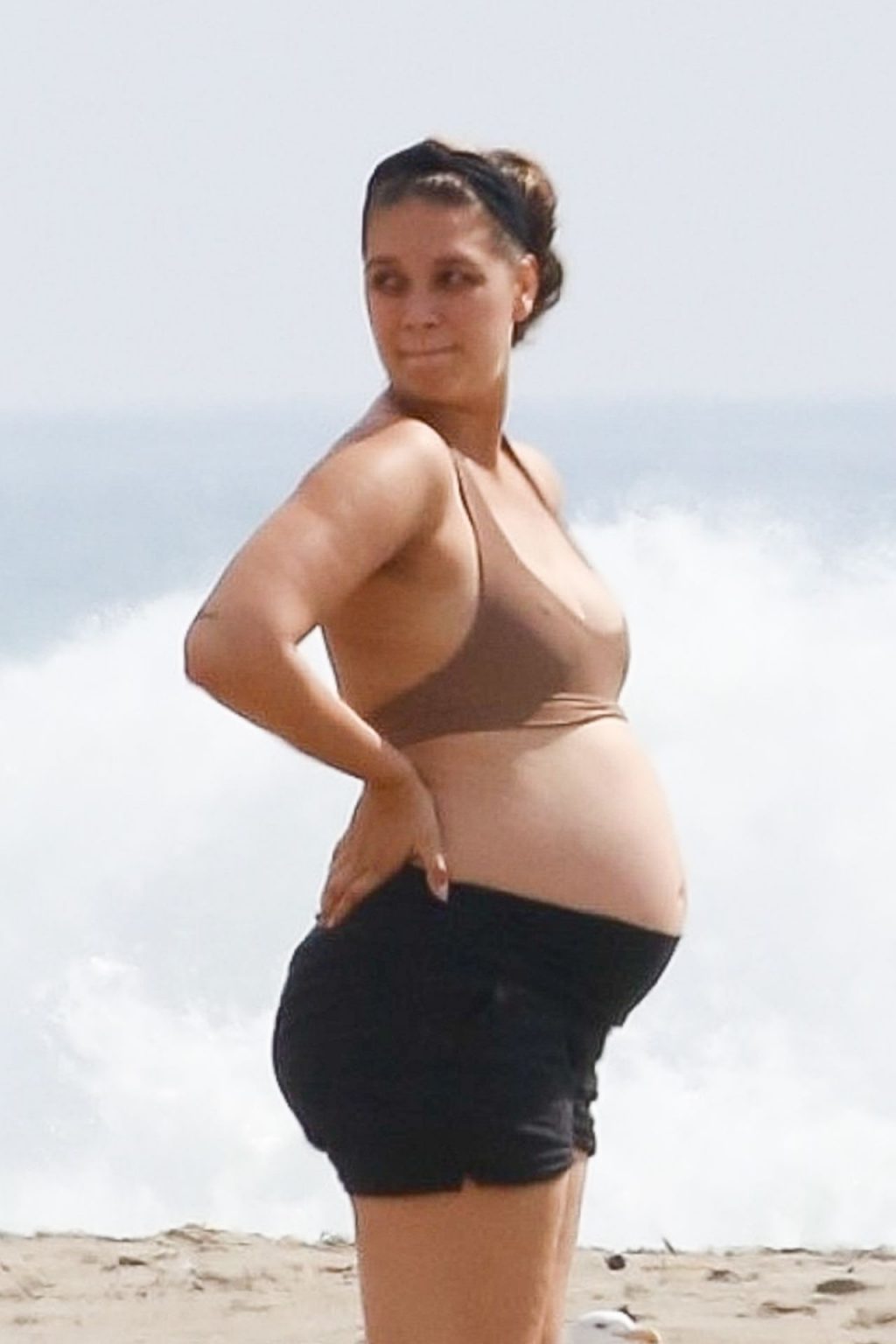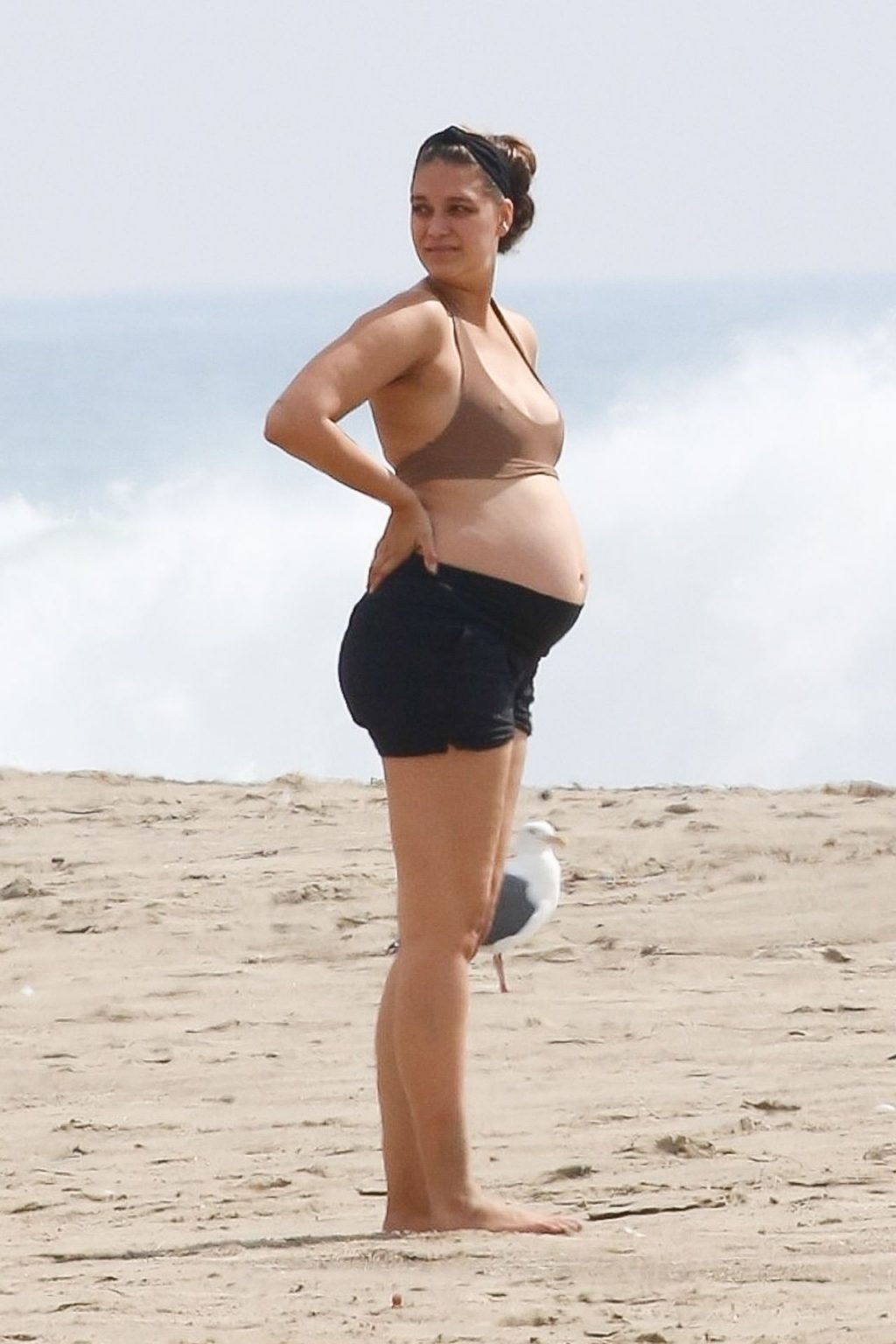 April Love Geary, embarazada, muestra su creciente barriga mientras disfruta de un día en la playa con su esposo Robin Thicke en Malibu, 05/10/2020.